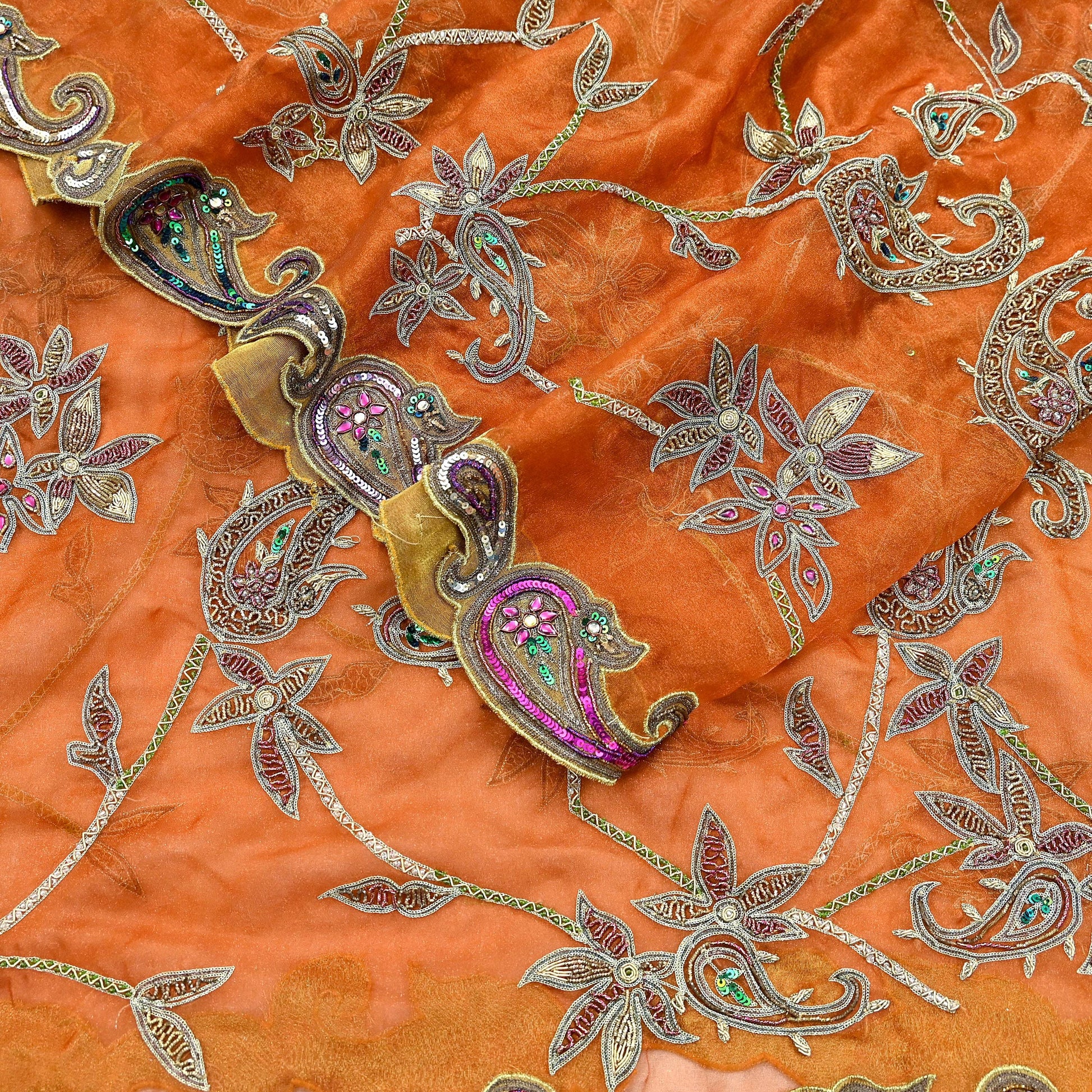 Indian Vintage wedding Heavy Orange Dupatta Tissue Silk Long Stole Hand Embroidered Scarf Zari Zardozi/Dabka
