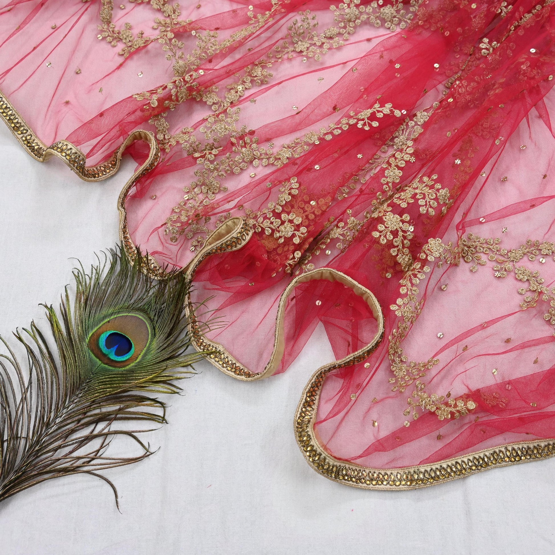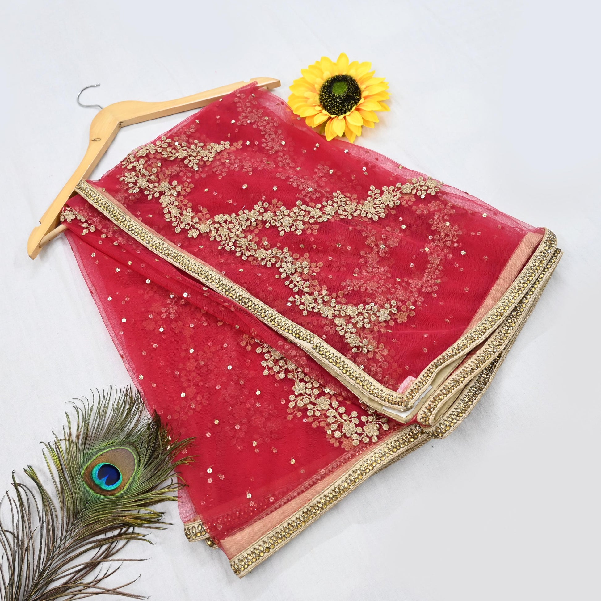 Pre-Owned Designer Abu Jani Hand Embroidered Golden Red Chanderi Silk Net Bridal Lehenga Set with Dupatta & Blouse Couture Outfit