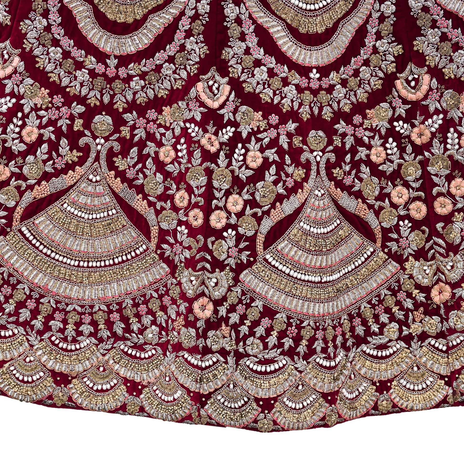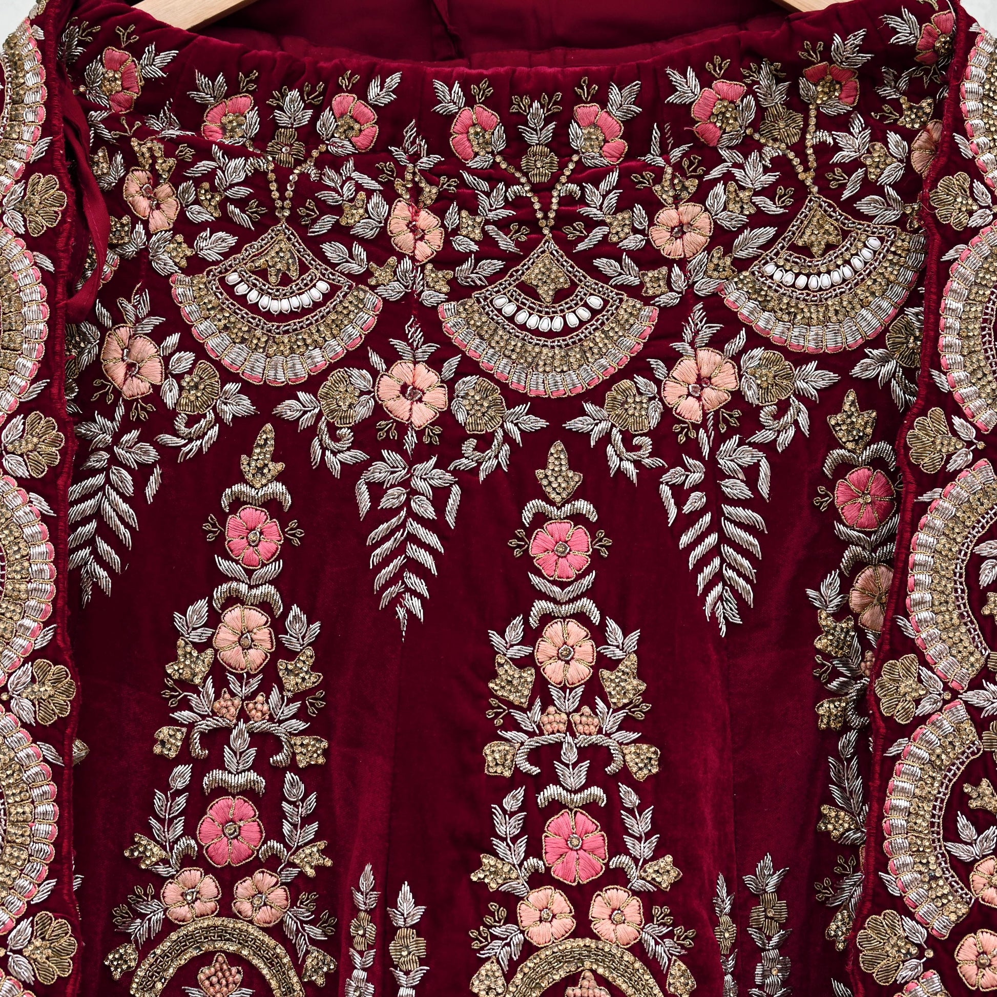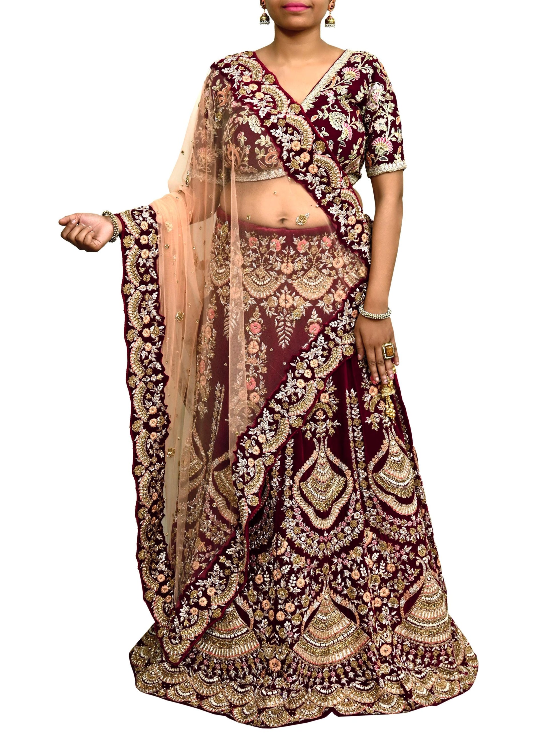 Pre-Owned Designer Anamika Khanna Hand Embroidered Lehenga & Dupatta Set Maroon Velvet Skirt with Peach Net Dupatta