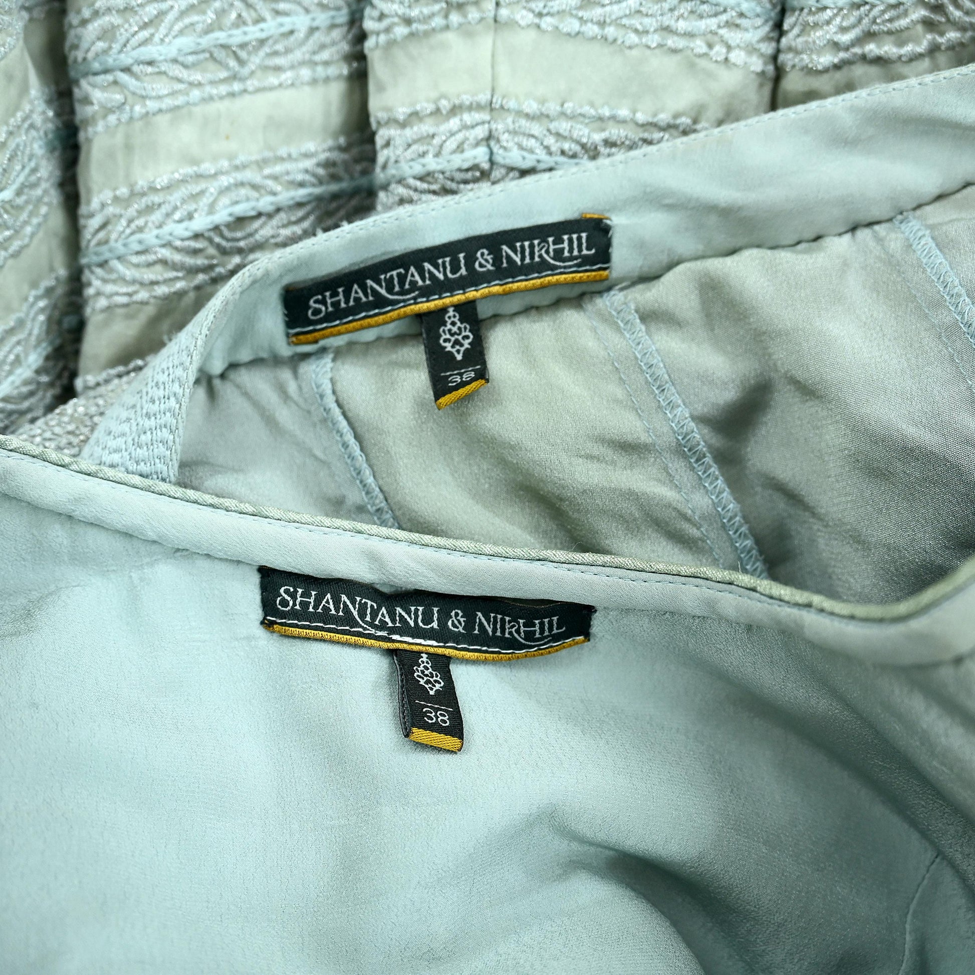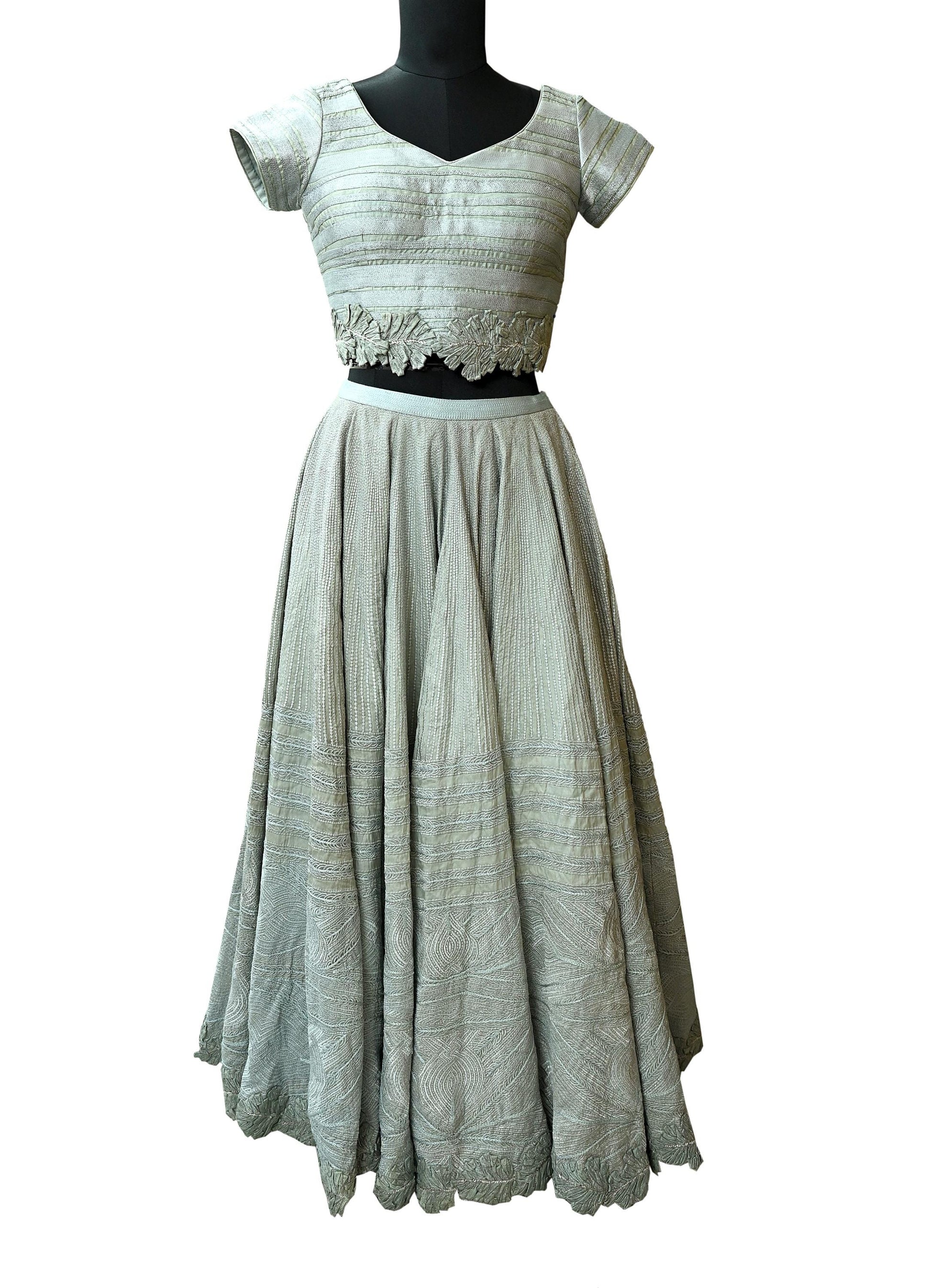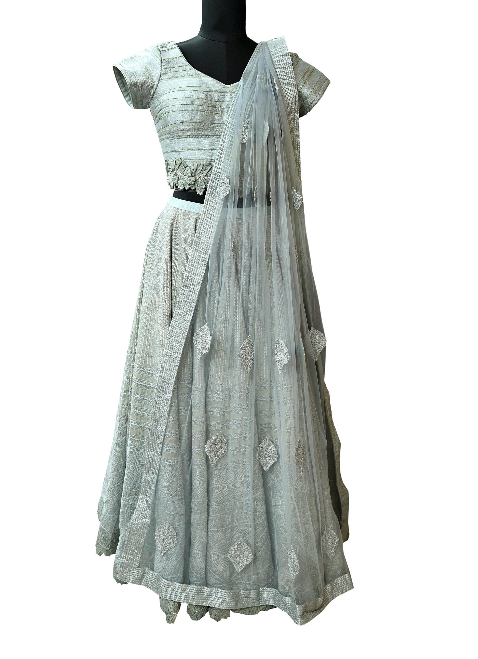 Pre-owned Heavy Green Gray Chanderi Silk/Net Hand Embroidered Lehenga 3pcs Set By Designer Shantanu & Nikhil Bridal Wear Padded Blouse