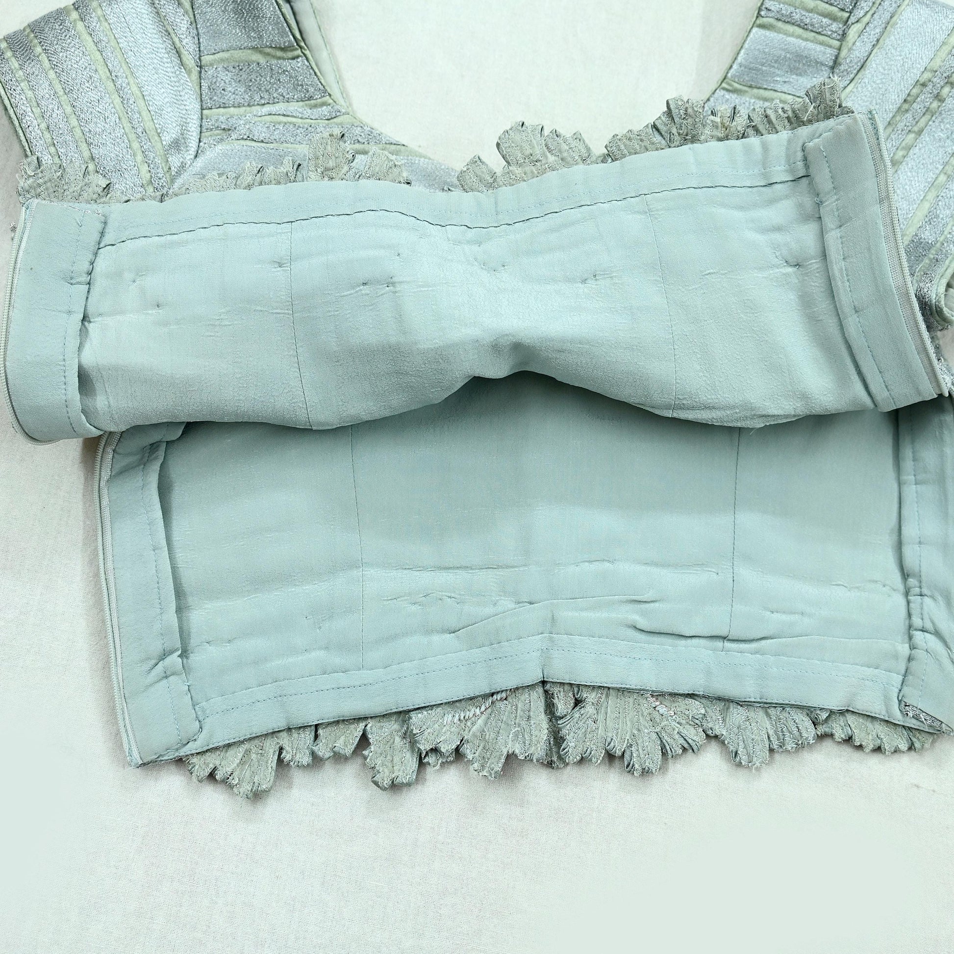 The unique combination of silver zari work, hand embroidery, and premium fabrics on a muted gray-green palette makes this a rare designer piece. The intricate dupatta border, the graceful fall of the skirt, and refined blouse structure come together to create a truly one-of-a-kind outfit—perfect for weddings, receptions, or high-end ethnic events.