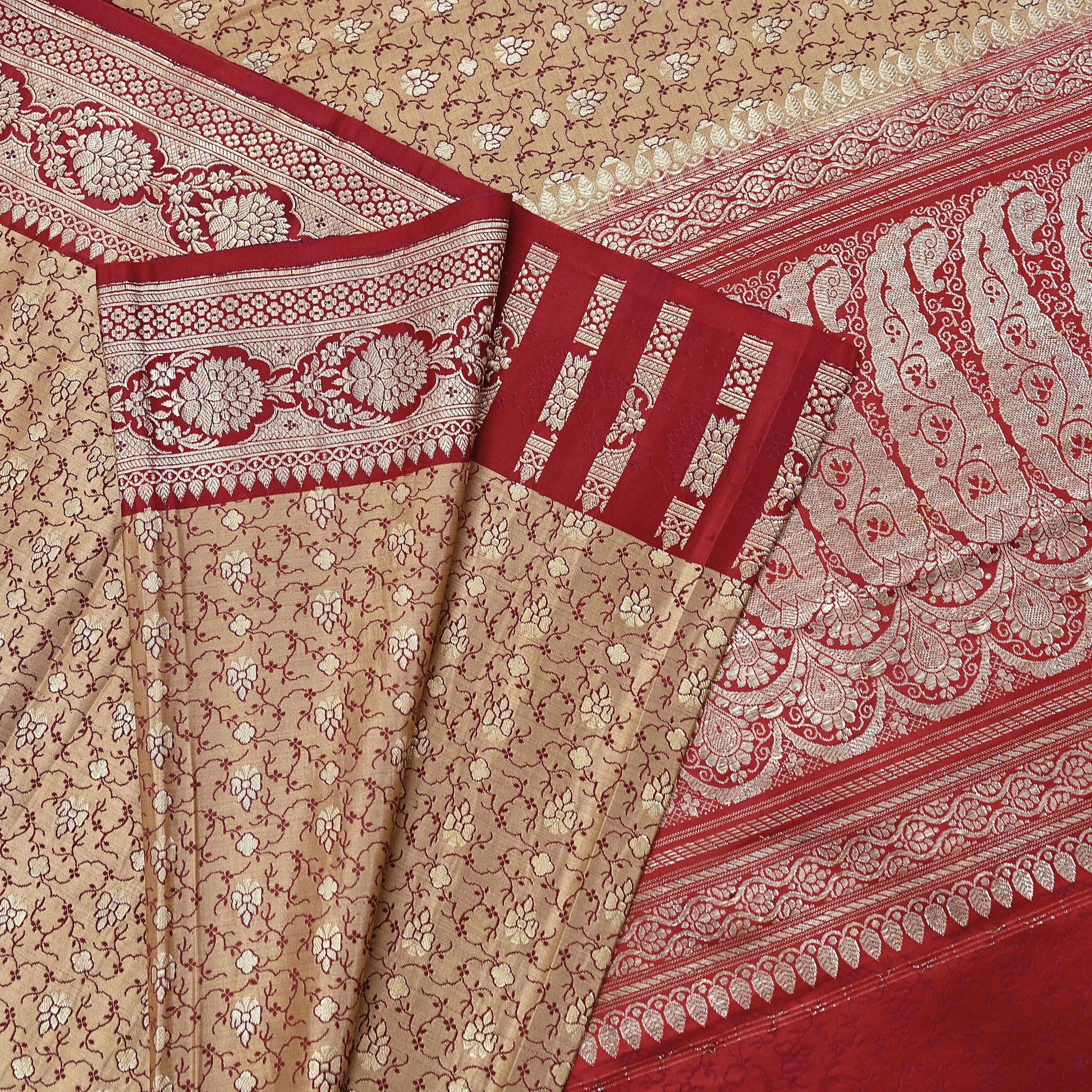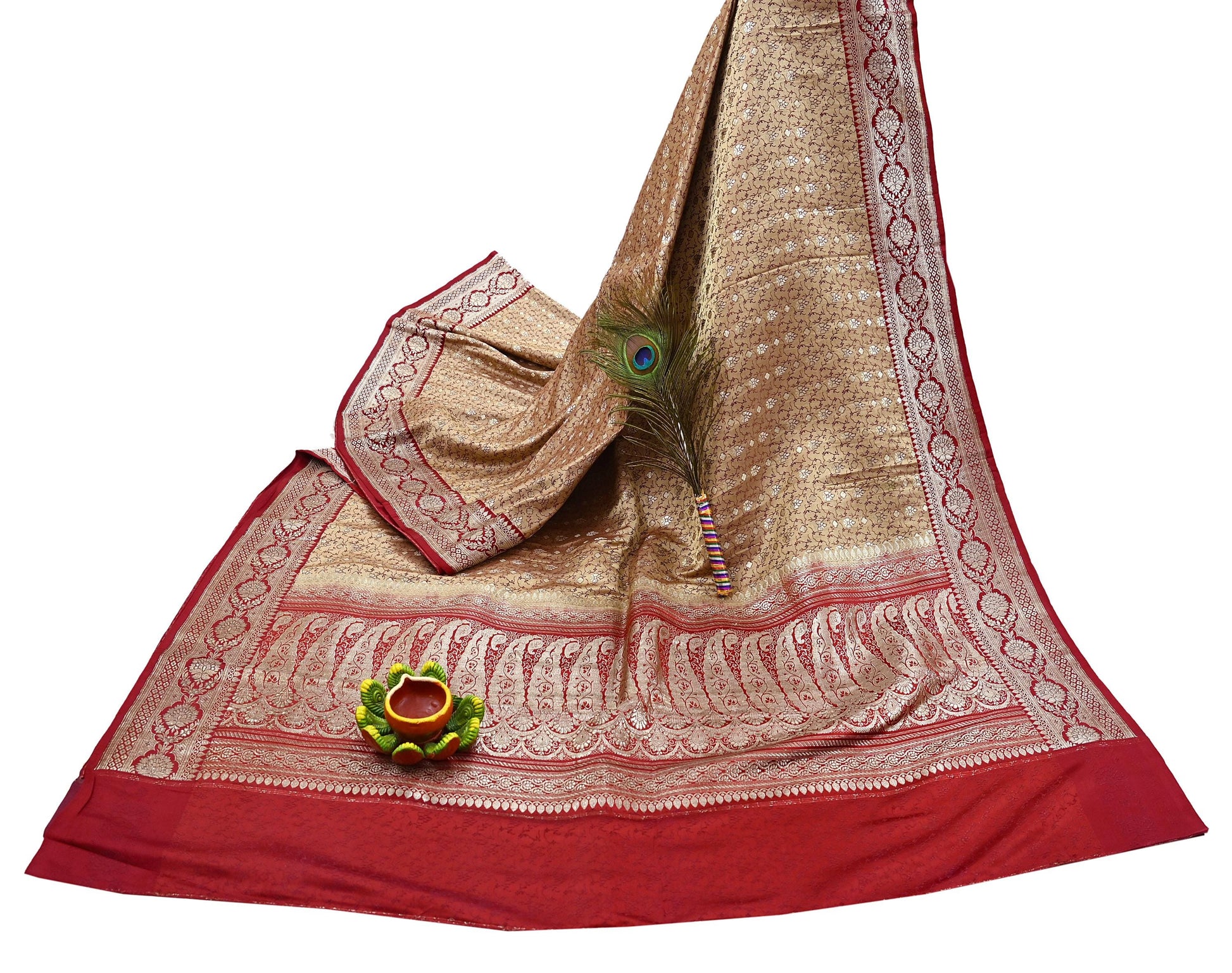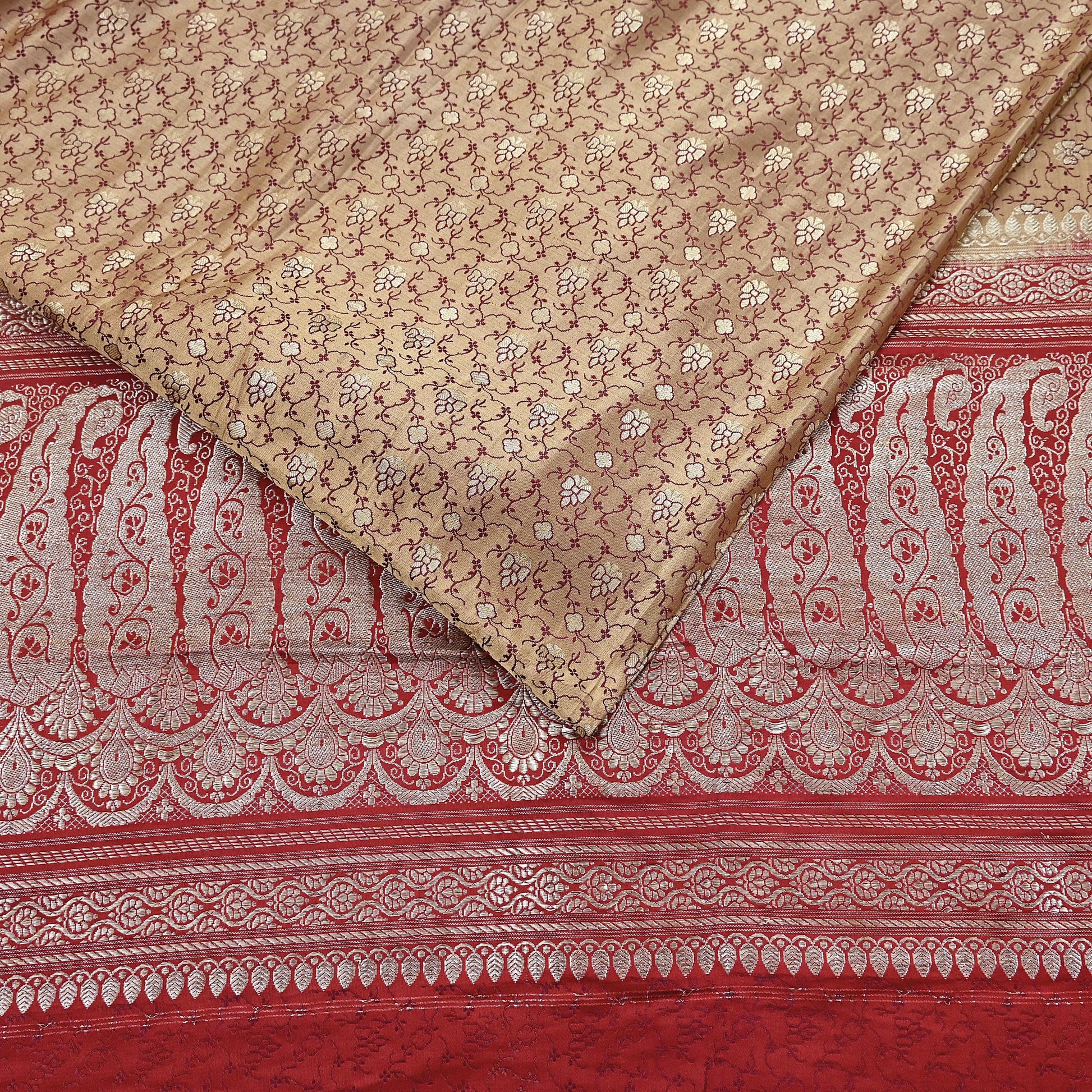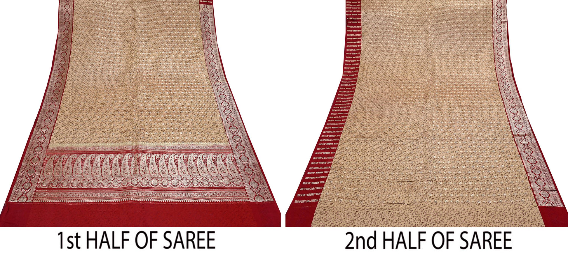 Vintage Banarasi Saree Pure Satin Silk Woven Brocade Zari Fabric Beige & Red Heavy Craft Sari 5 Yards Indian Antique Textile Dress Making