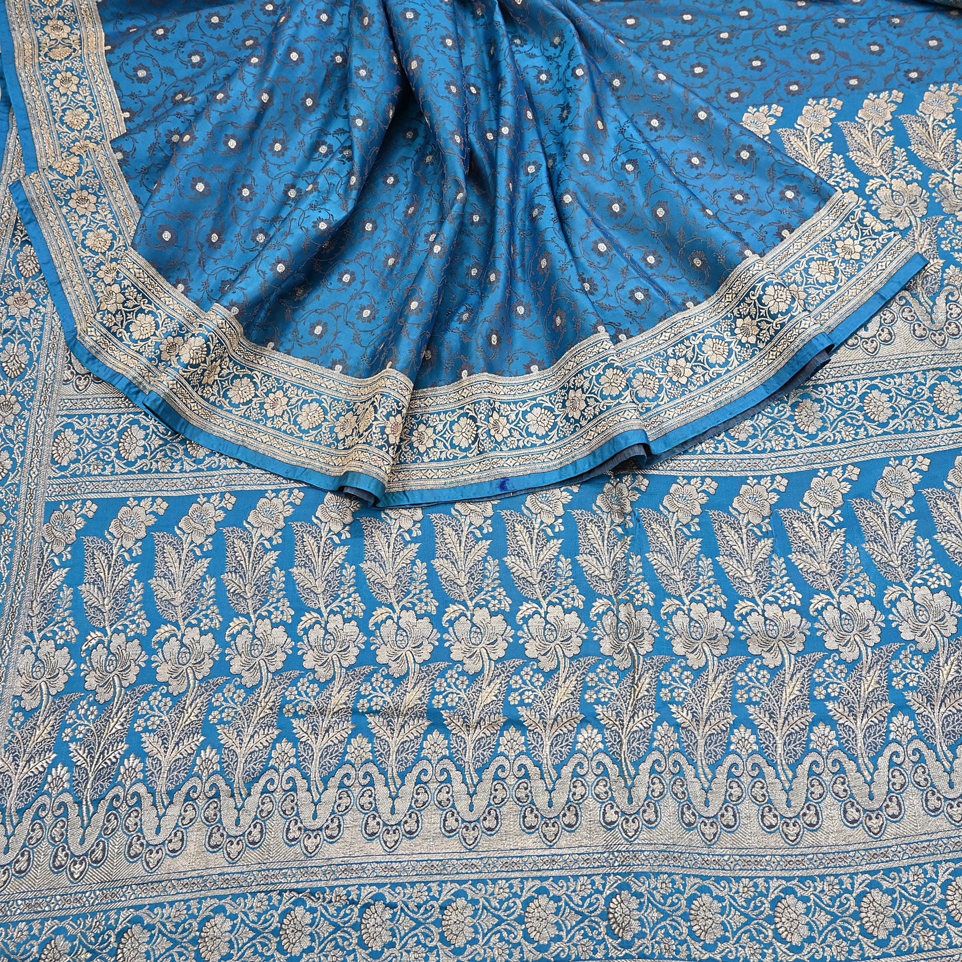 Vintage Banarasi Saree Pure Satin Silk Woven Brocade Zari Fabric Blue Heavy Craft Sari 5 Yards Indian Antique Textile Dress Making