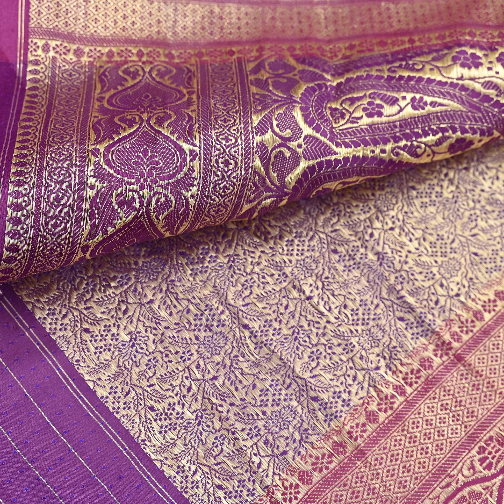 Elevate your creativity and elegance with this Vintage Pink & Purple Banarasi Pure Satin Silk Saree, a breathtaking piece of India’s weaving heritage. Handwoven with precision, this saree features luxurious golden zari work on rich satin silk, creating a masterpiece perfect for fashion design, décor, or collectible art.