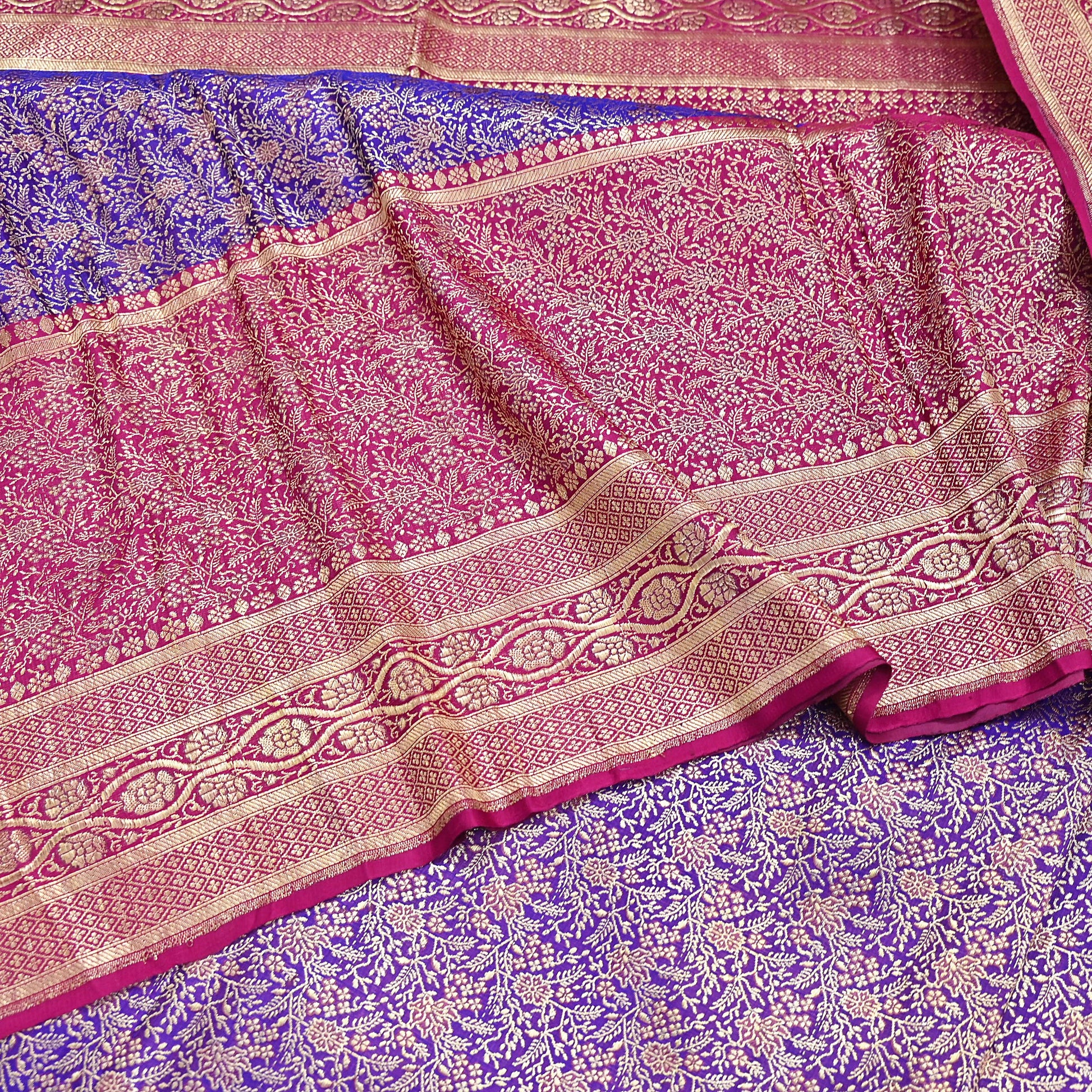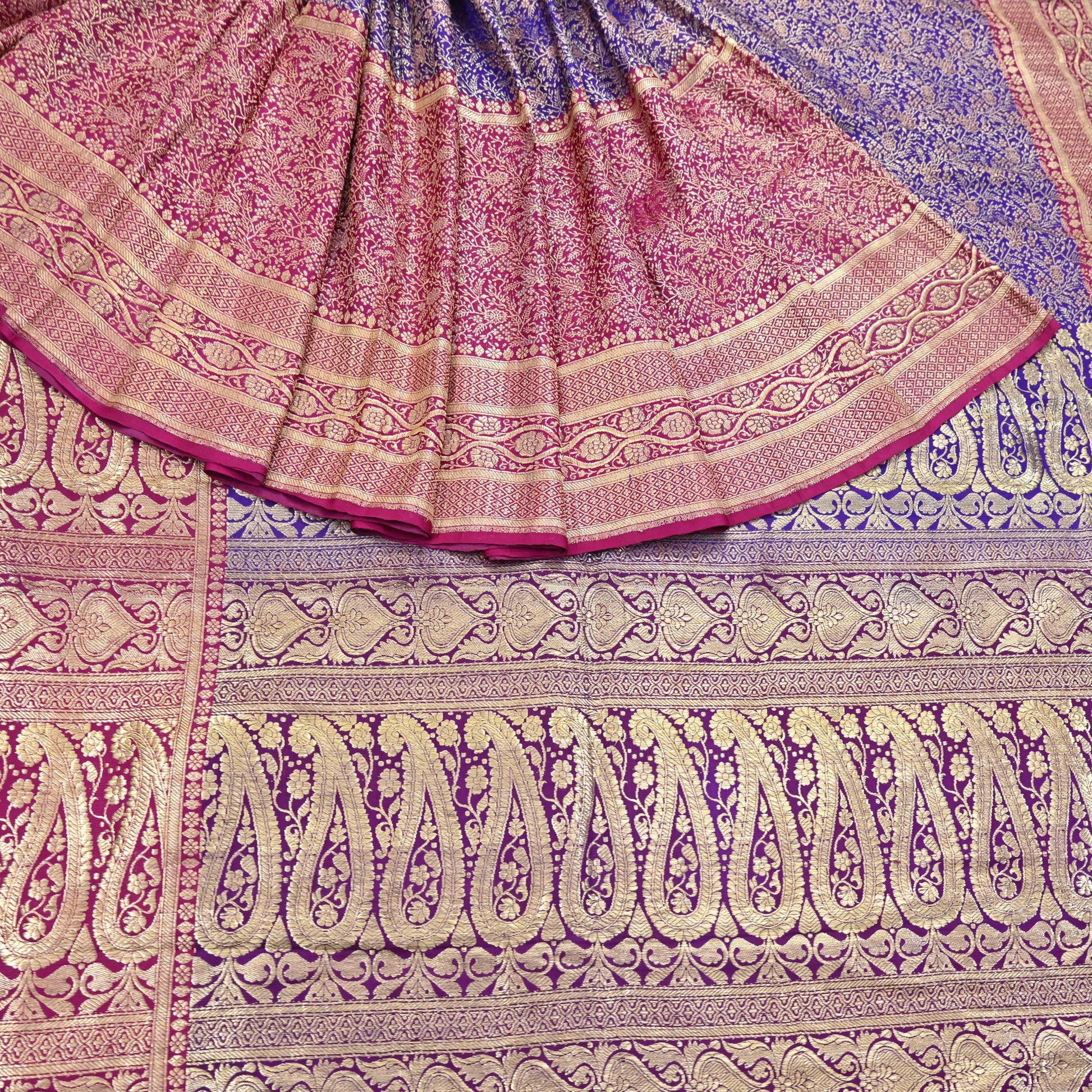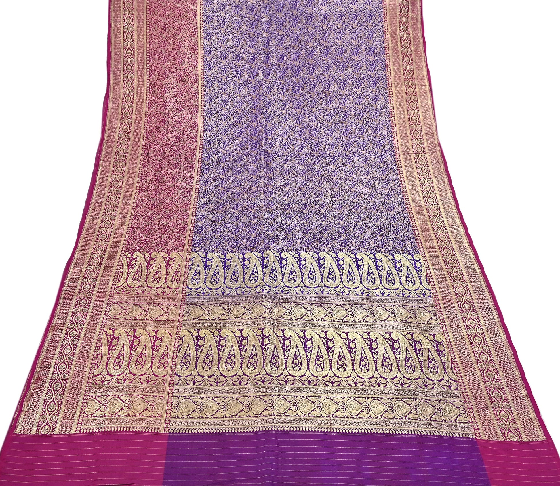 Vintage Banarasi Silk Saree Pink & Purple Heavy Satin Silk Brocade Fabric Golden Zari Bridal Wedding Crafting 5 Yard