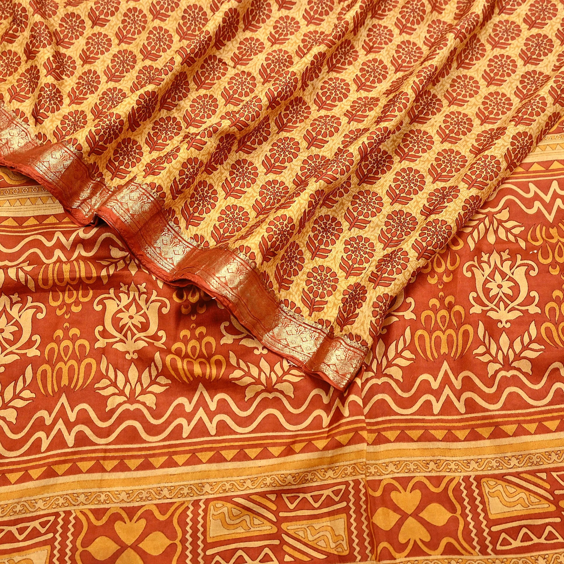 Crafted from 100% pure silk, the fabric drapes luxuriously with a soft, smooth texture and subtle sheen. The saree’s body showcases an elaborate block-style print in shades of rose, rust, and gold, while the golden border adds a royal touch.