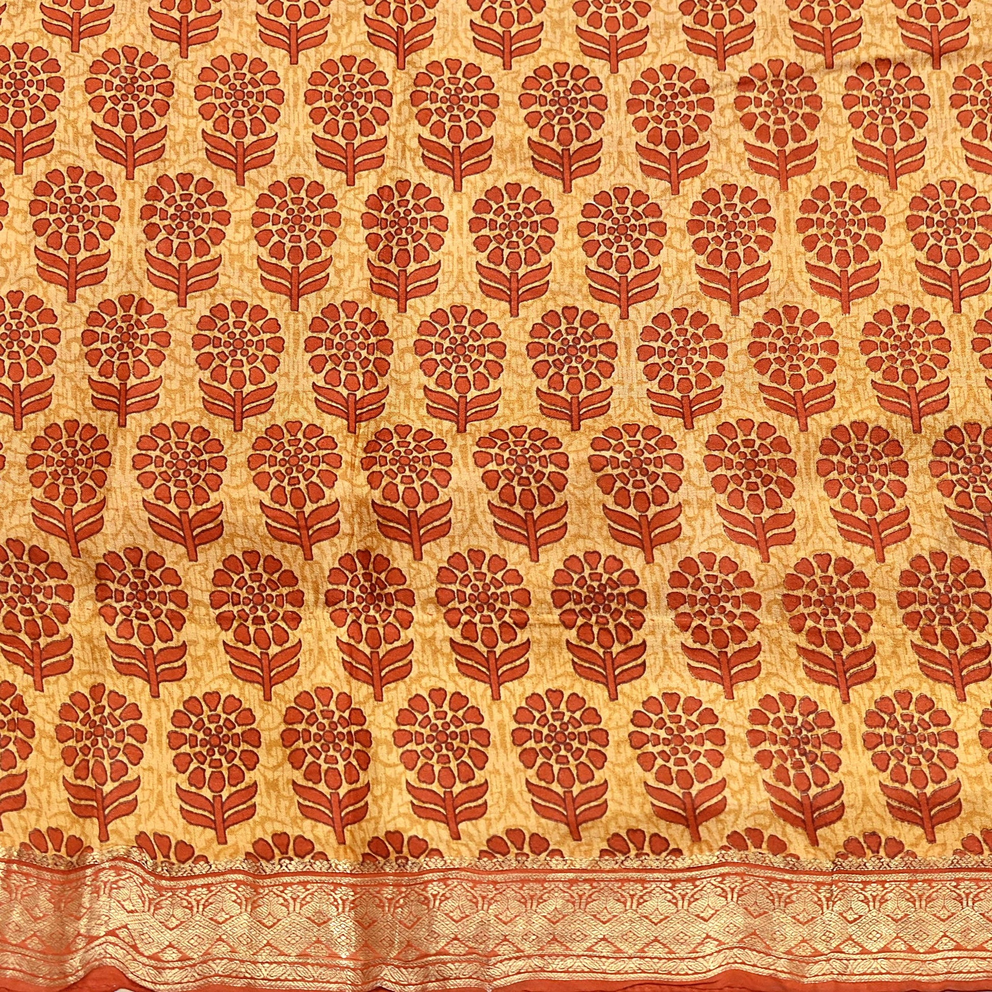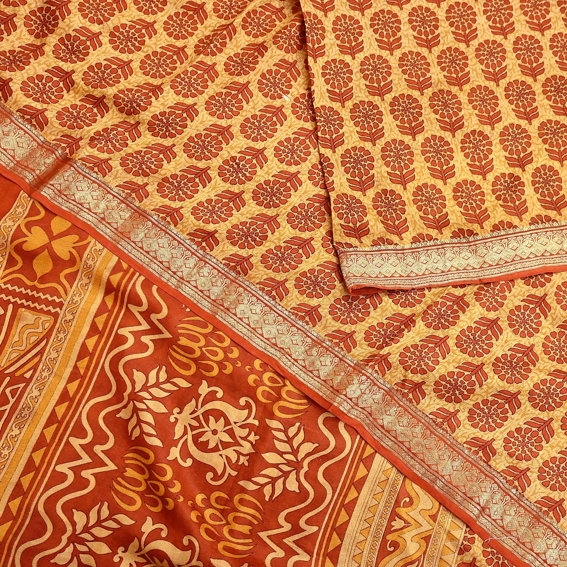 Vintage Beige & Orange Pure Silk Saree Indian Printed Silk Fabric 5 Yards Boho Craft Material for Sewing, Quilting, Dressmaking, Upcycling