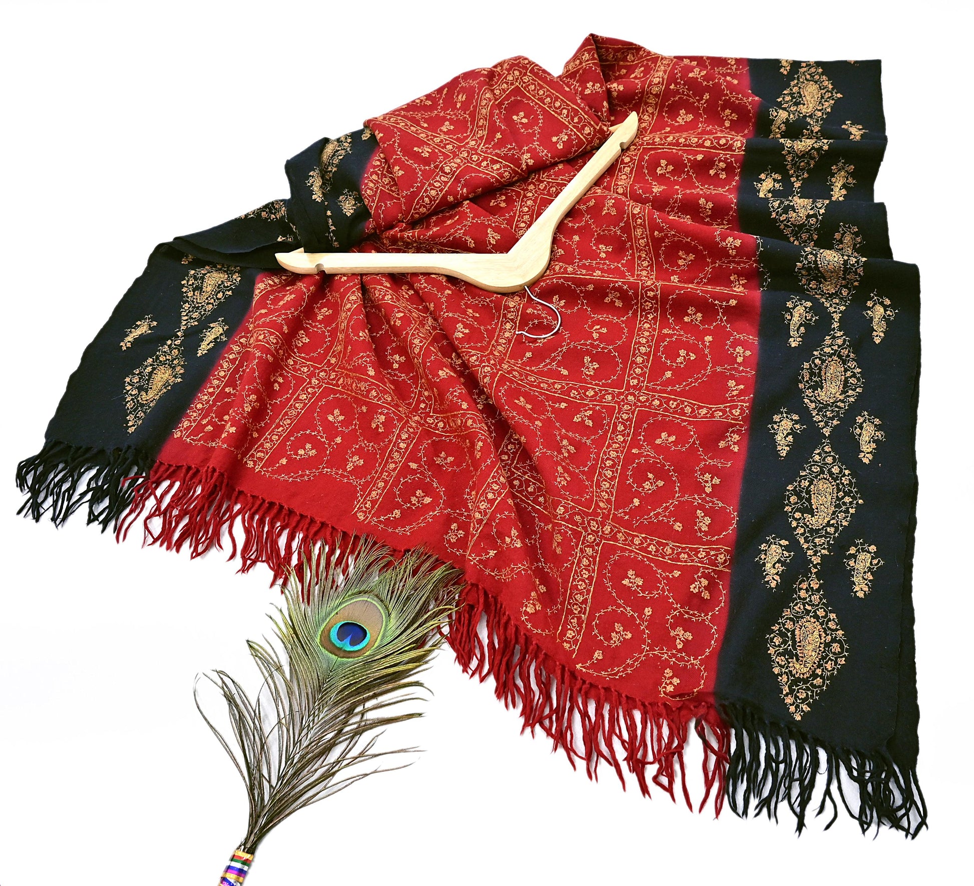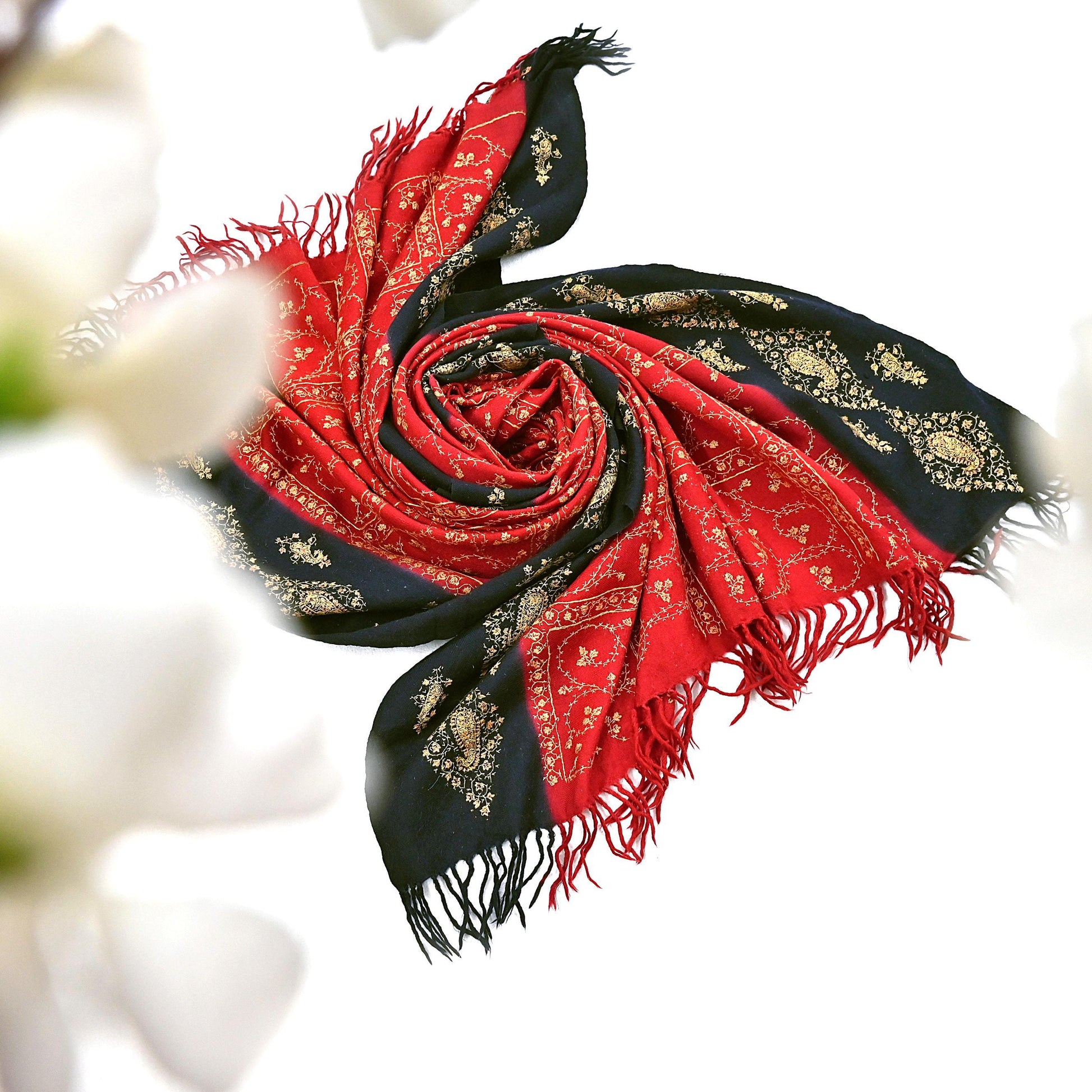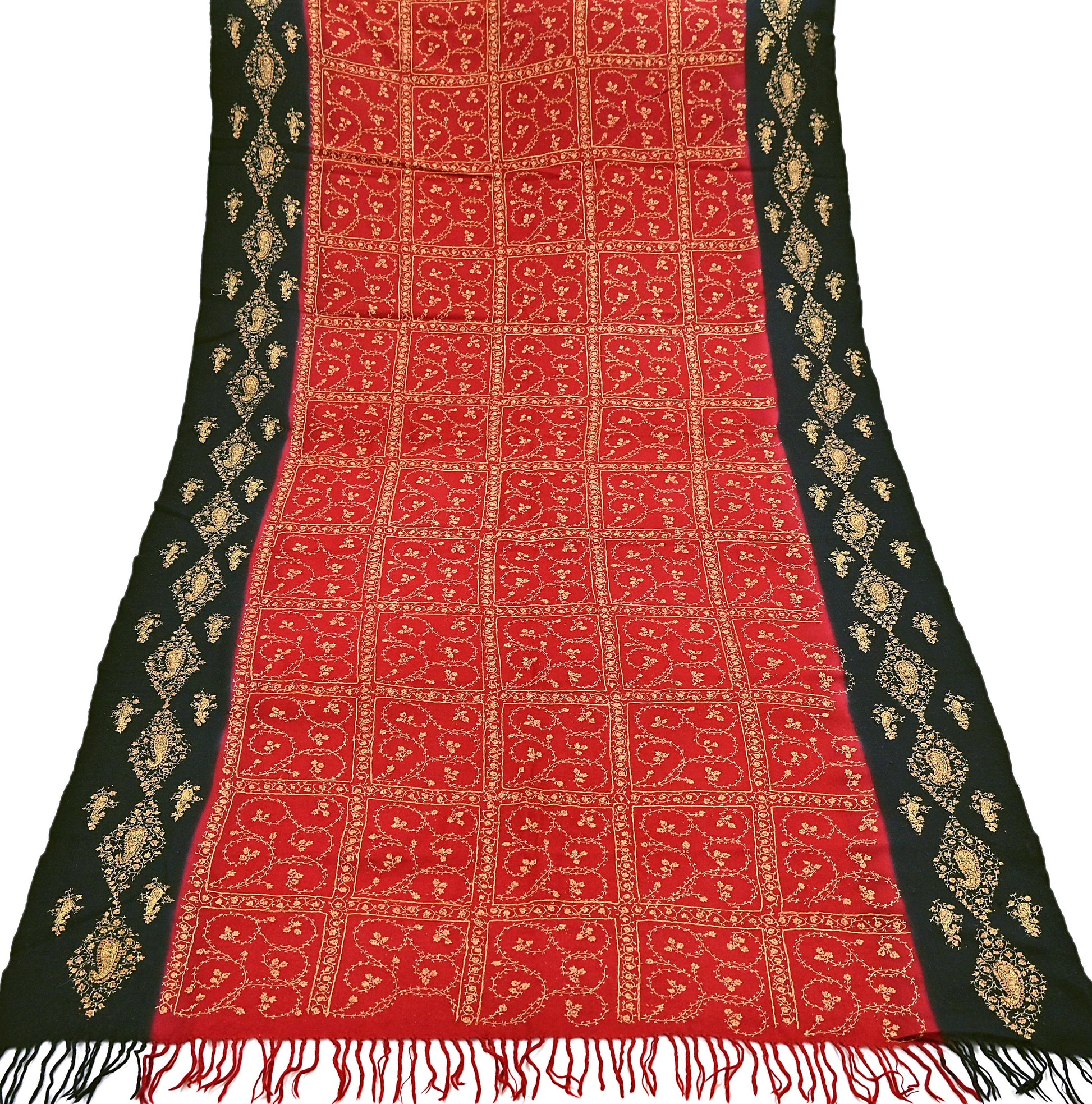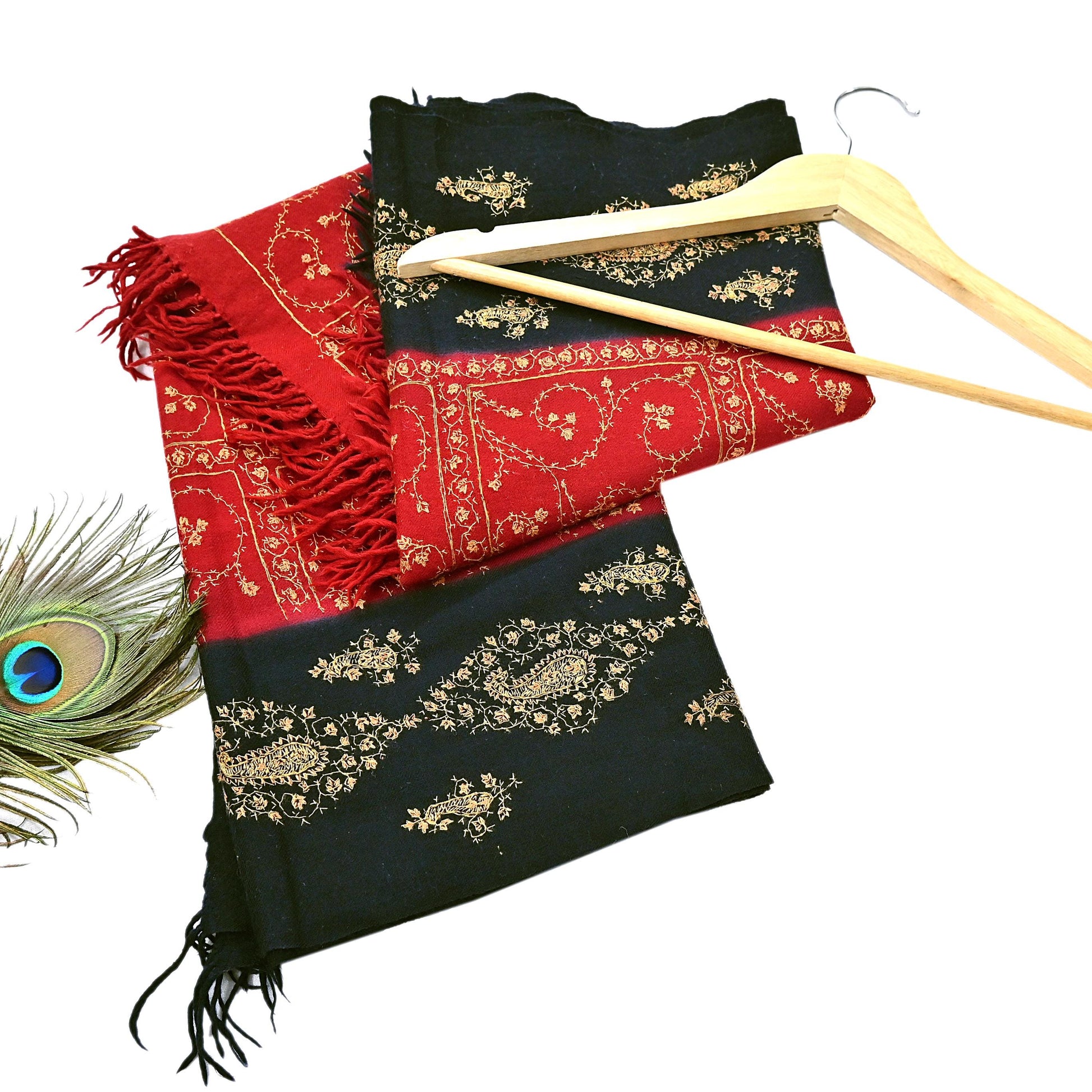 Vintage Black & Red Wool Shawl Hand-Embroidered Suzani Stole Pure Wool Wrap warm soft