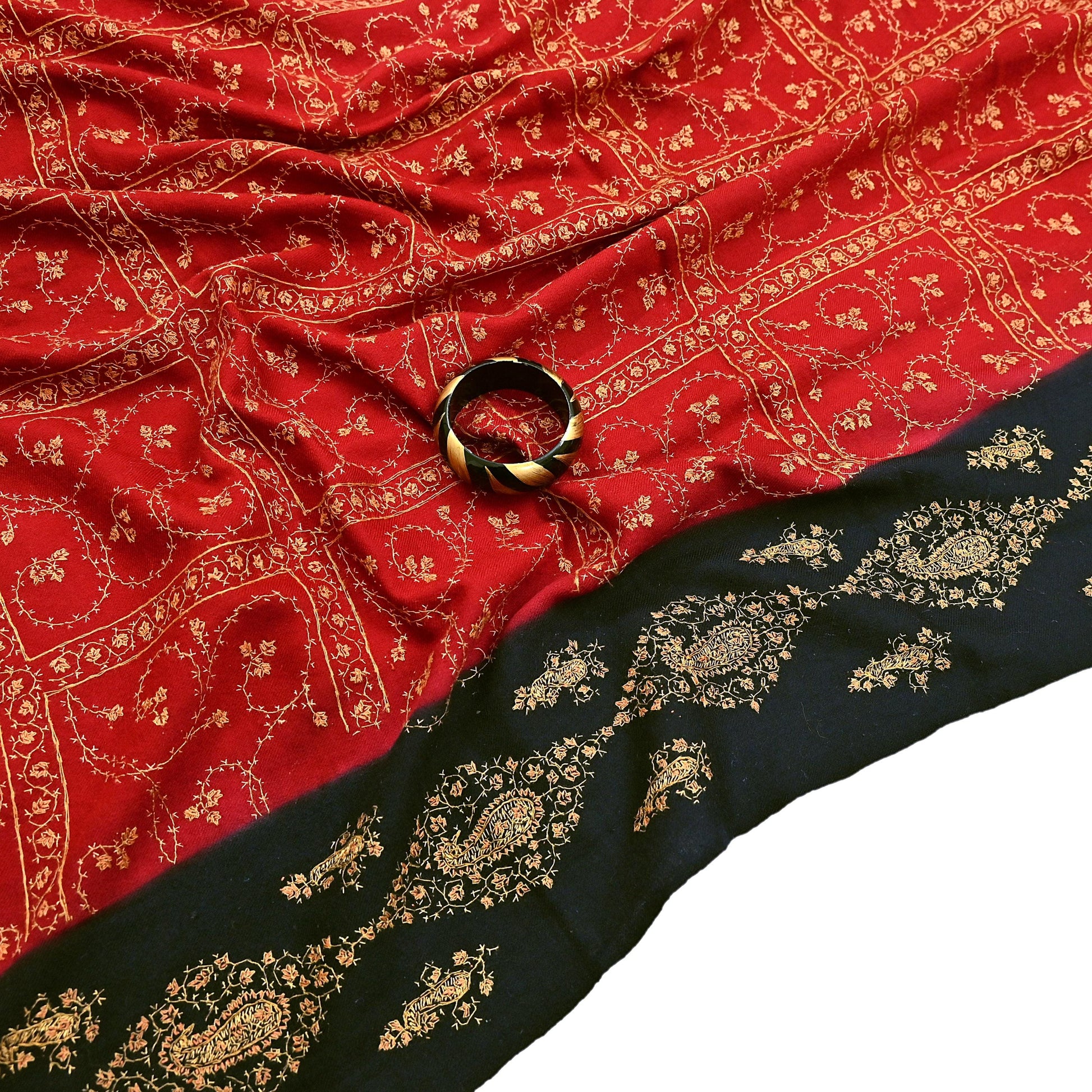 We are delighted to offer you a vintage pure wool shawl/stole in classic Black & Red, embellished with hand-embroidered Suzani work and fine woven patterns. Both the center and border feature intricate floral embroidery, showcasing timeless craftsmanship.