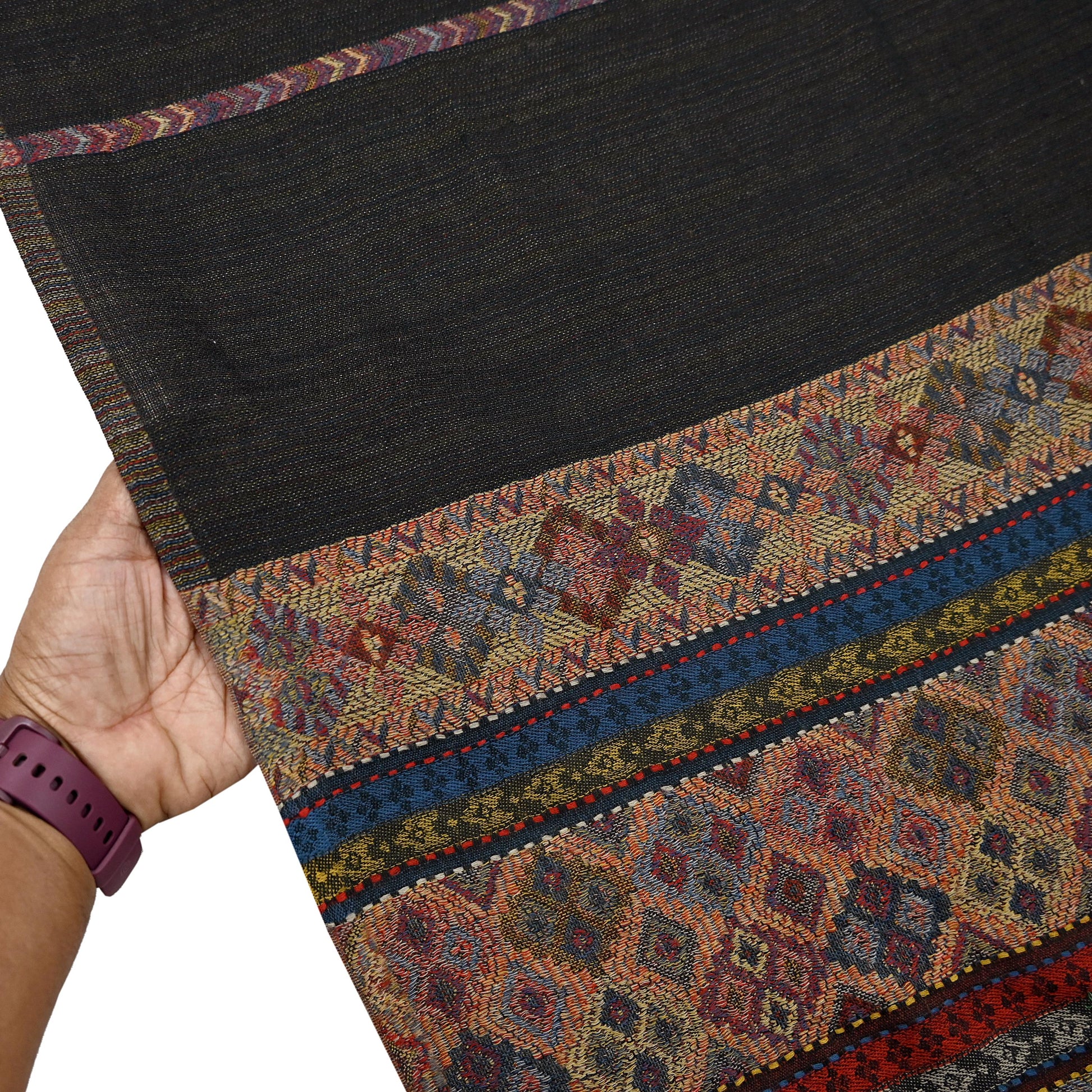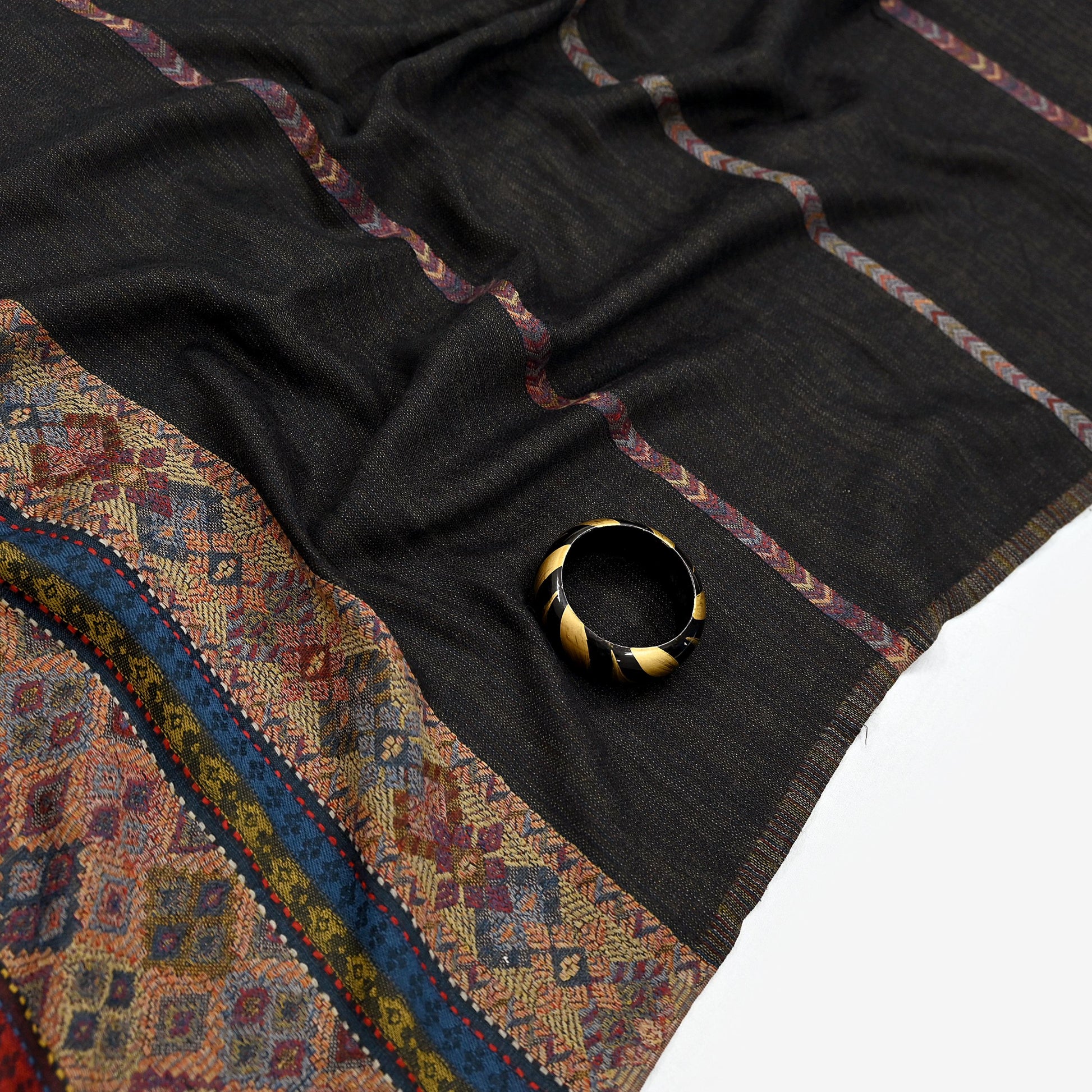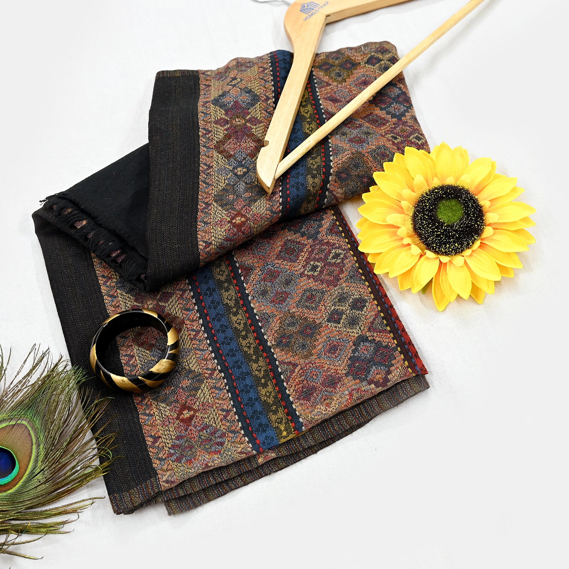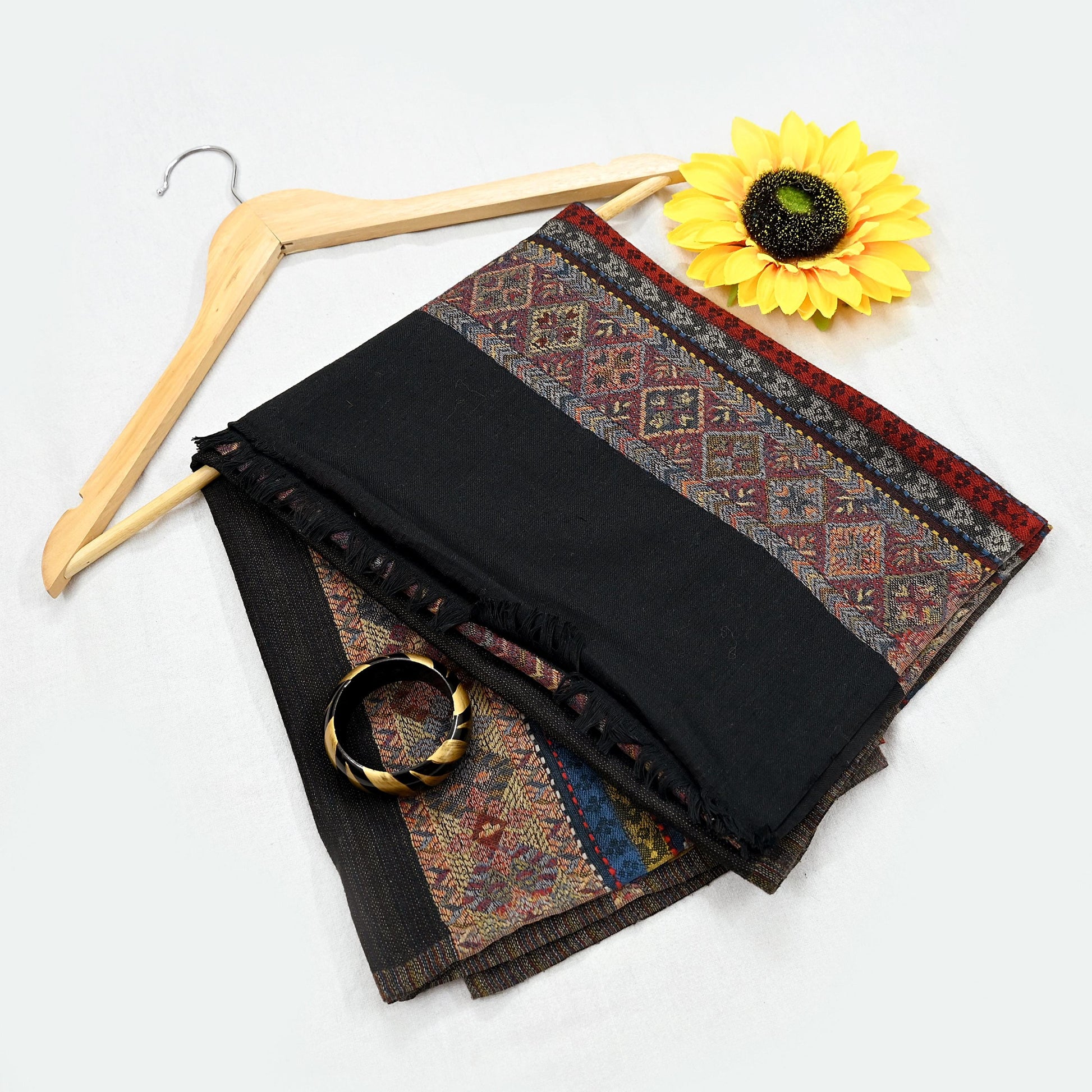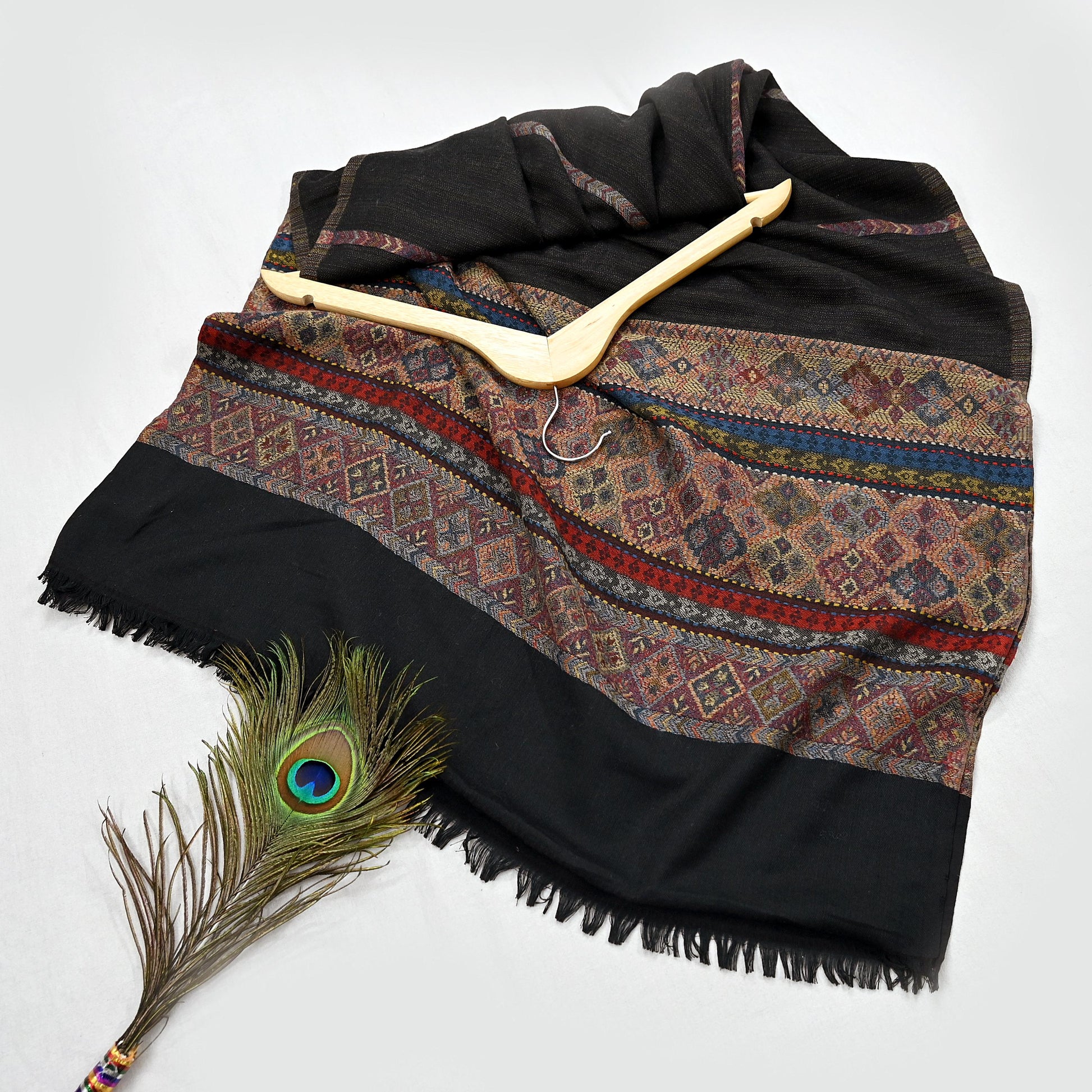 We Are Offering You A Vintage Black Color Viscose Stole Which Adorns Hand Woven Work. Shawl has handmade Traditional Hand Woven work design with Geometric design. Shawl has matching fringes on both ends of borders. This cozy, warm and fuzzy stool is soft against skin due to the mellow woolen fabric. A truly gorgeous piece which will also make an admirable gift.