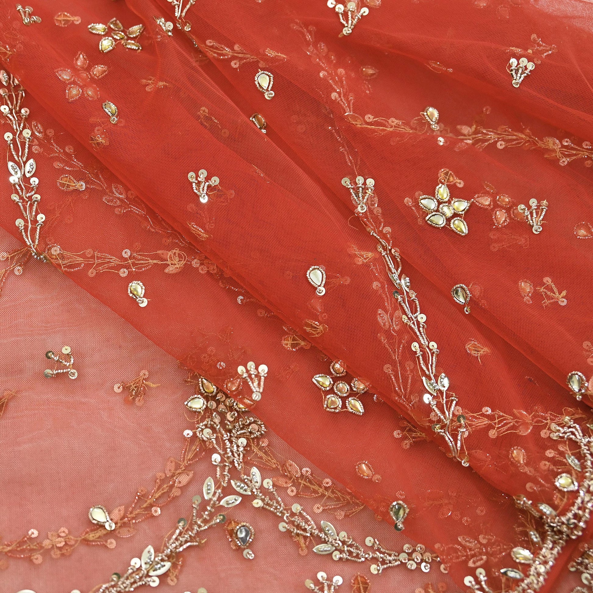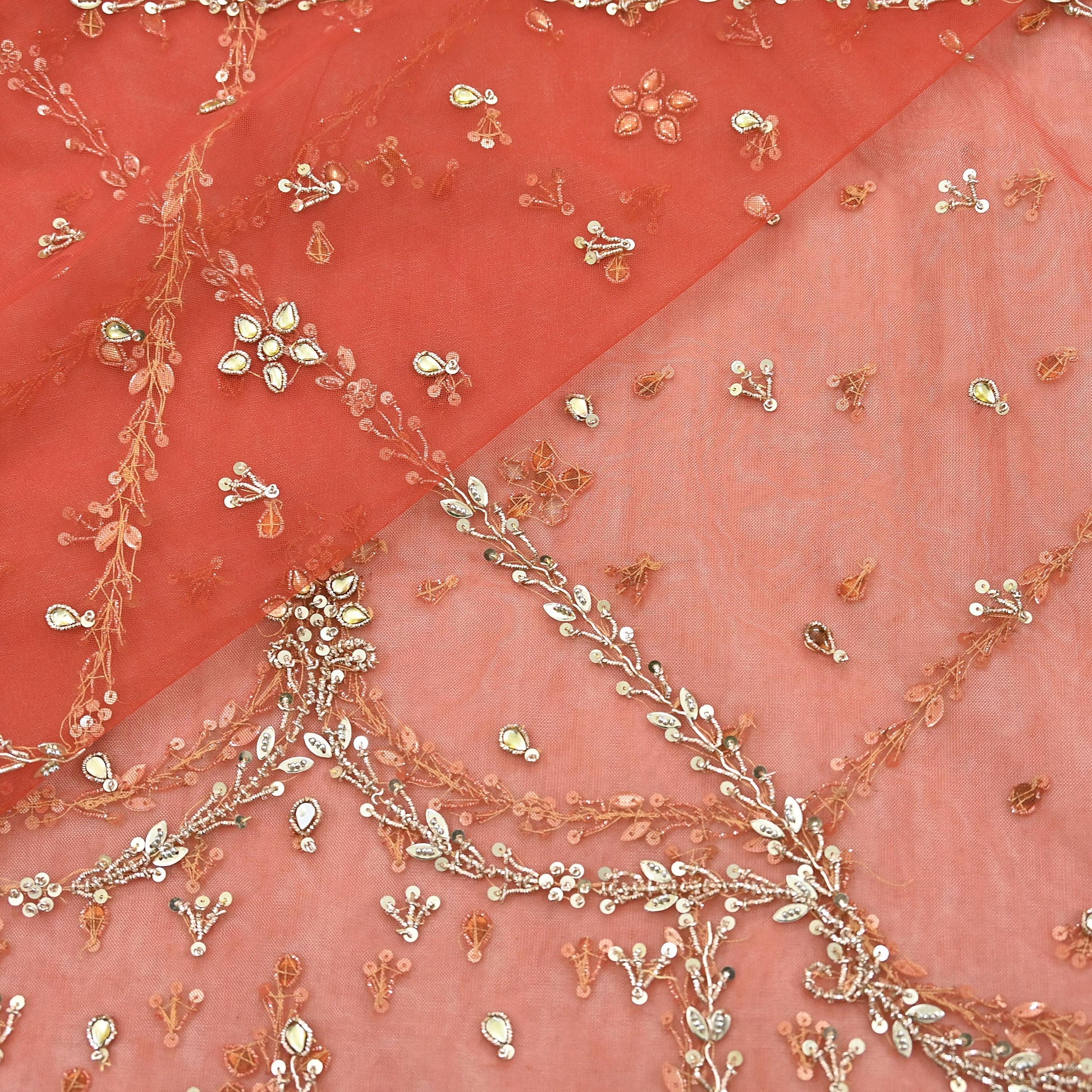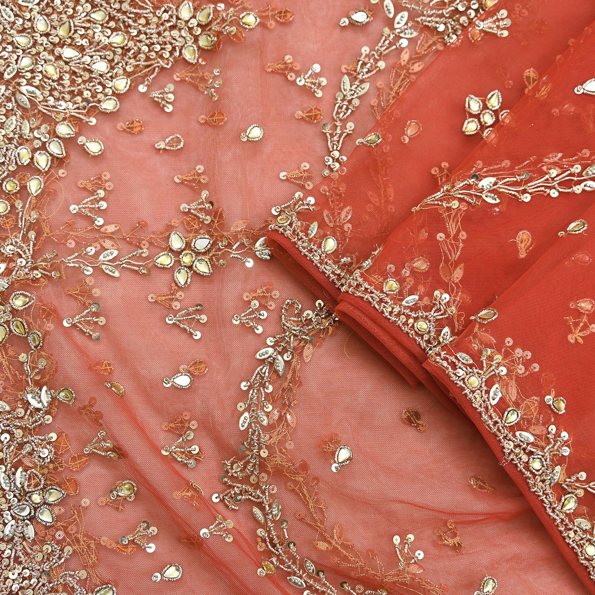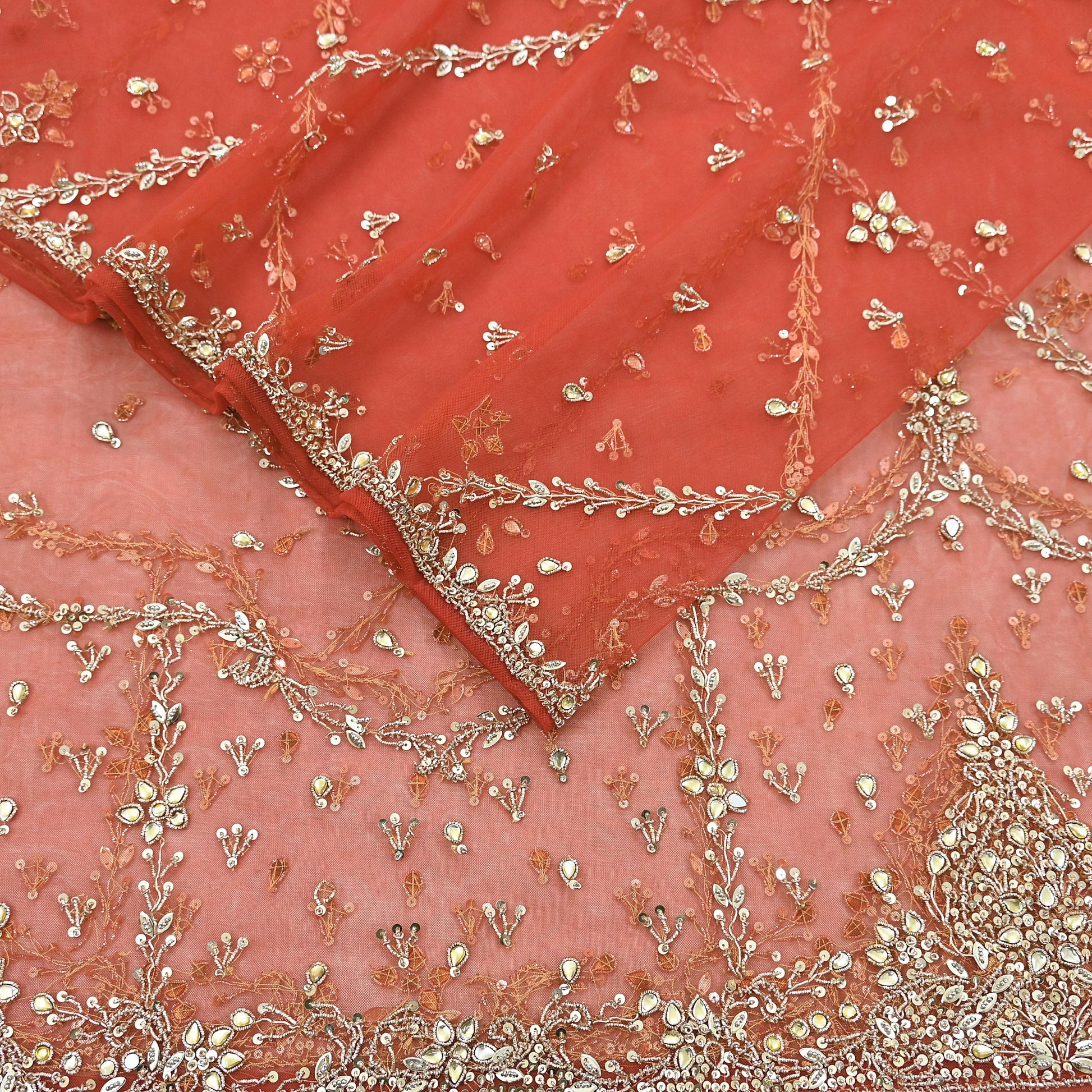 This stunning vintage hand-embroidered dupatta is a true masterpiece, crafted on sheer Orange net fabric with intricate zardozi, zari, and Pink sequin work. The detailed floral motifs across the border and center are embroidered using pure metallic golden Zardozi, dabka, Yellow Kundan Beaded, Golden sequins work, enhanced by beads and multi-colored sequins.