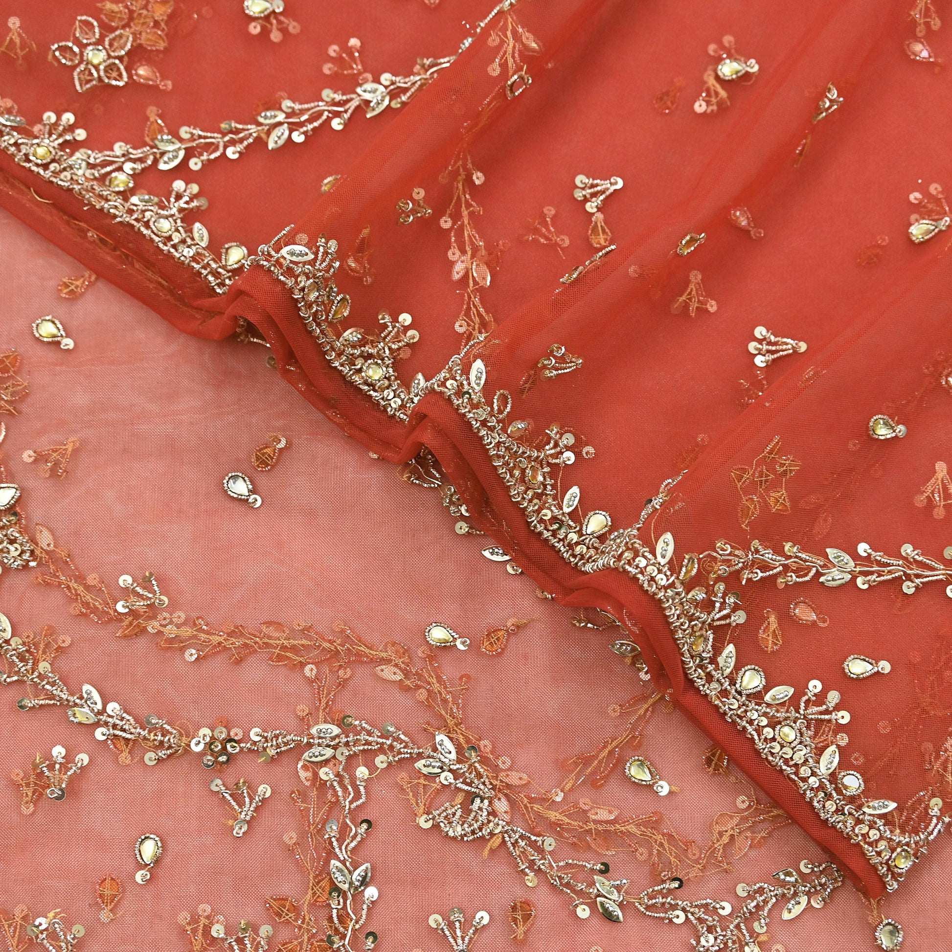 Vintage Bridal Heavy Orange Net Dupatta Hand Embroidered Zardozi, Dabka, Zari, Sequins Work Wedding Veil Stole