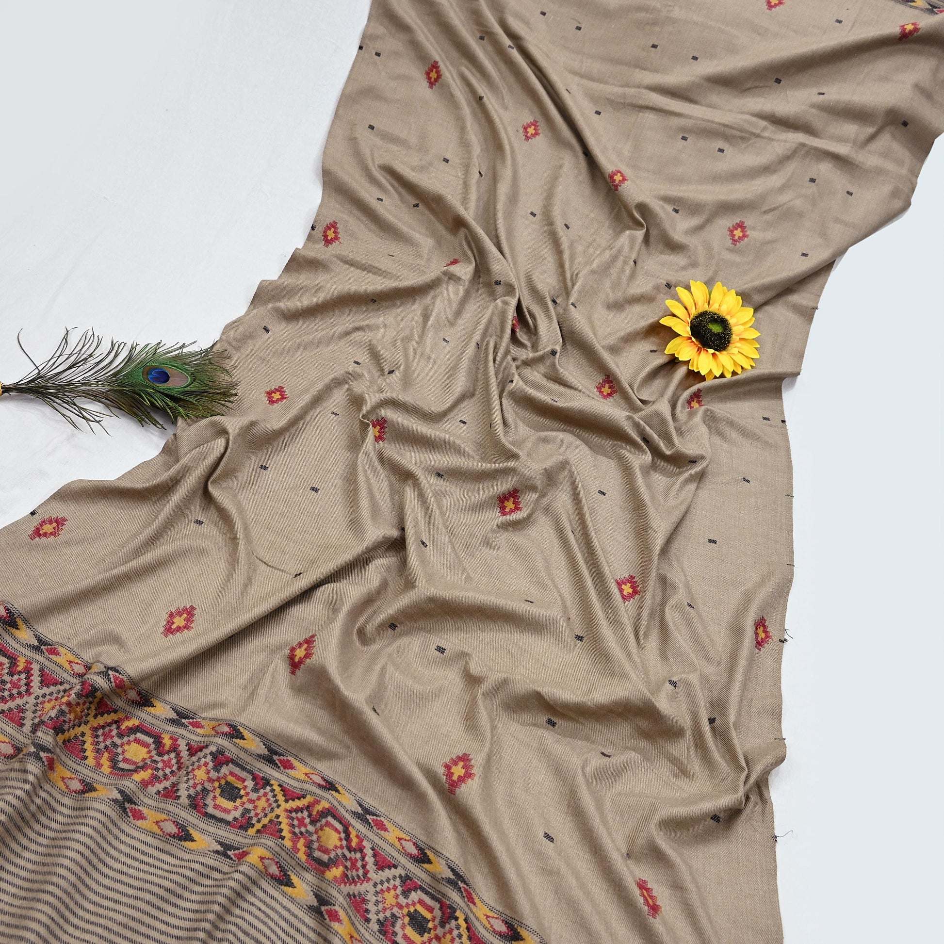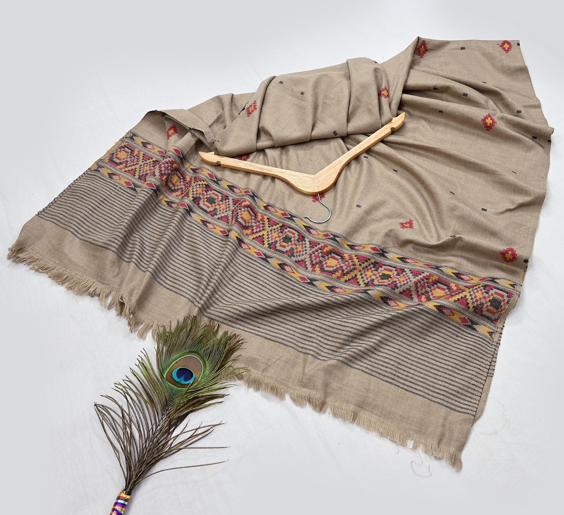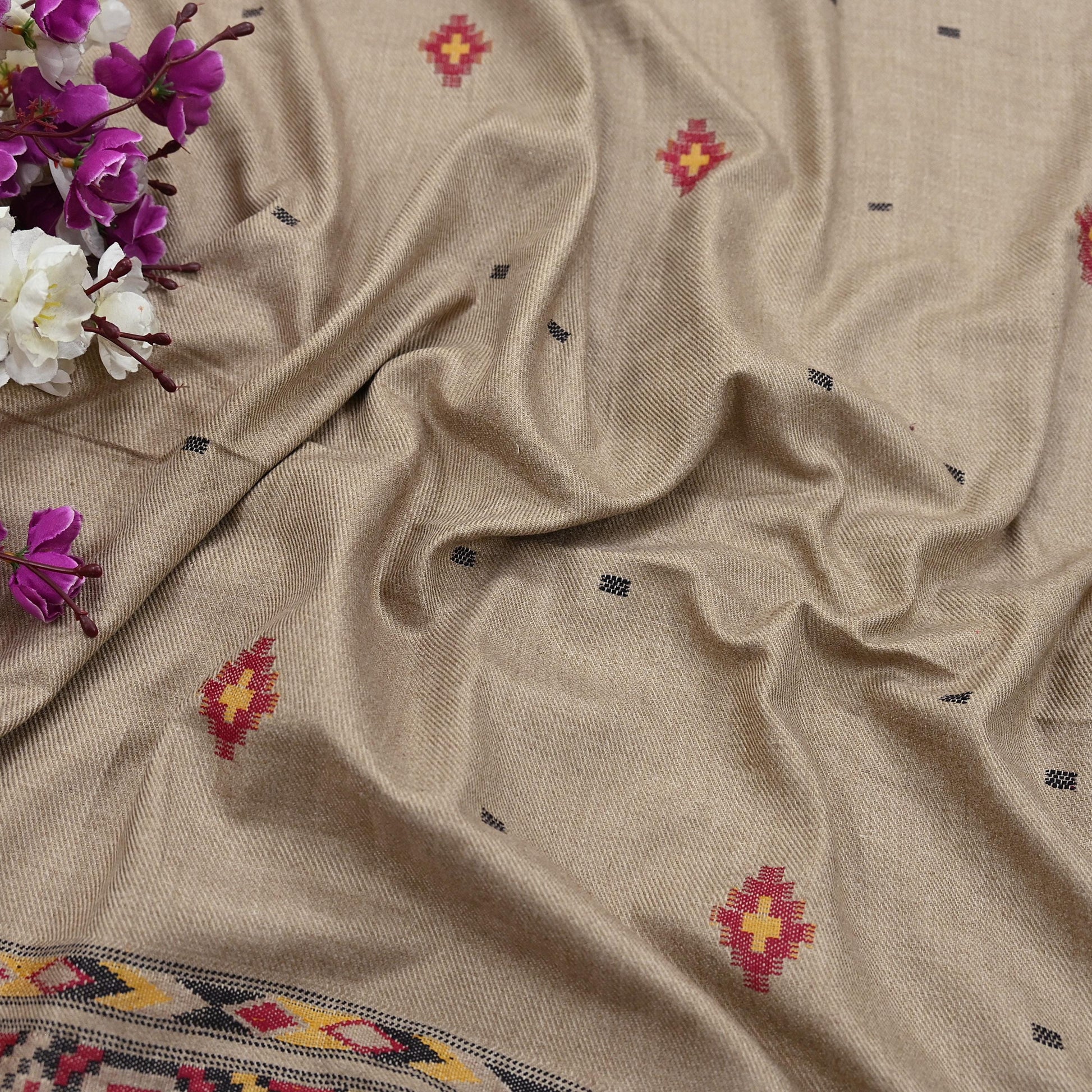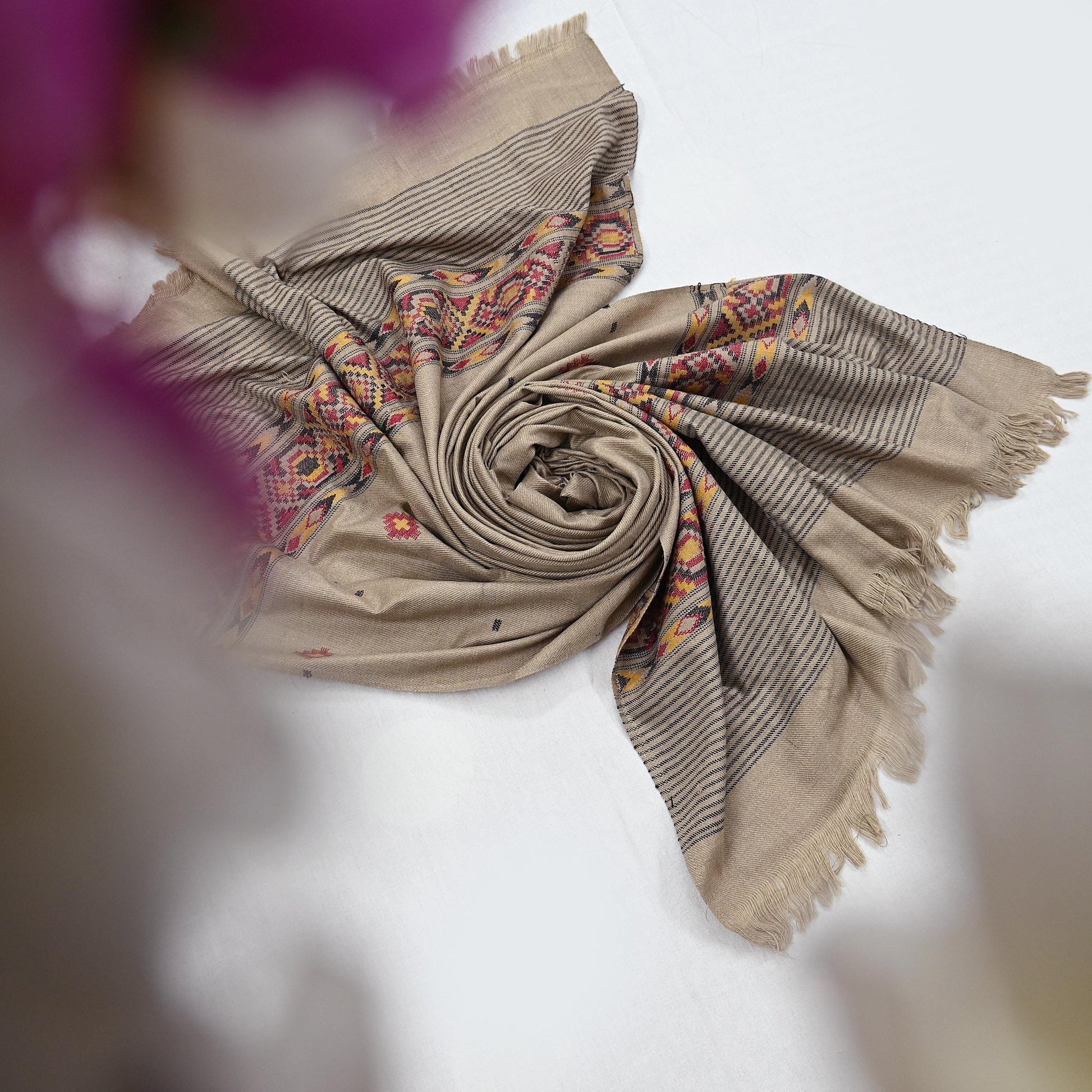 We Are Offering You A Vintage Brown Color Woolen Stole Which Adorns Hand Woven Work. Shawl has handmade Traditional Hand Woven work design with Geometric design. Shawl has matching fringes on both ends of borders. This cozy, warm and fuzzy stool is soft against skin due to the mellow woolen fabric. A truly gorgeous piece which will also make an admirable gift.