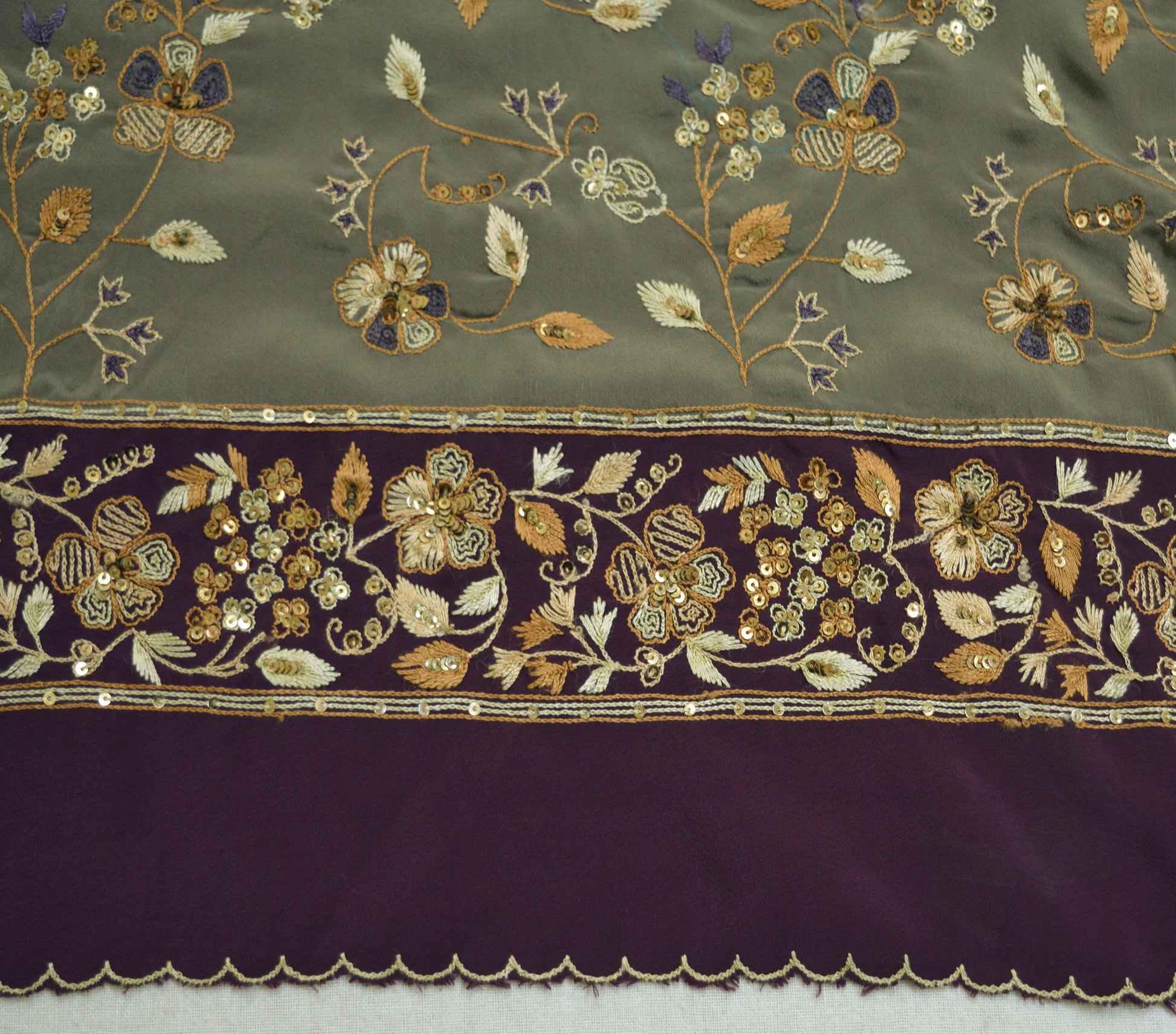 Vintage Gray & Purple Crepe Hand Embroidered Design Fabric 16"X44" Floral Crafting Quilting Zardozi dabka zari net work