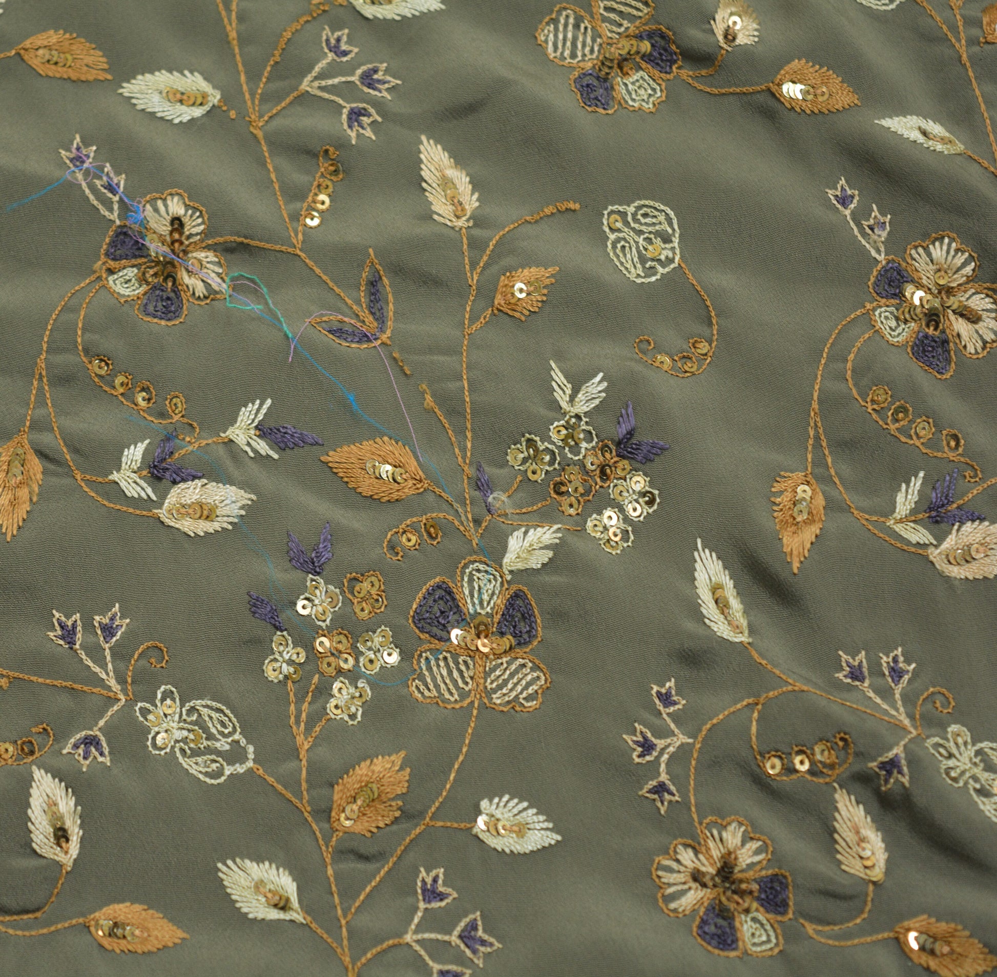 This Is A Beautiful Crepe Gray & Purple Colored Hand Embroidered Design Fabric.