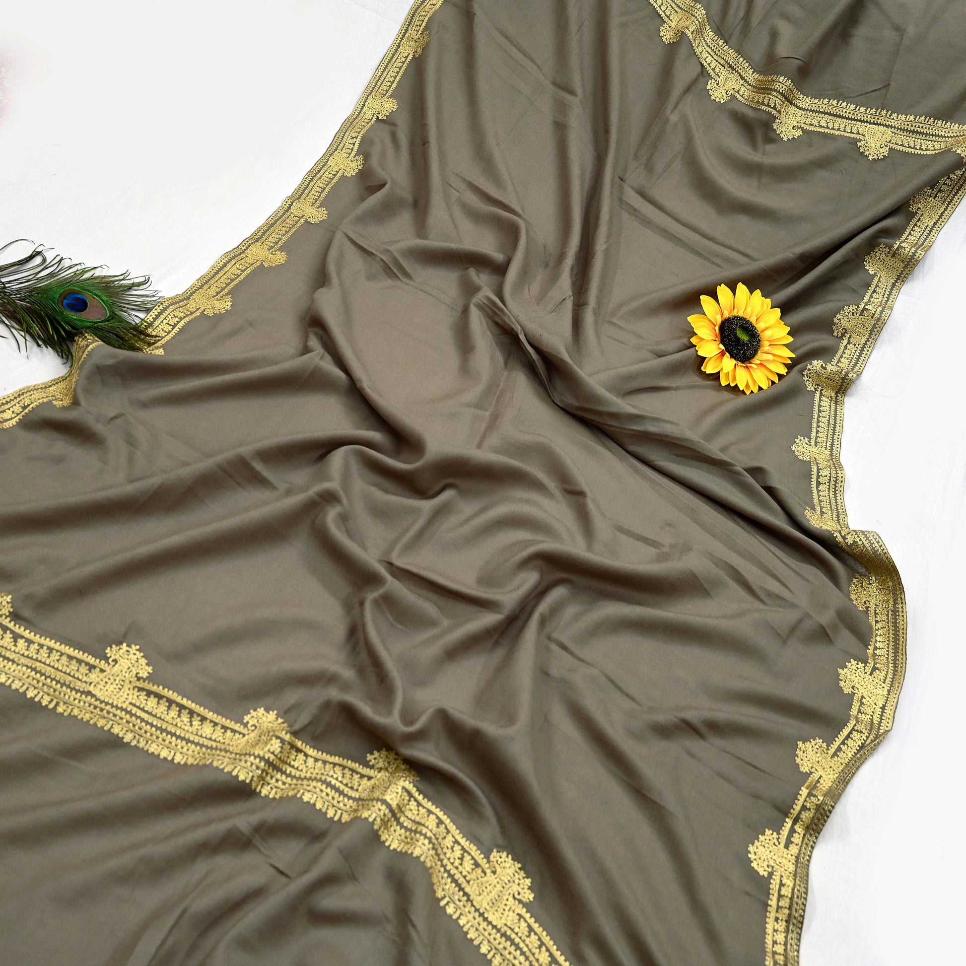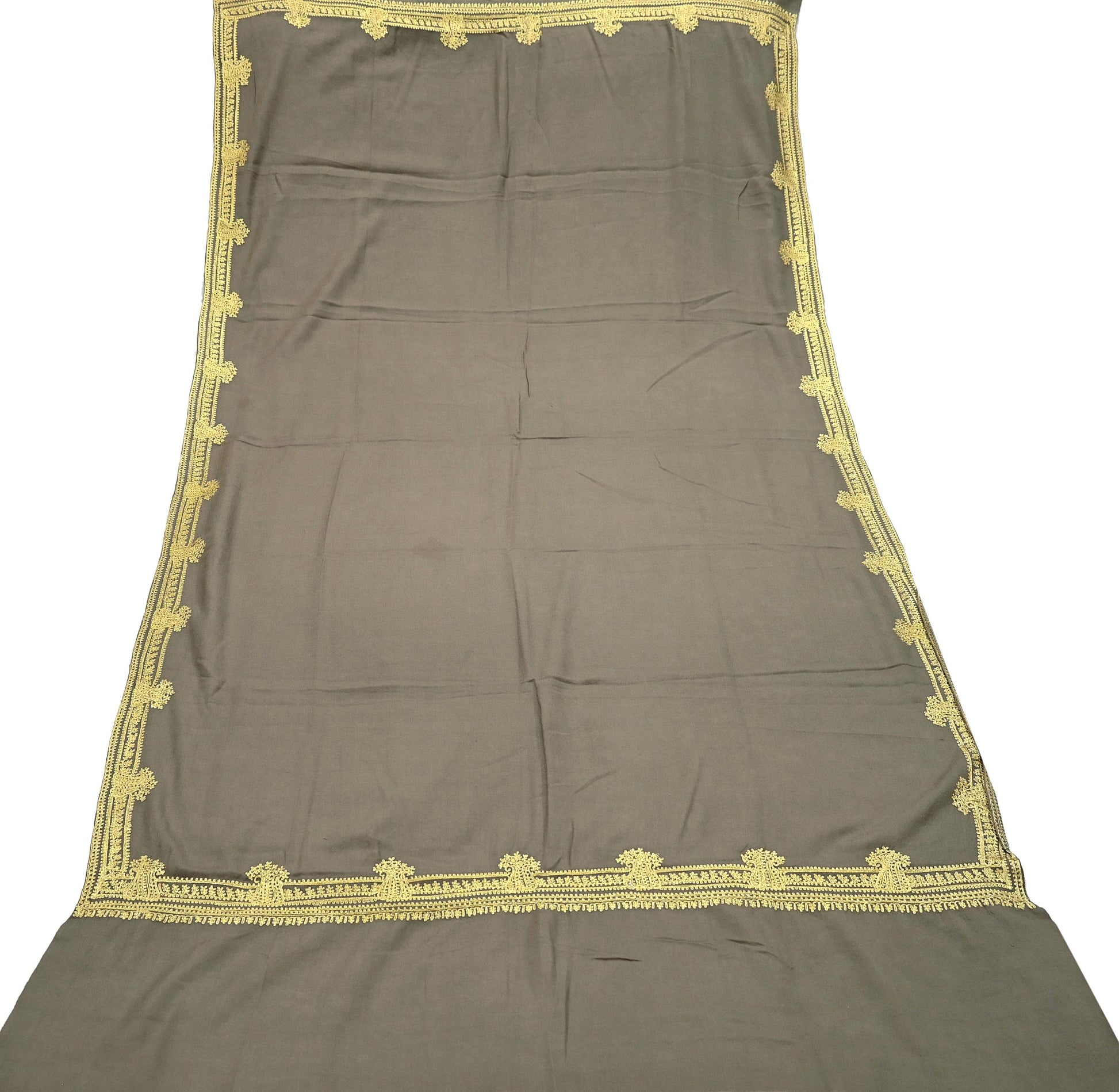 We Are Offering You A Vintage Gray Color 100% Pure Woolen Stole/Shawl Which Adorns Hand Embroidered Golden Zari Work. Center part & Border of this shawl with floral pattern. This cozy, warm and fuzzy stool is soft against skin due to the mellow woolen fabric. A truly gorgeous piece which will also make an admirable gift.