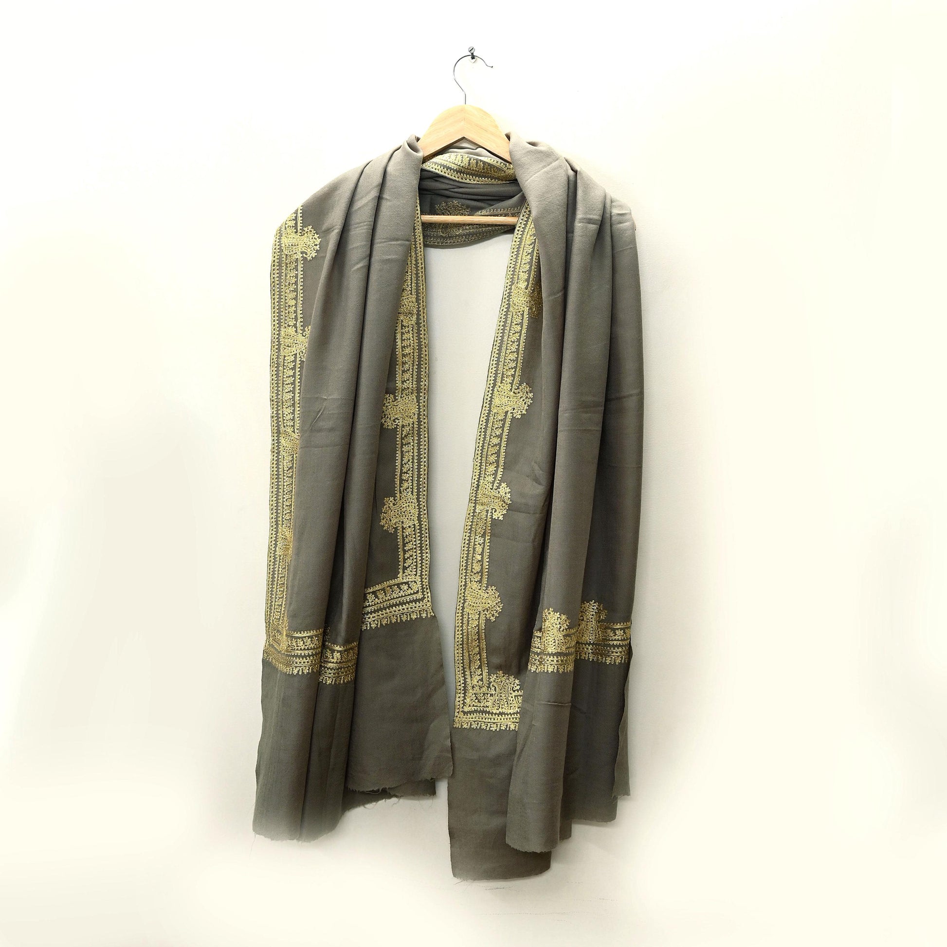Vintage Gray Shawl Pure Woolen Hand Embroidered Golden Zari Long Throw Stole Warm Stole Floral Design Soft