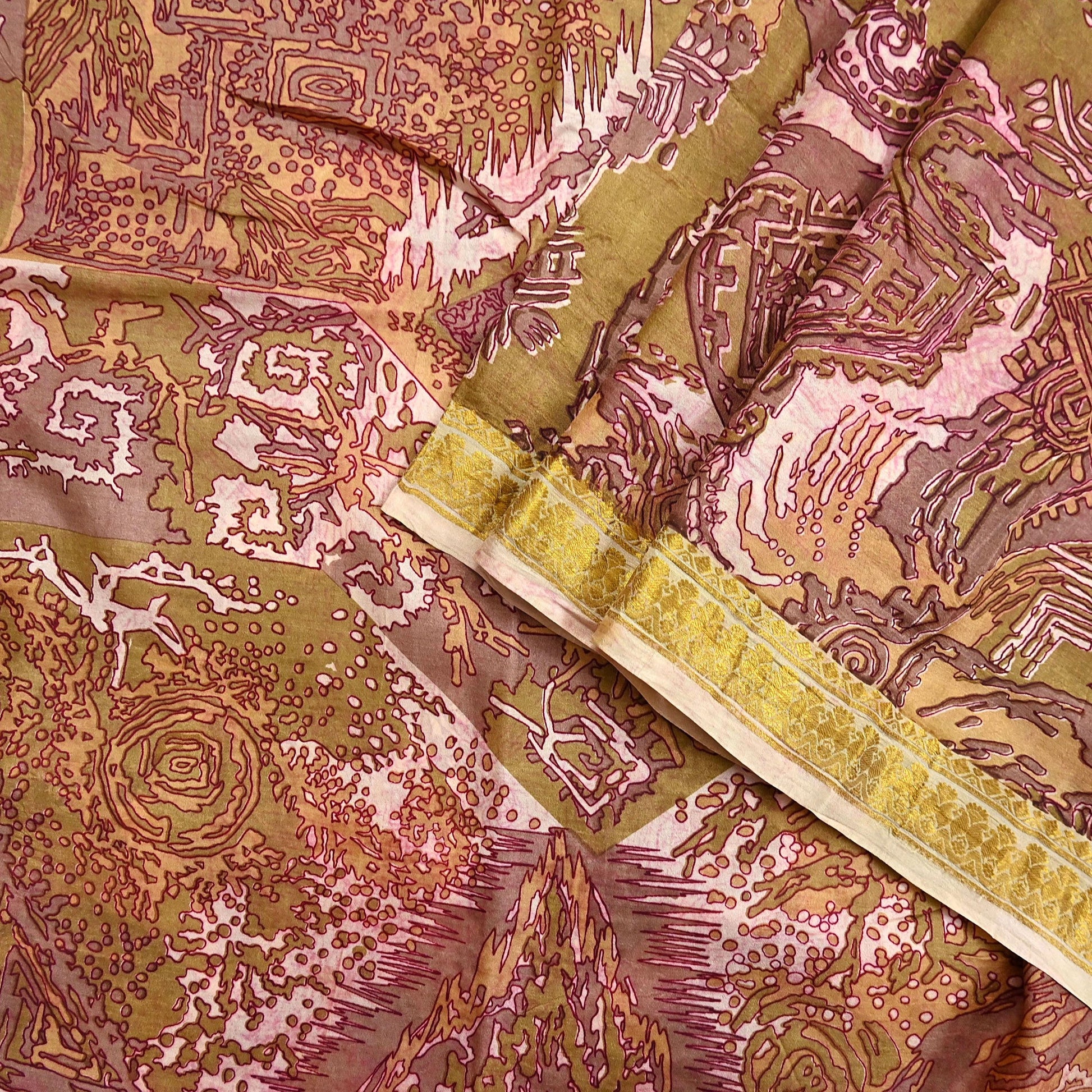 Crafted from 100% pure silk, the fabric drapes luxuriously with a soft, smooth texture and subtle sheen. The saree’s body showcases an elaborate block-style print in shades of rose, rust, and gold, while the golden border adds a royal touch.