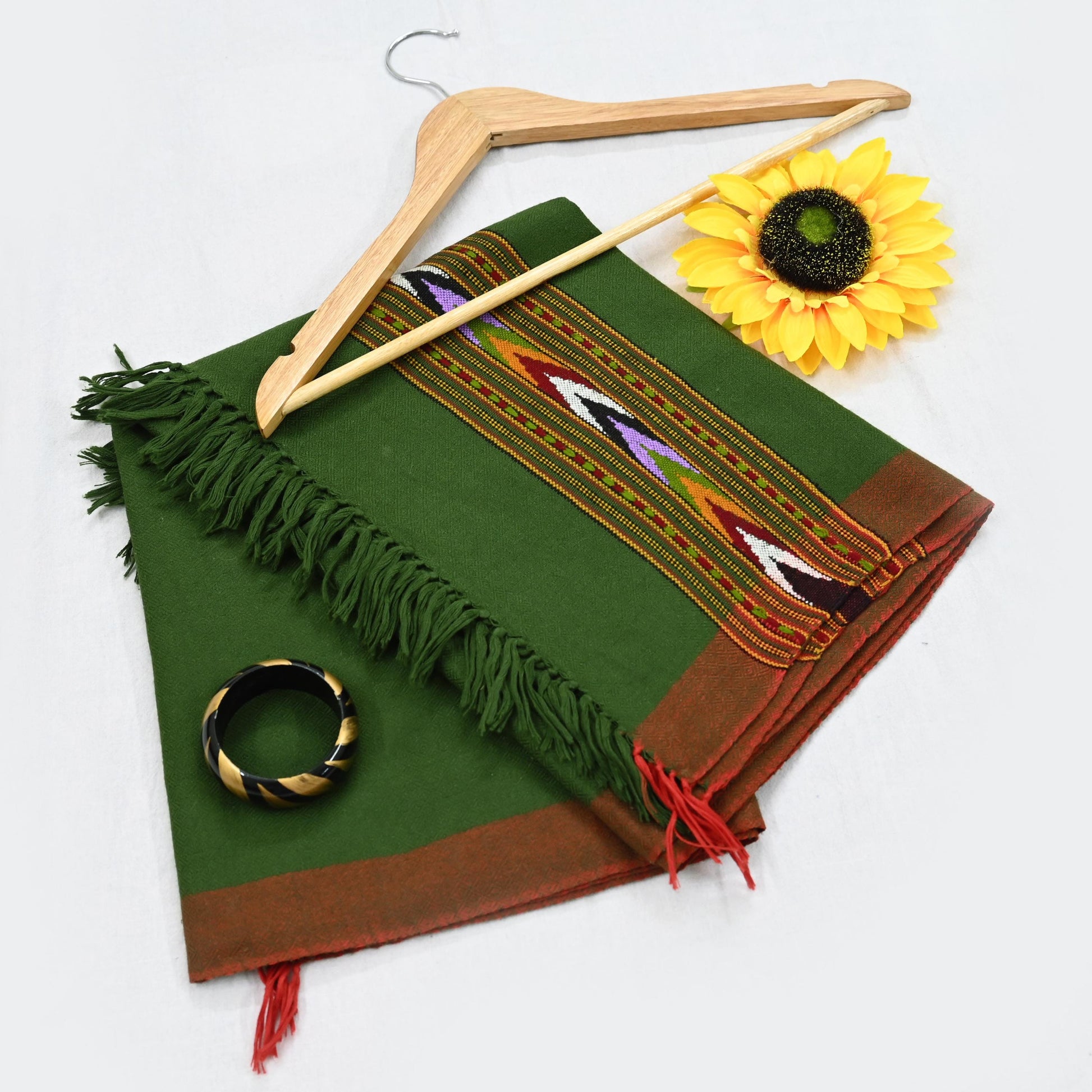 We Are Offering You A Vintage Green Color Woolen Stole Which Adorns Hand Woven Work. Shawl has handmade Traditional Hand Woven work design with Geometric design. Shawl has matching fringes on both ends of borders. This cozy, warm and fuzzy stool is soft against skin due to the mellow woolen fabric. A truly gorgeous piece which will also make an admirable gift.
