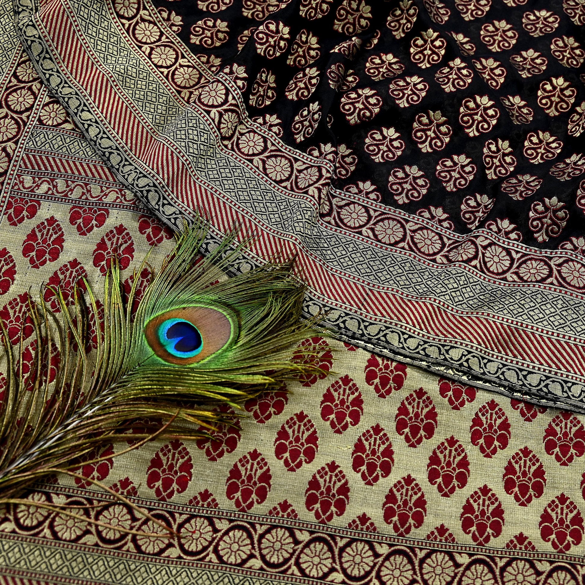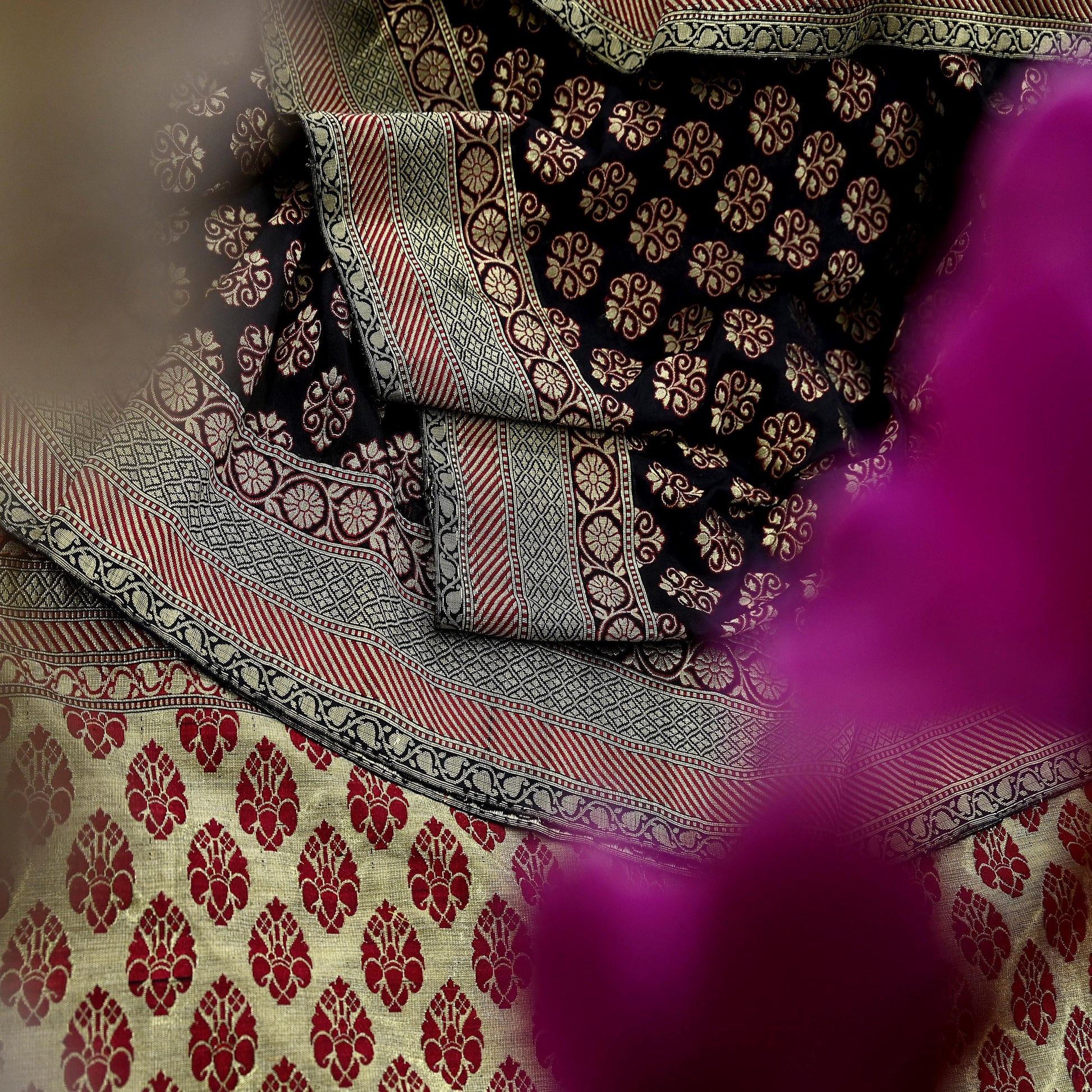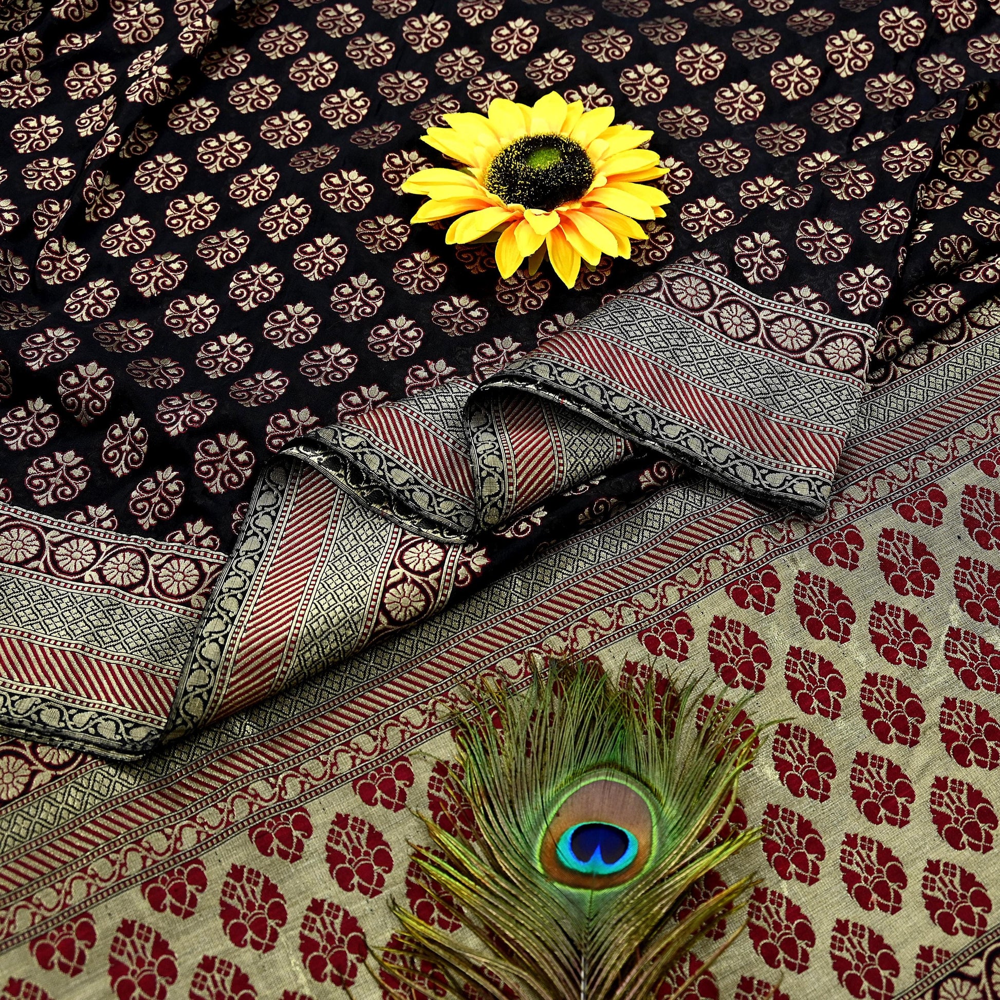 *Pallu & Border Features Floral Design Embellished With Golden & Maroon woven Zari Work.