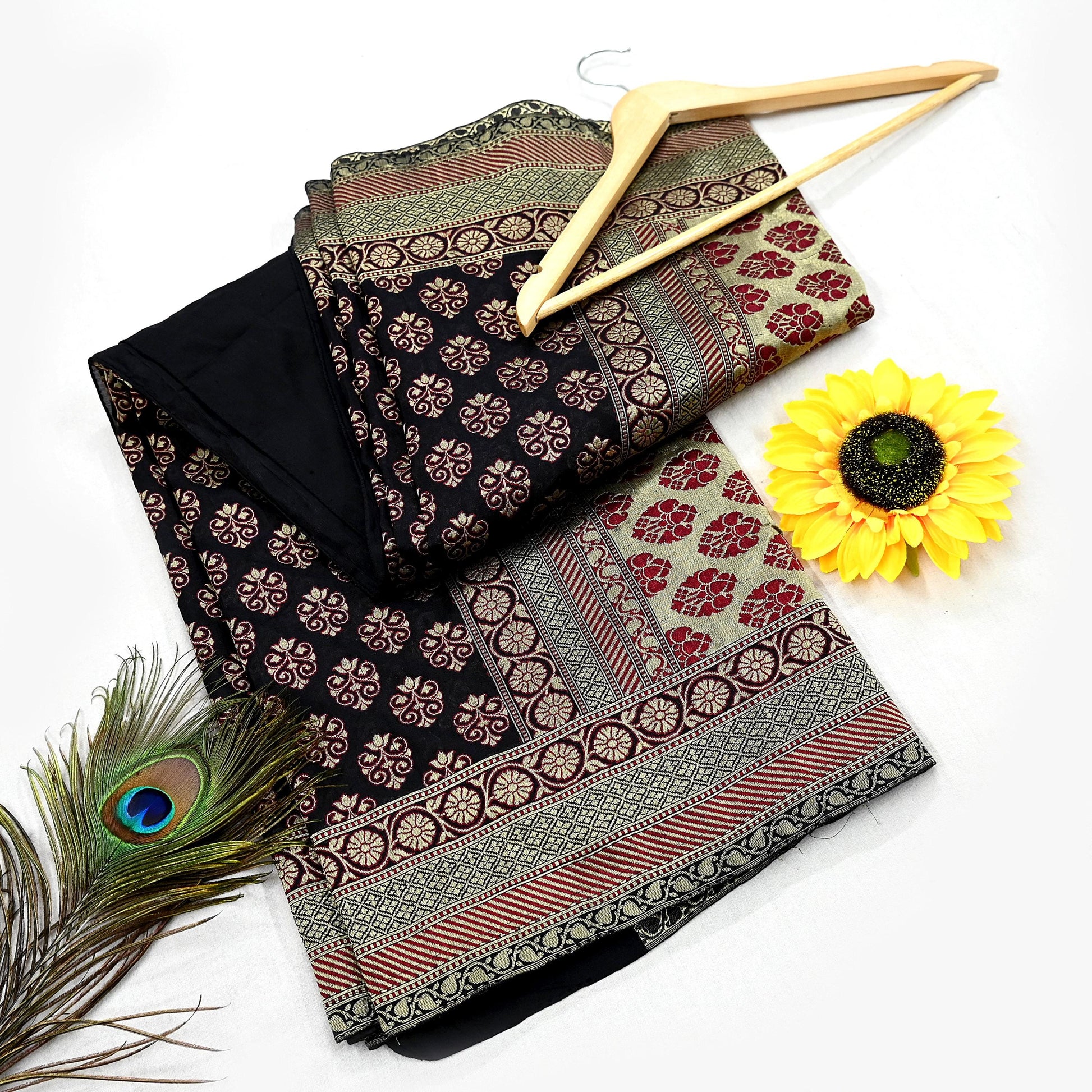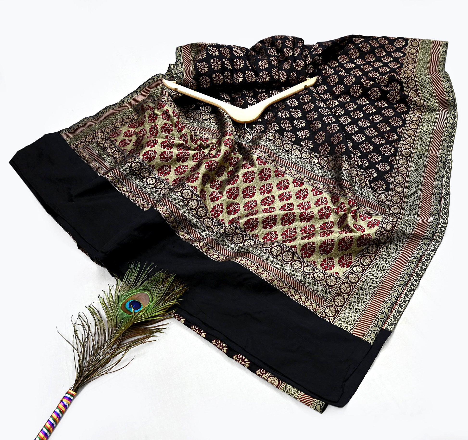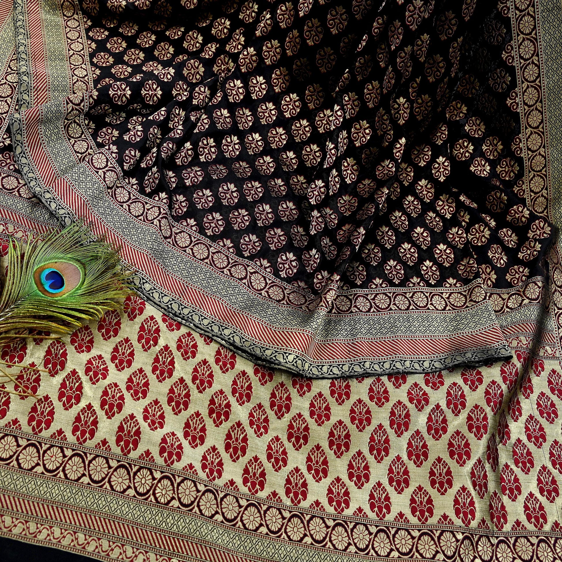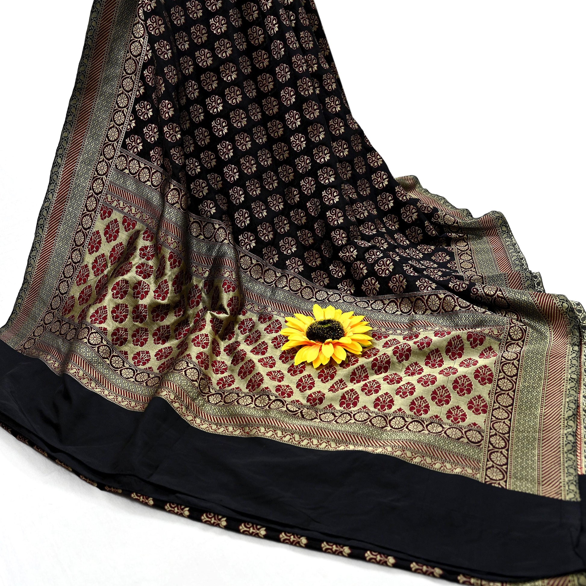 Vintage Heavy Black Sarees Pure Silk Hand Woven Sari Craft Fabric 5Yd Sewing Soft Ethnic Zari Dress Making Wedding Sari