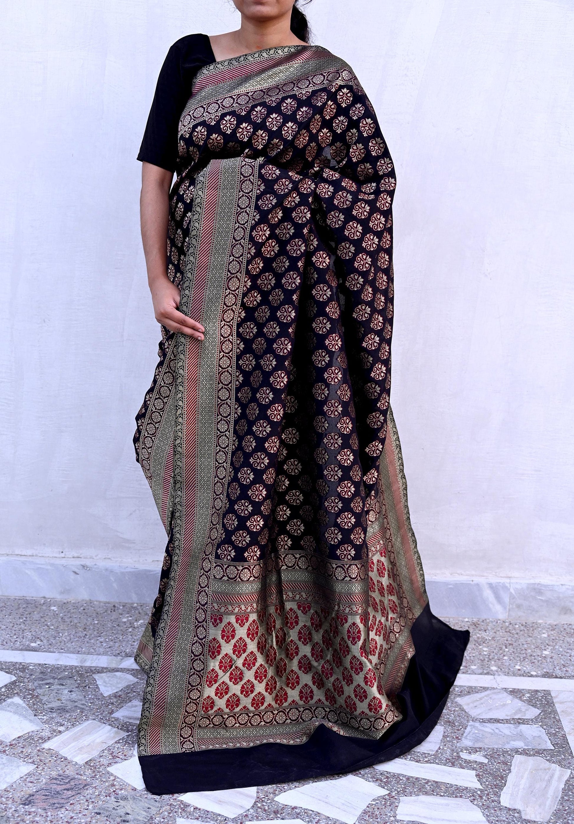 *Awesome Beautiful Antique Vintage Black Colored Hand Woven Pure Silk Sari.