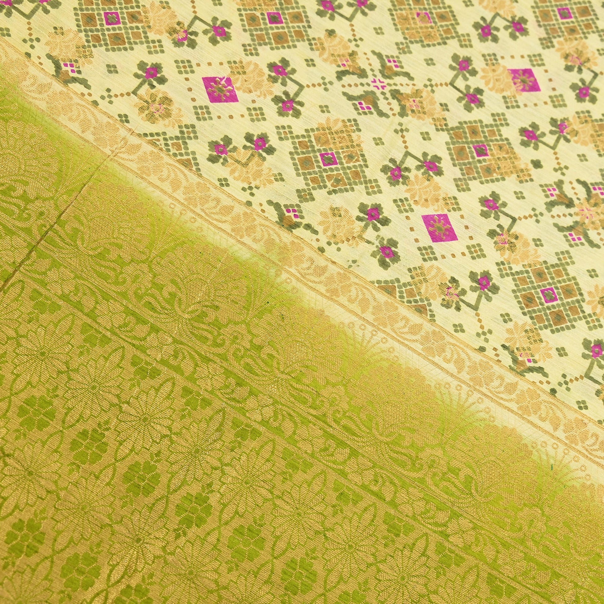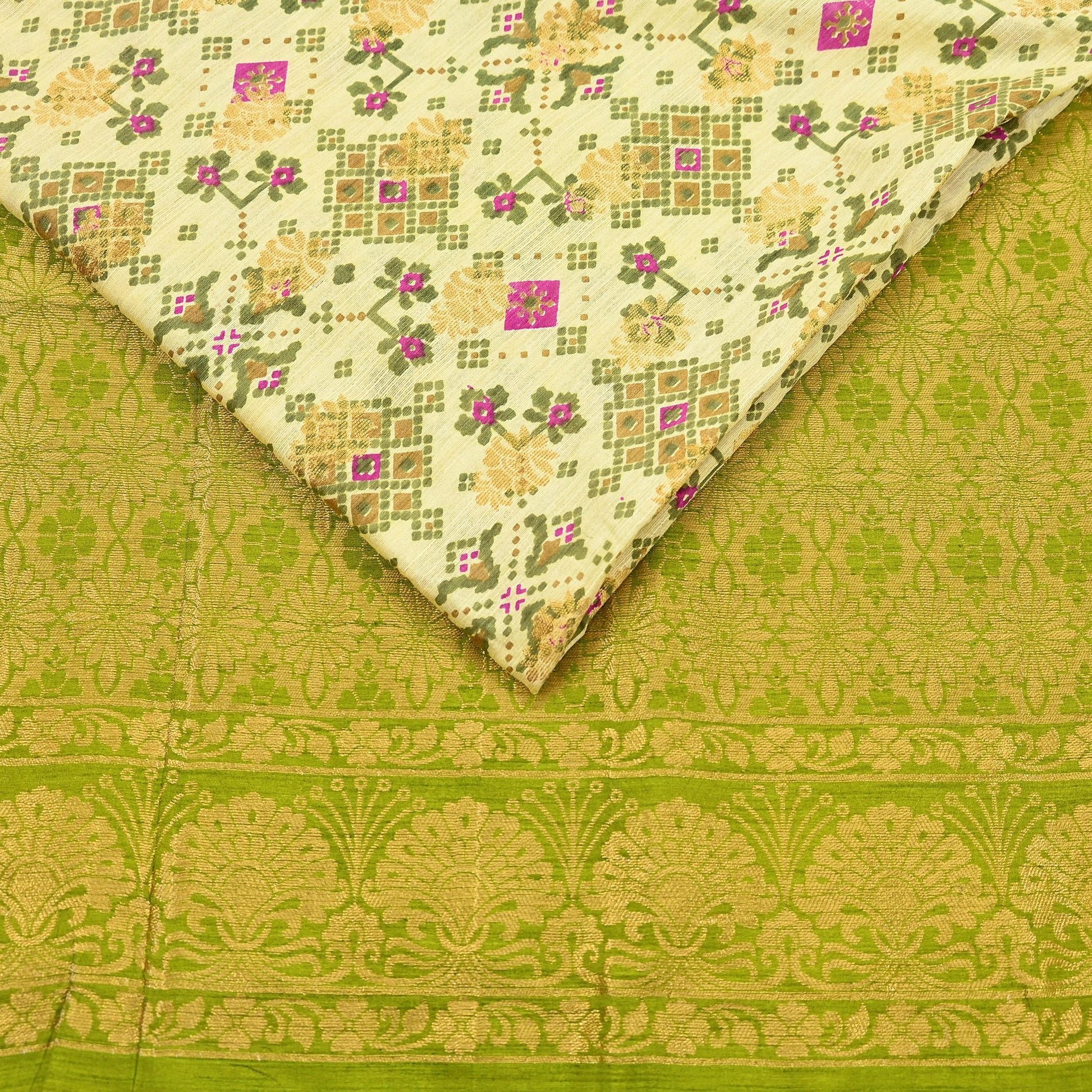 Vintage Heavy Sari Green & Ivory Hand Woven Printed Artificial Silk Sarees Zari 5Yd Floral Craft Fabric Dress making Crafting Quilting
