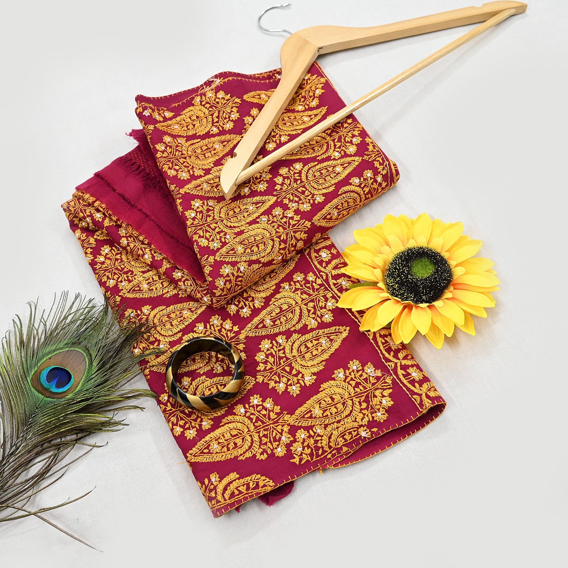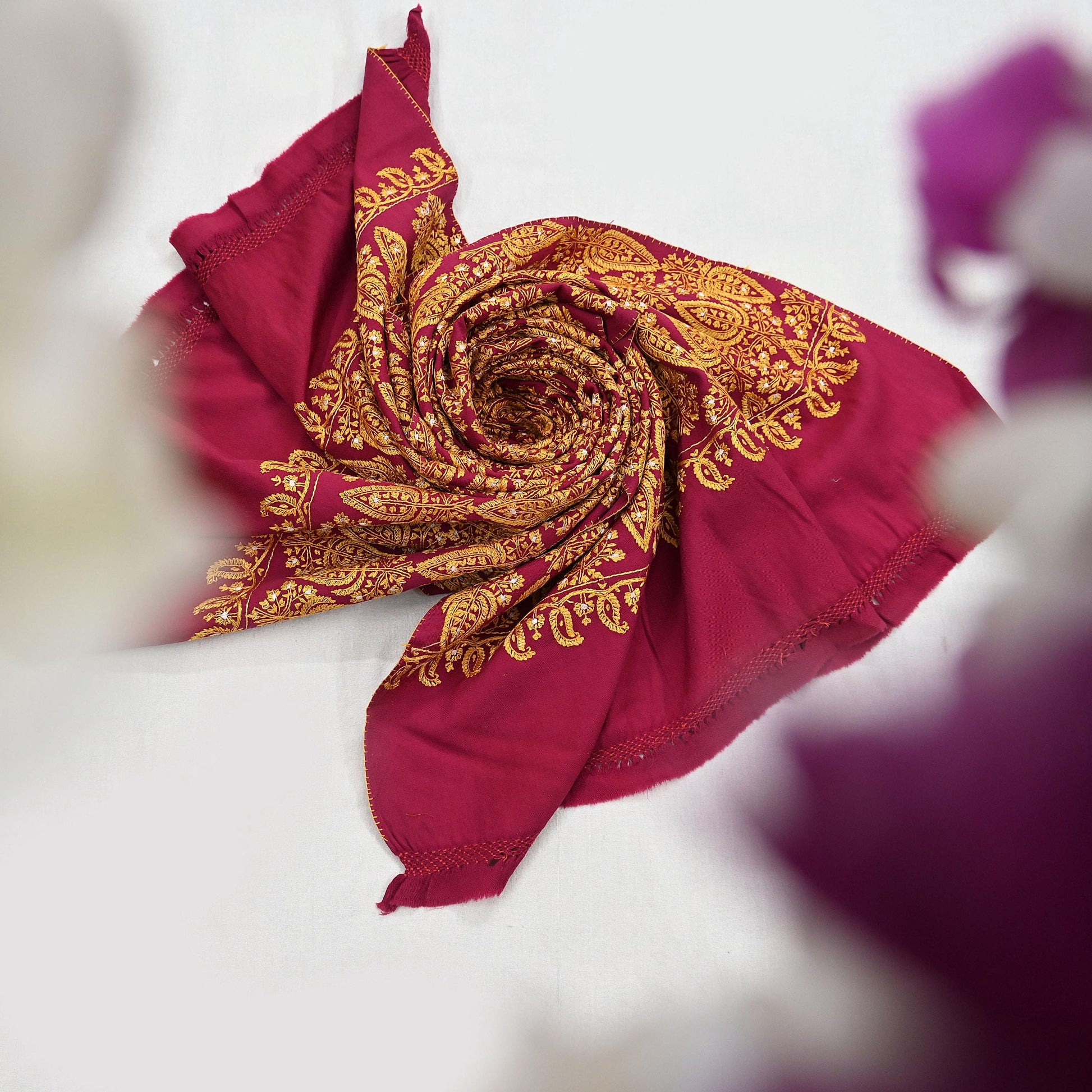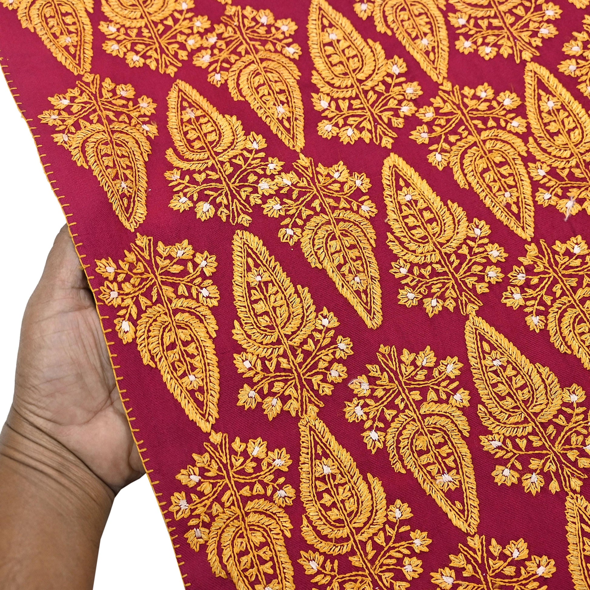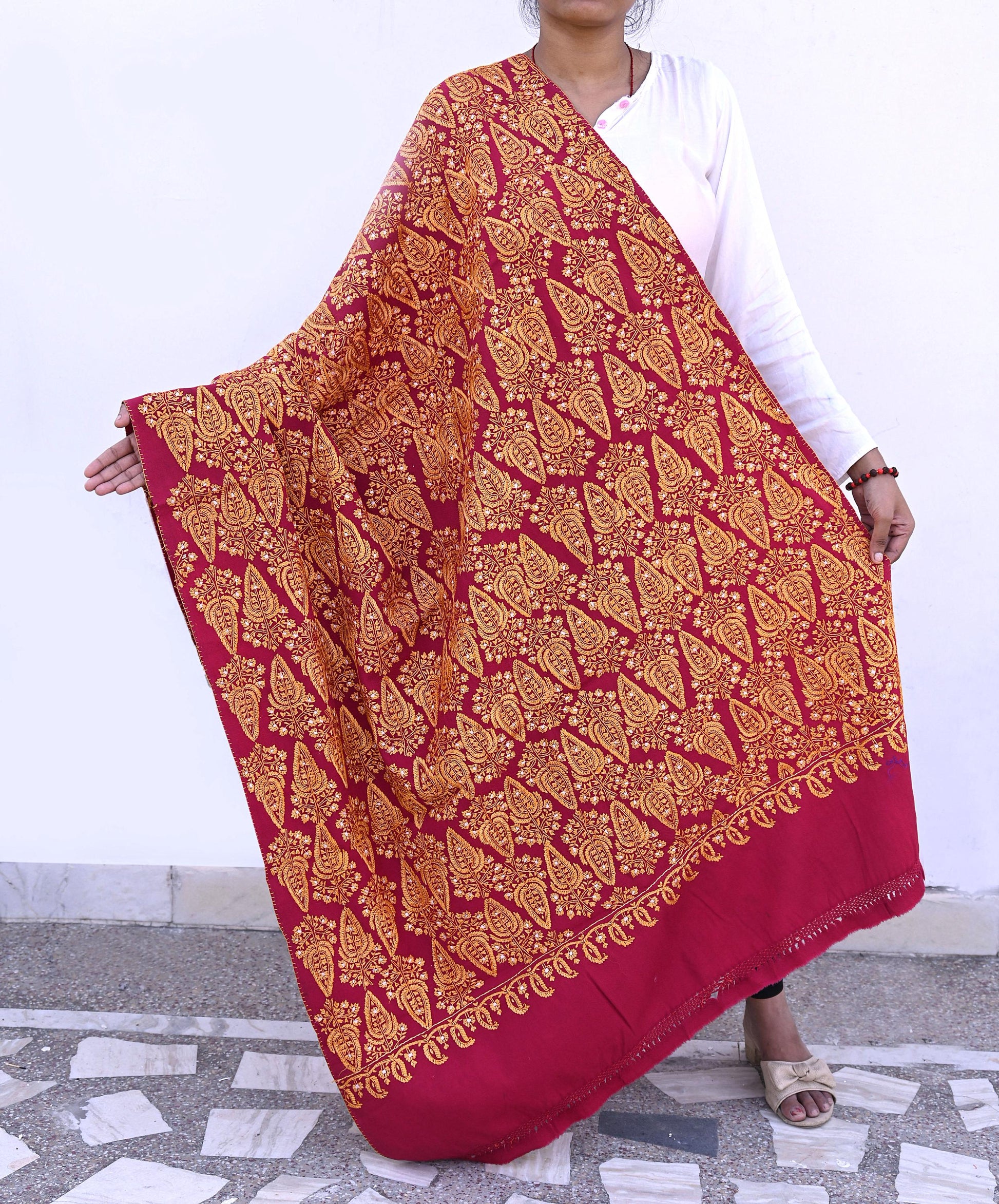 We Are Offering You A Maroon Color 100% Pure Woolen Stole/Shawl Which Adorns Hand Embroidered Work. Center part & Border of this shawl has traditional embroidery with Yellow, Peach & Saffron floral & paisley pattern & Fringes On Both Sides Of The Shawl. This cozy, warm and fuzzy stool is soft against skin due to the mellow woolen fabric. A truly gorgeous piece which will also make an admirable gift.