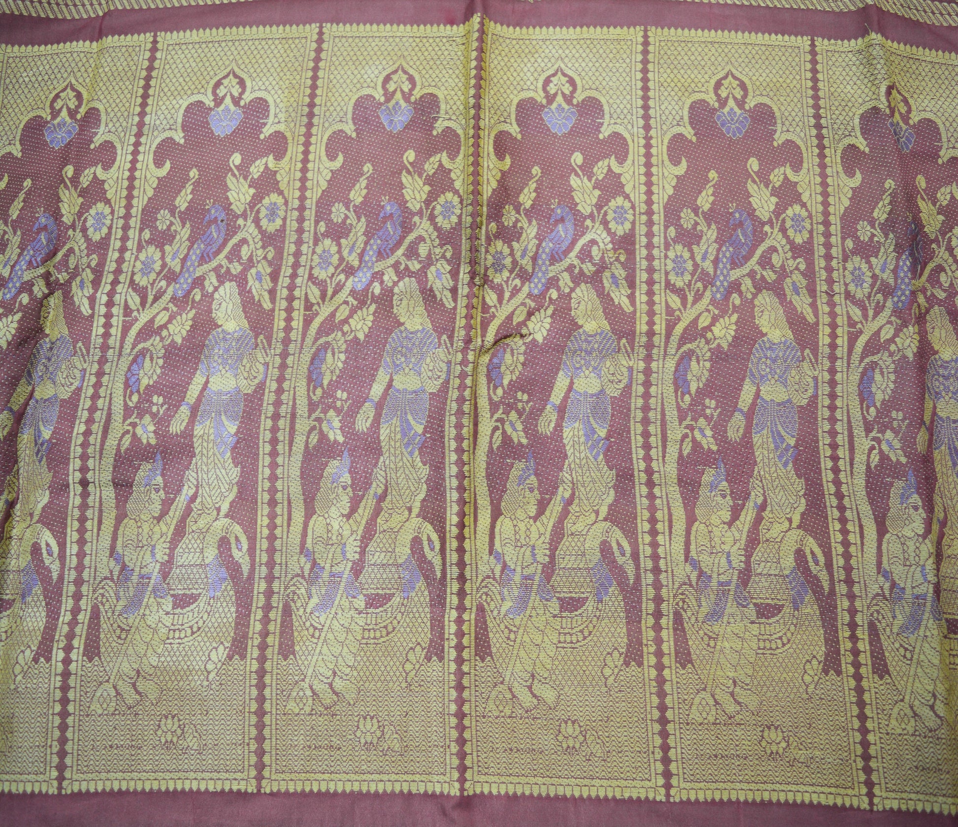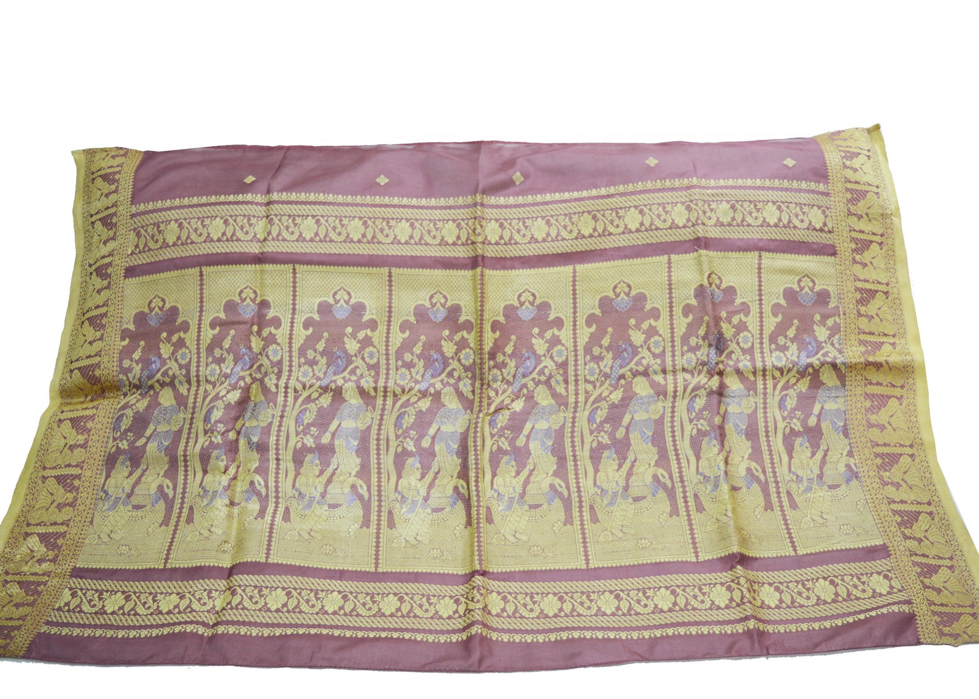 Vintage Pink Art Silk Hand Woven Baluchari Design Fabric 32"X47" Lady Design Crafting Sewing Quilting Peacock