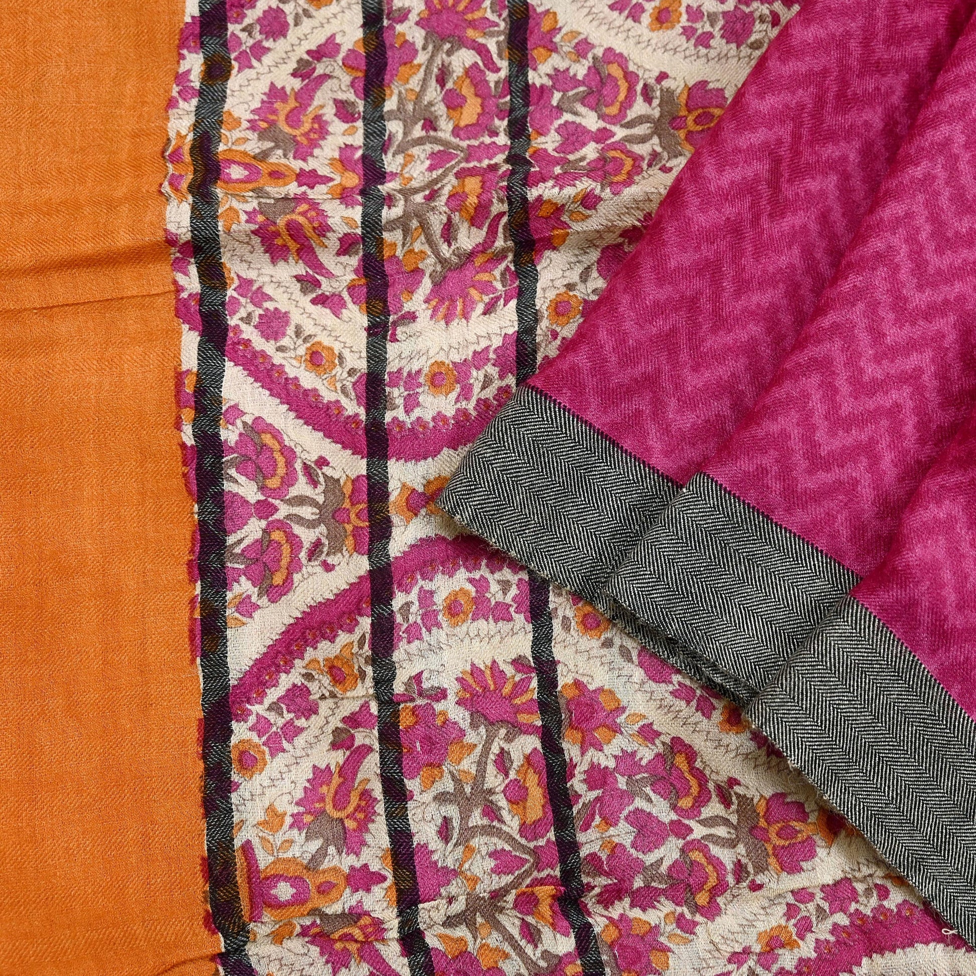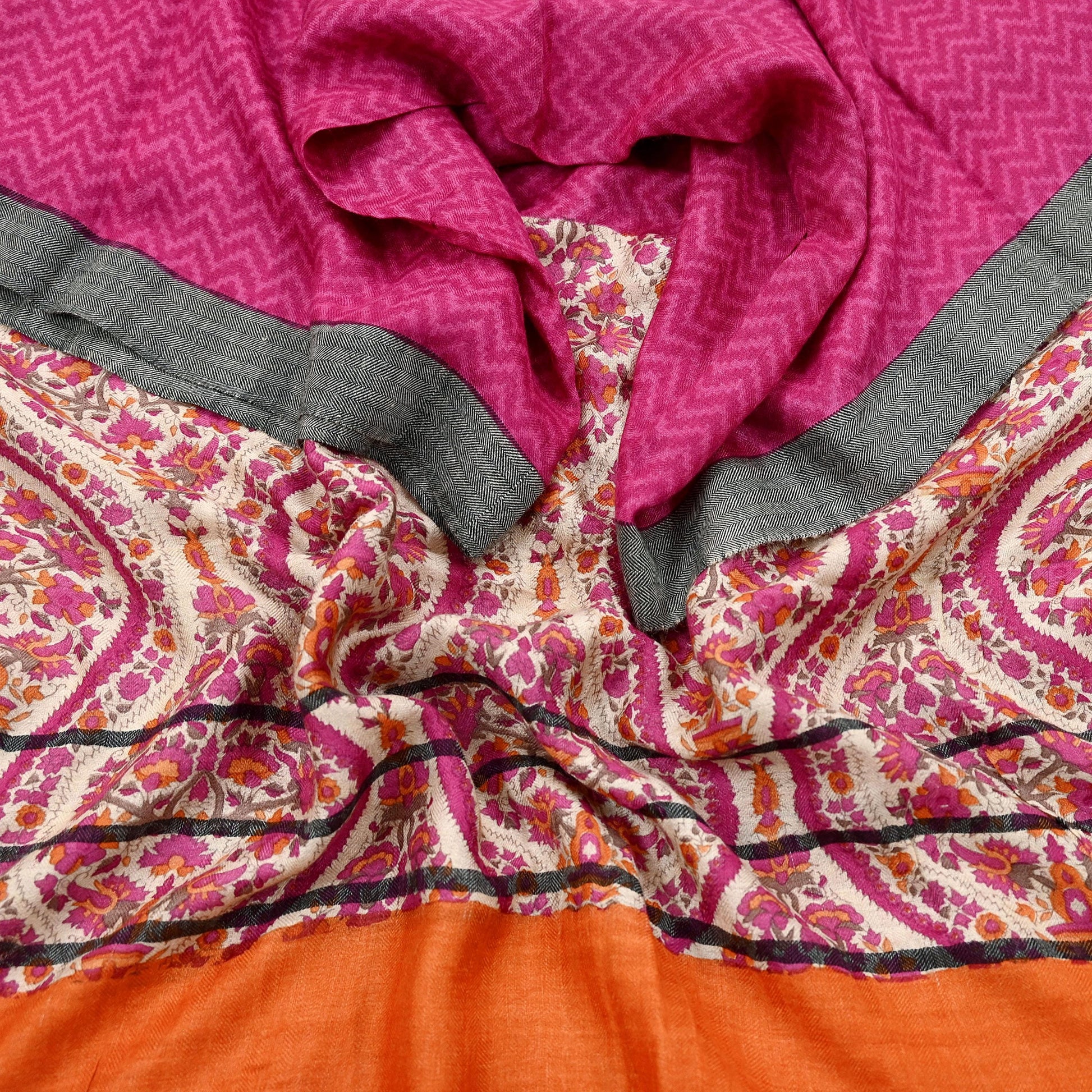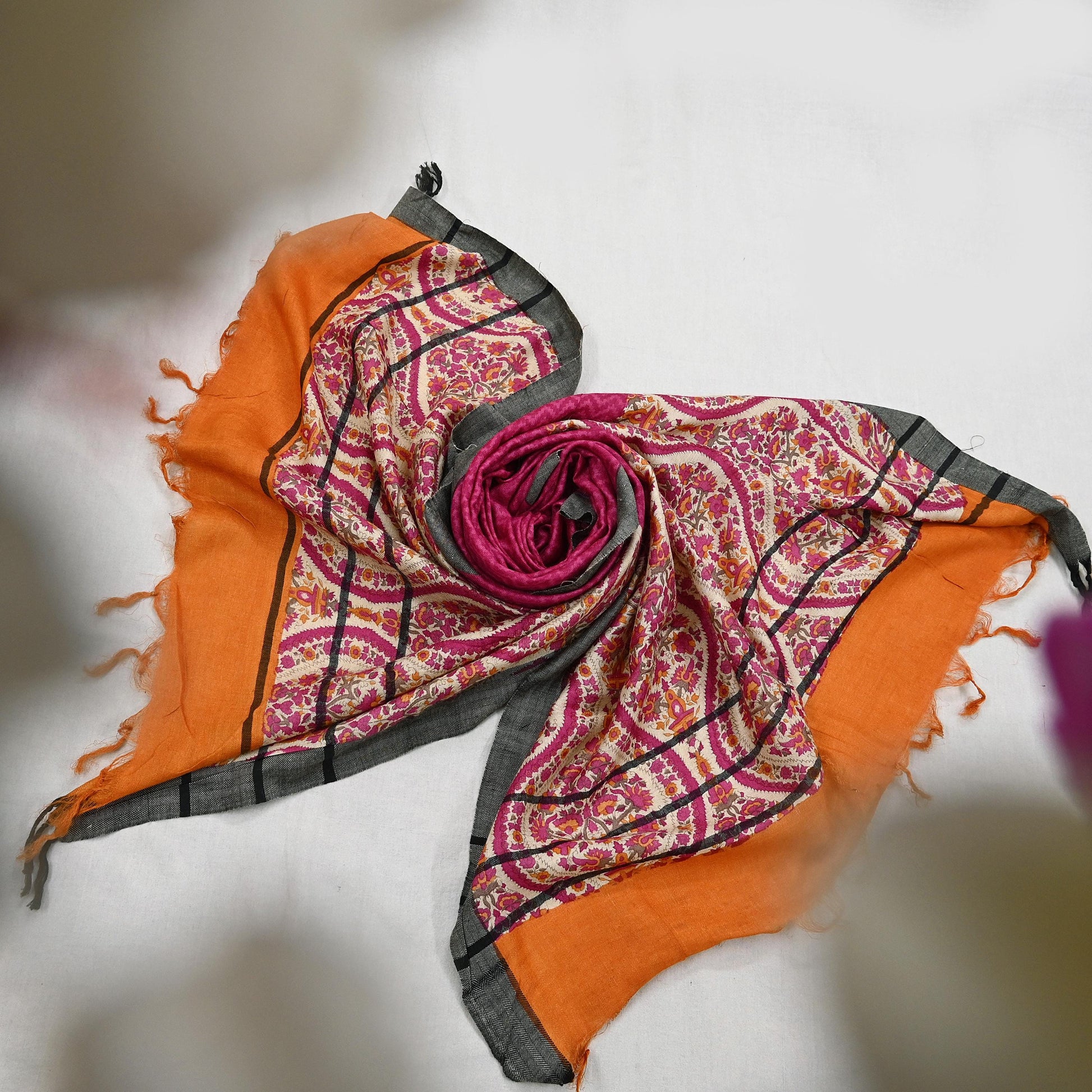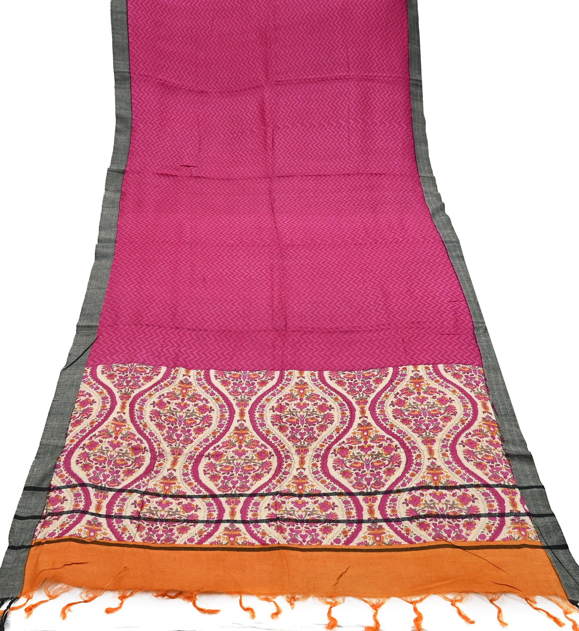 A beautiful vintage pure woolen long scarf/dupatta in Pink & Ivory with printed Stripes and stripe designs, finished with a classic zigzag woven border. The dupatta is enhanced with matching Orange fringes for a traditional touch.