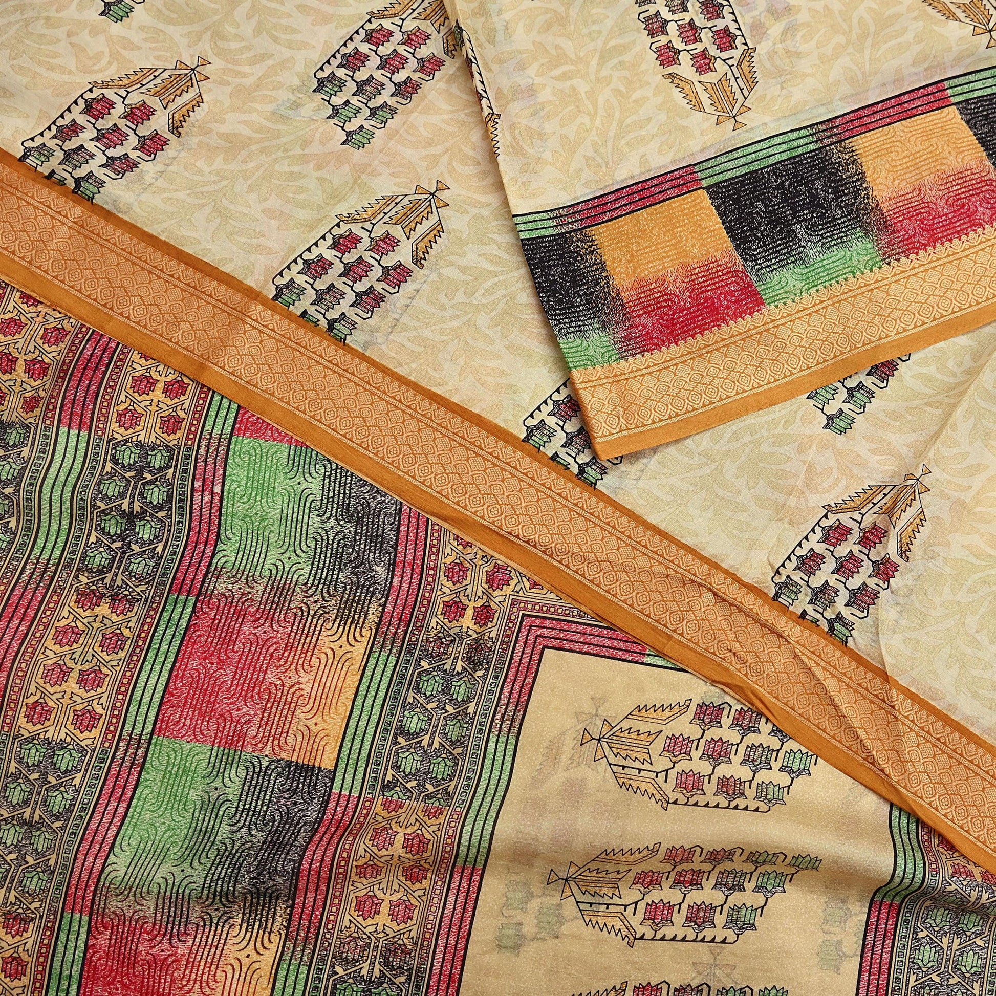 Vintage Sari Beige Pure Silk Printed Saree Fabric 5yard Sewing Soft Dress Designing for Crafting Quilting Upcycle Soft Border