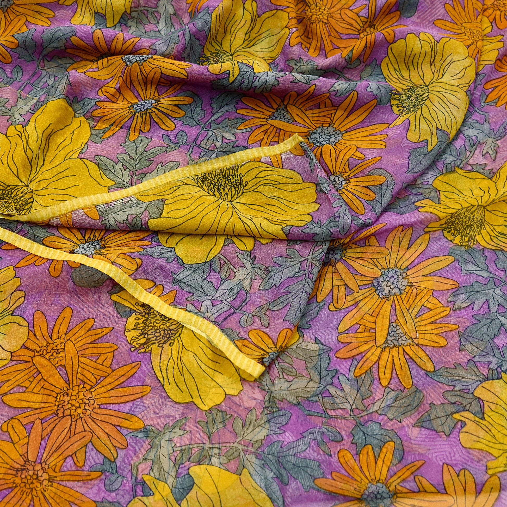 This exquisite vintage saree is crafted in 100% pure chiffon silk, known for its feather-light feel, sheer texture, and elegant fall. The Purple & Saffron base fabric is adorned with beautifully printed floral patterns,