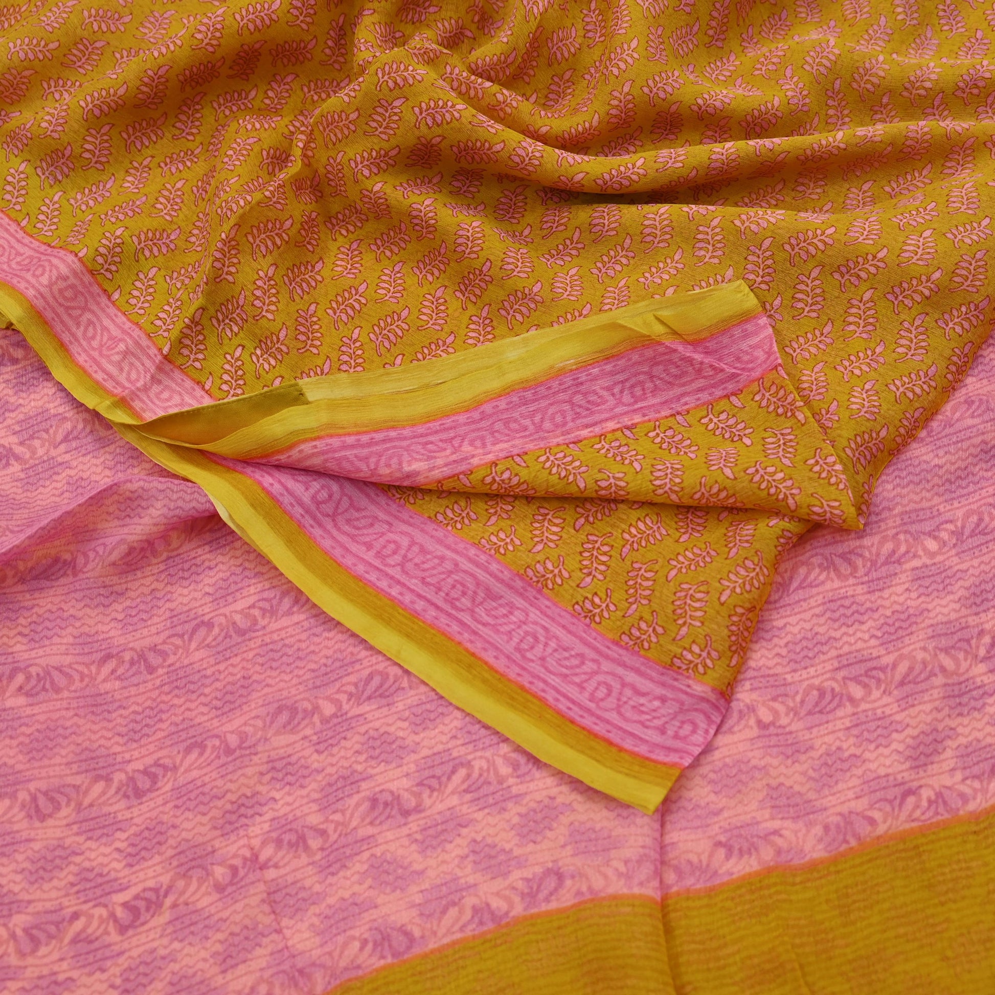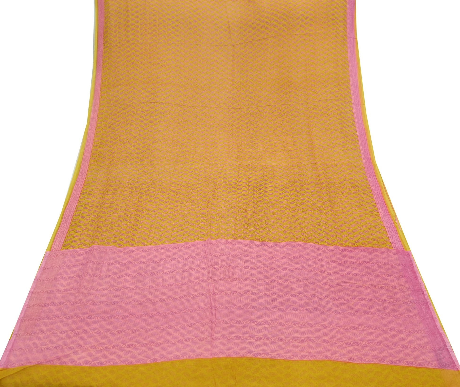 Vintage Sari Yellow & Pink 100% Pure Chiffon Silk Printed Sarees Sewing 5yd Craft Fabric Soft Dress Designing for Crafting Floral