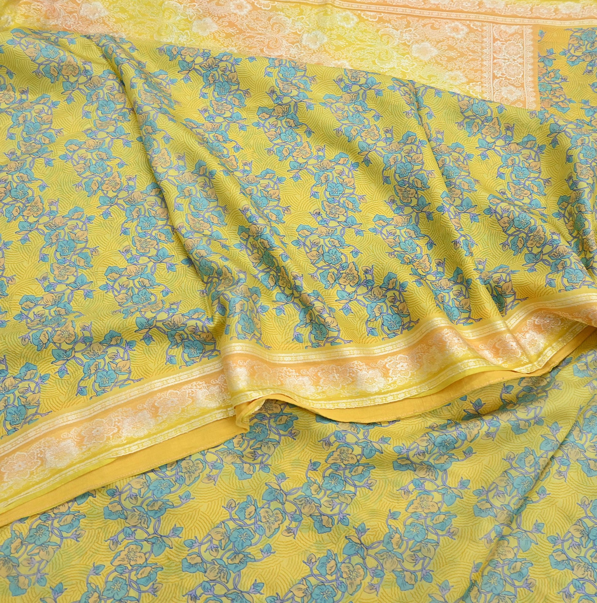 Vintage Sari Yellow Pure Silk Hand Woven Printed Saree Fabric 5yard Sewing Dress Designing for Crafting Quilting Upcycle Soft Border