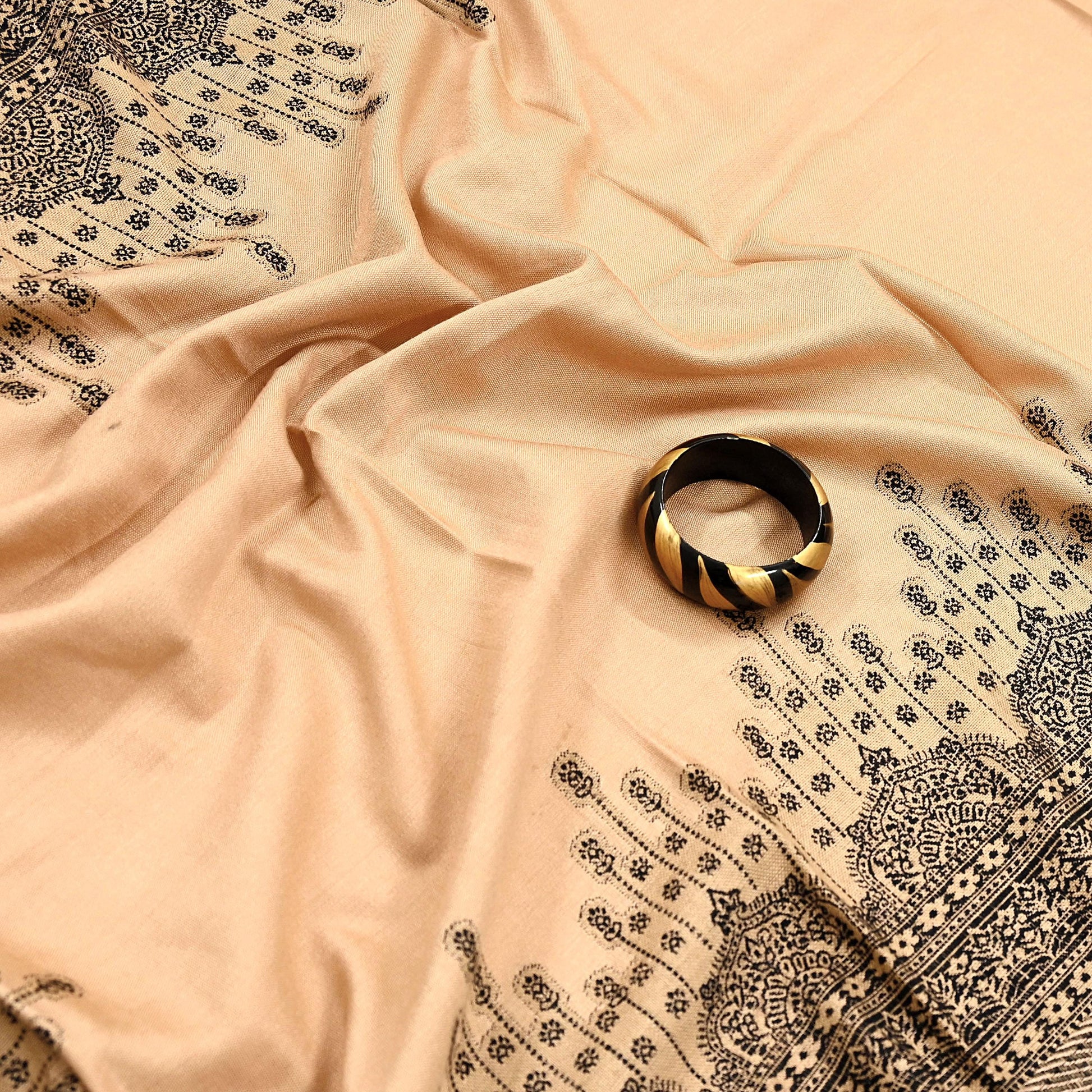 We Are Offering You A Vintage Beige Color Viscose Stole/Shawl Which Adorns Black Hand Woven Work. stole has handmade Traditional Hand Woven work design with floral & Stripes design. stole has matching fringes on both ends of borders. This cozy, warm and fuzzy stool is soft against skin due to the mellow woolen fabric. A truly gorgeous piece which will also make an admirable gift.