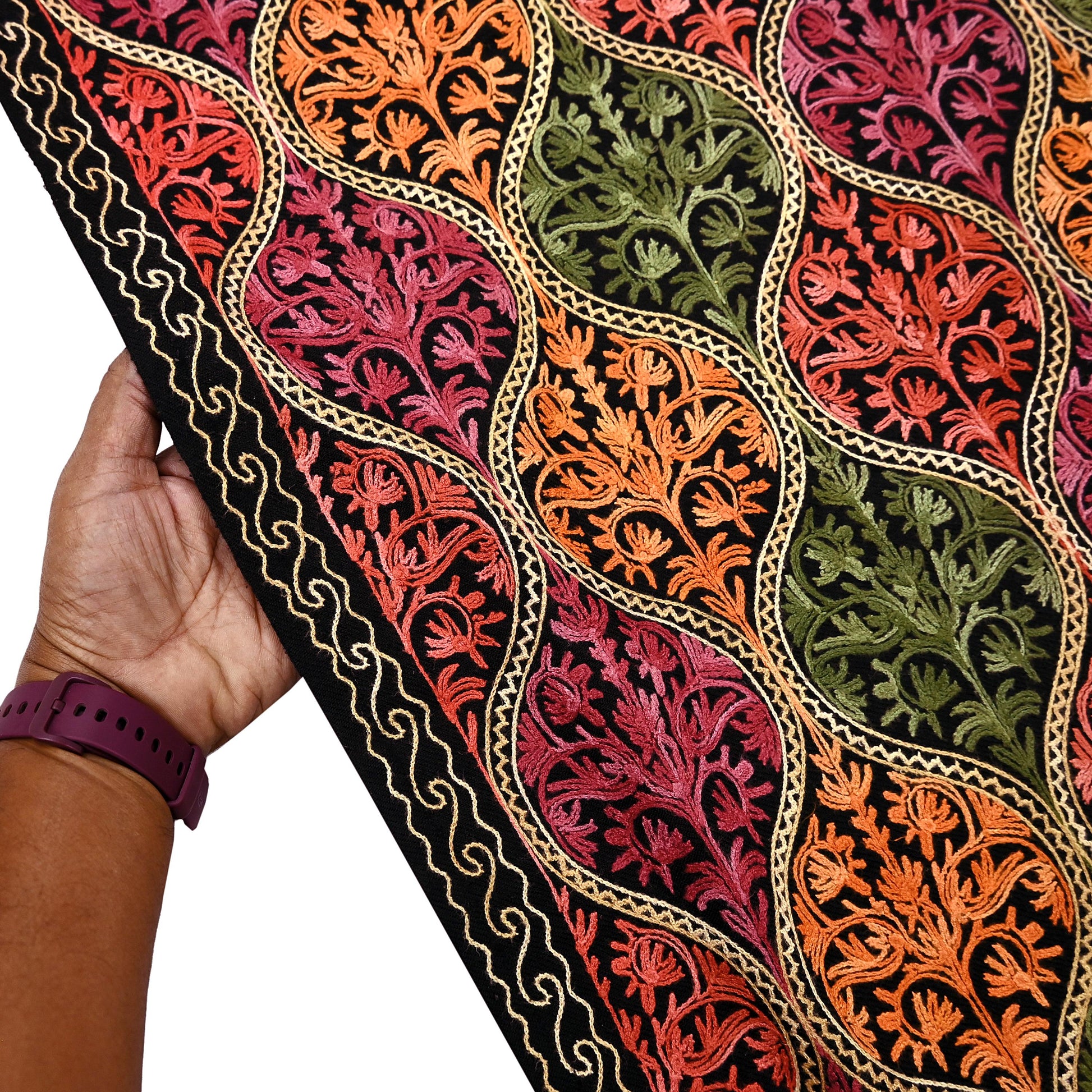 We Are Offering You A Vintage Black Color woolen Stole/Shawl Which Adorns Ari Work. stole has handmade Traditional Multi colored thread ari work design with floral & Stripes design. stole has matching fringes on both ends of borders. This cozy, warm and fuzzy stool is soft against skin due to the mellow woolen fabric. A truly gorgeous piece which will also make an admirable gift.