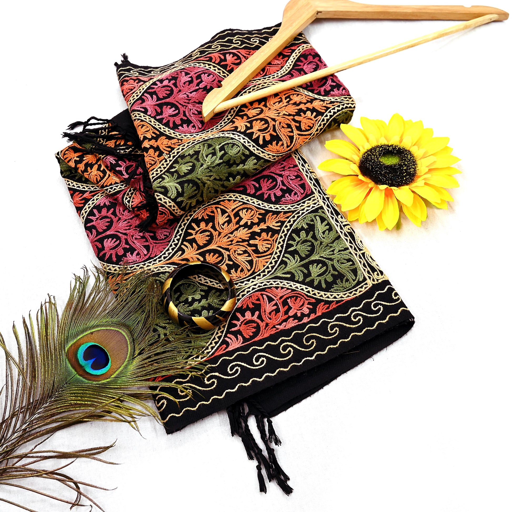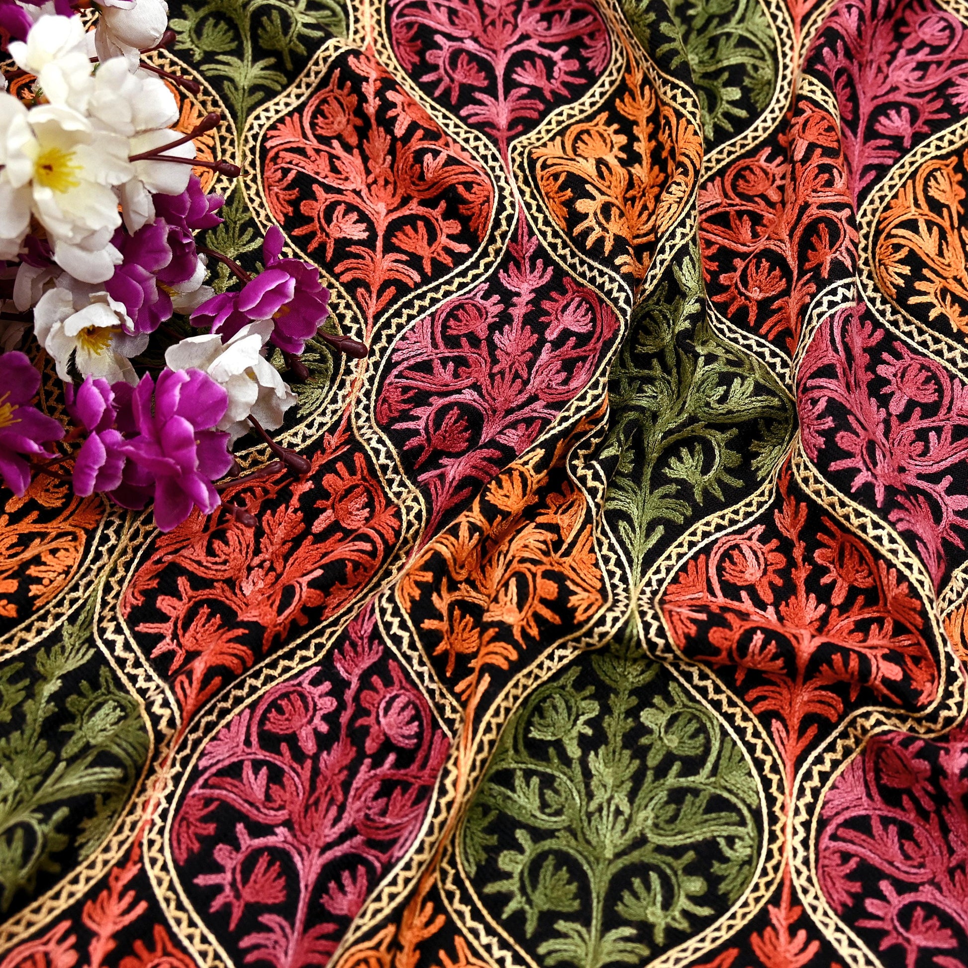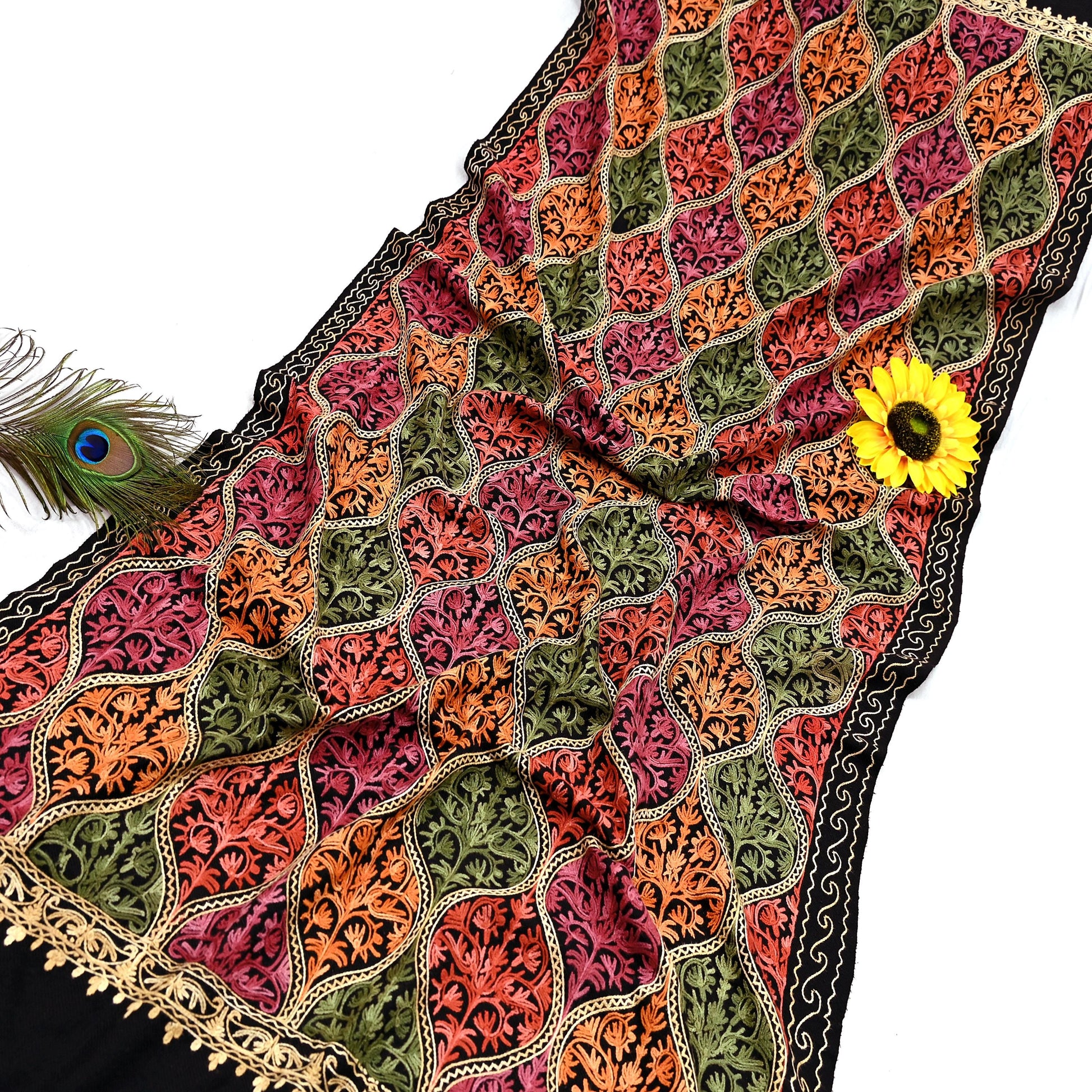 Vintage Stole Black woolen Handmade Ari work Long Throw Warm Stole Floral Design Fringes