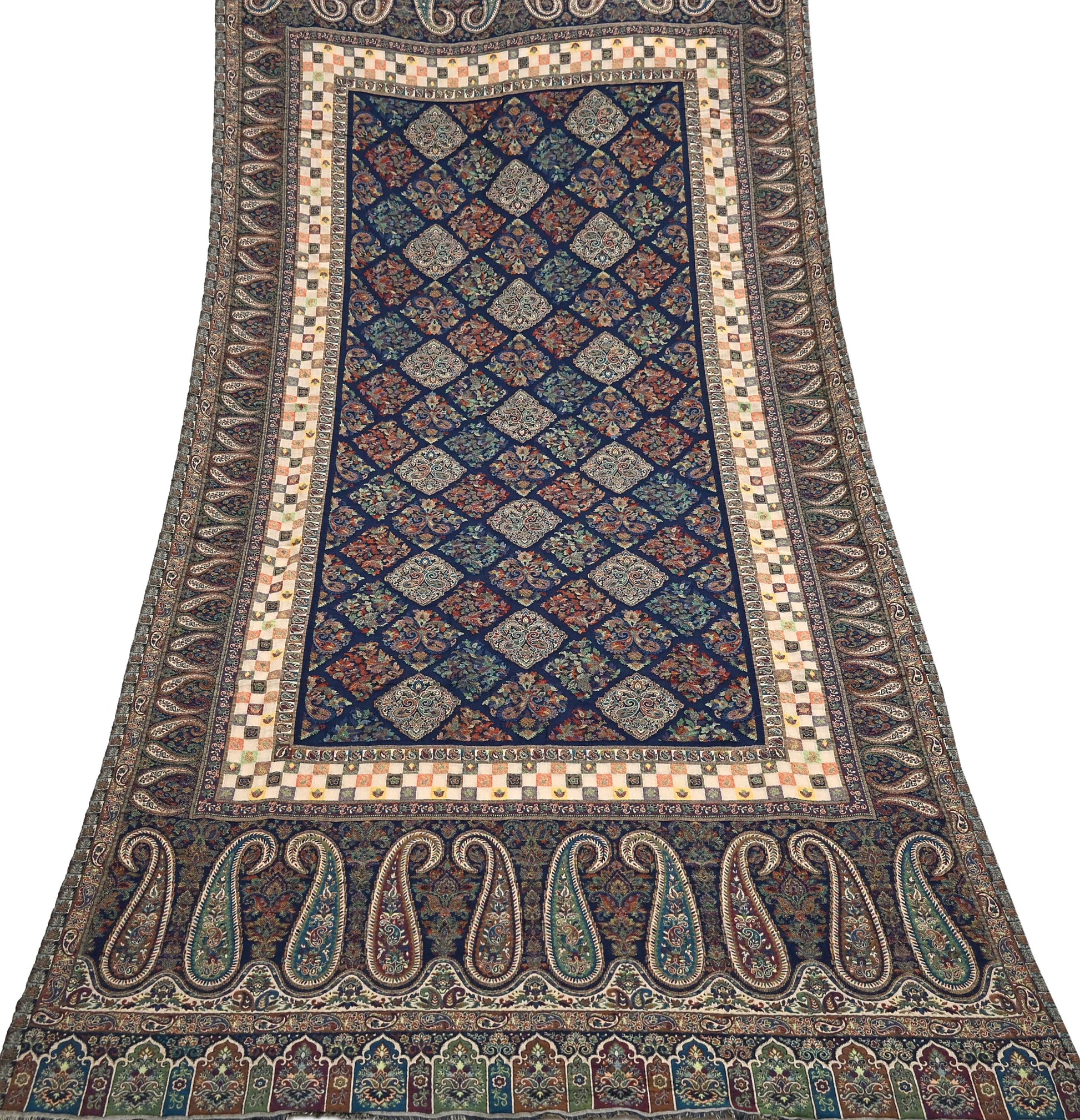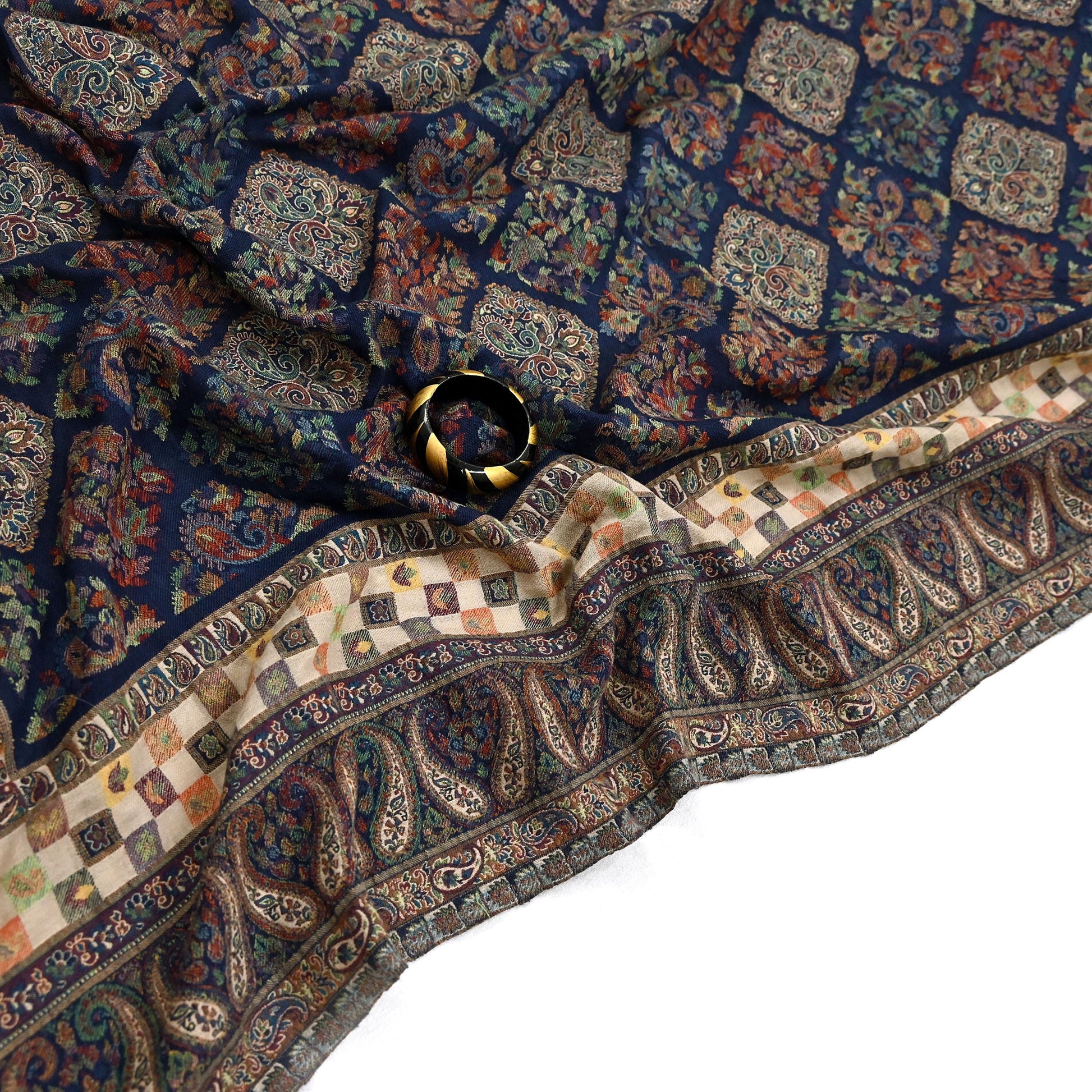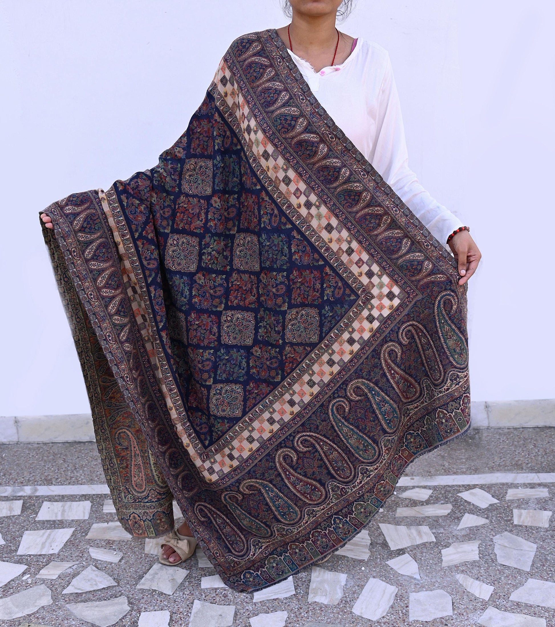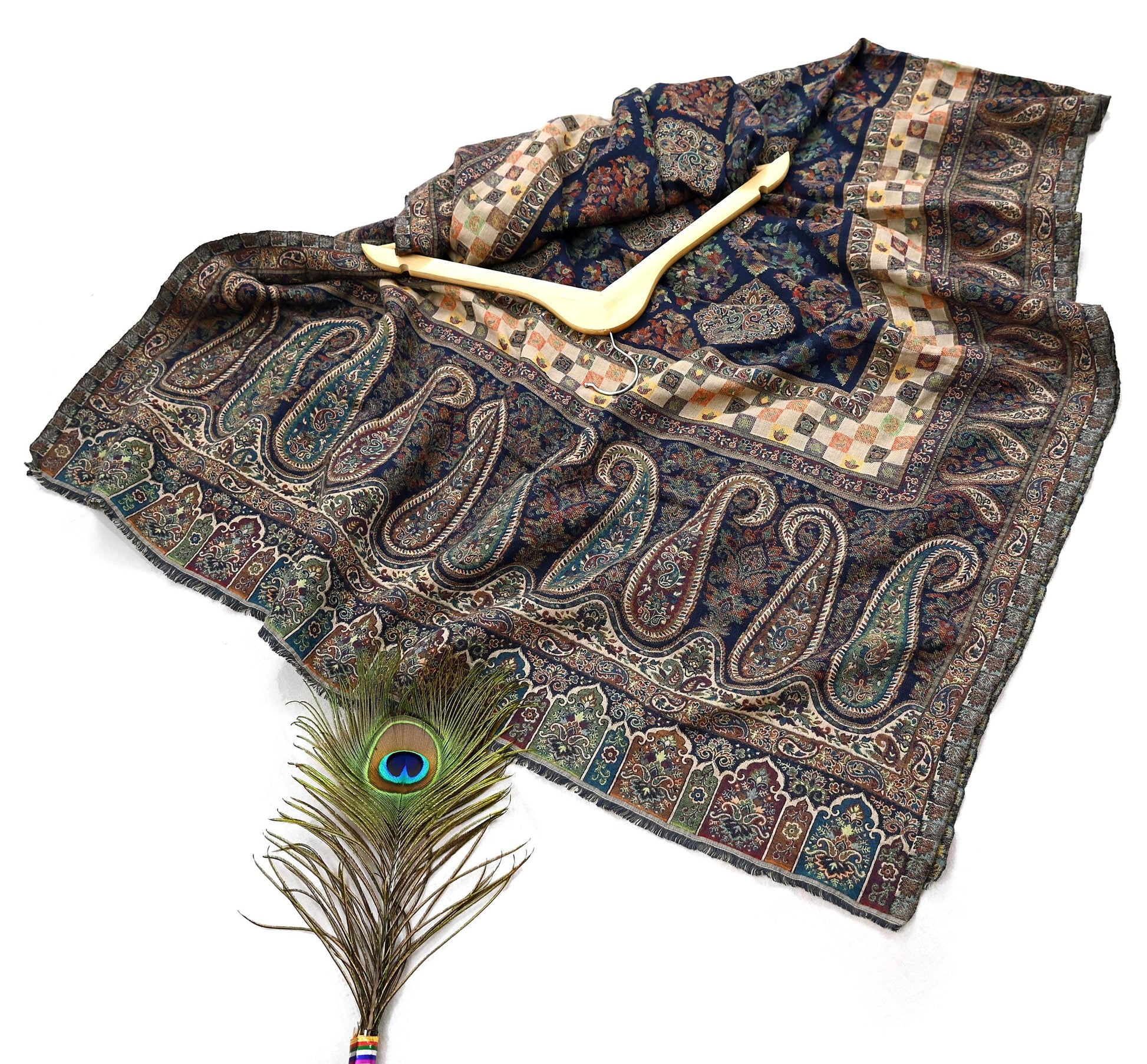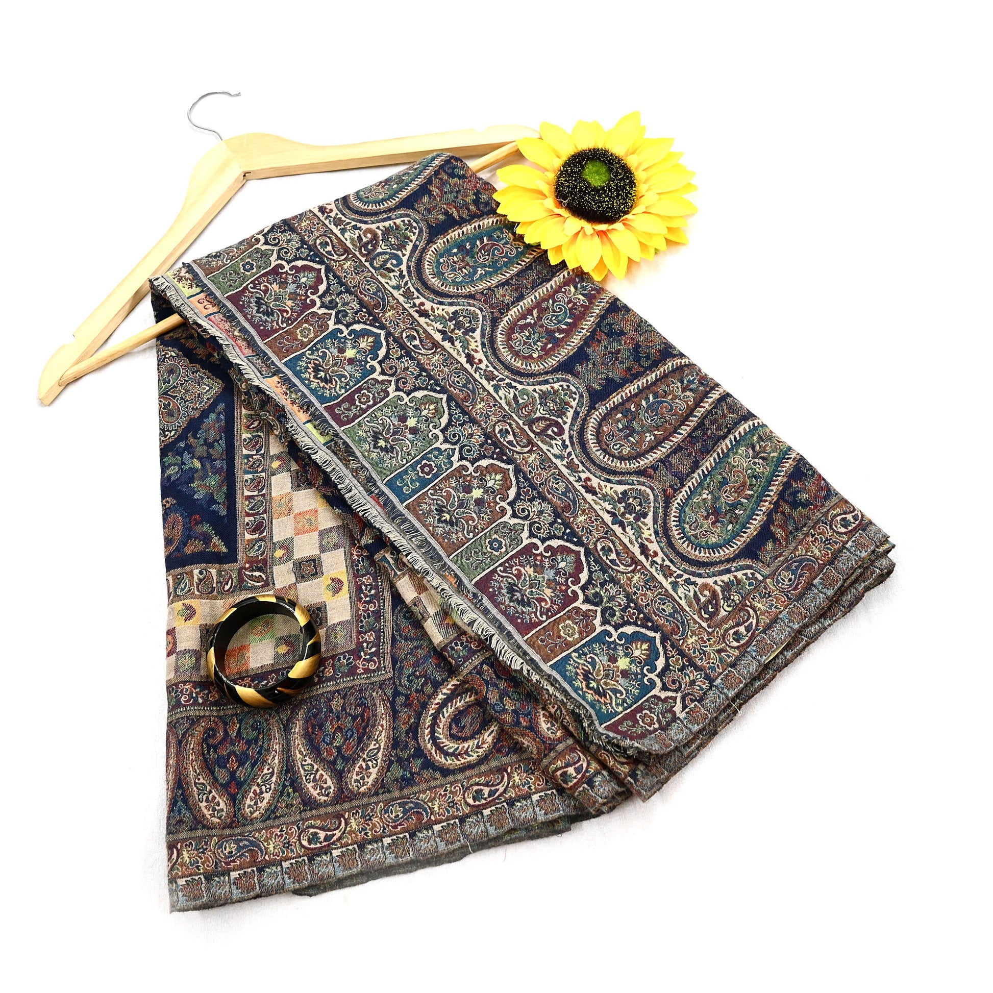 Vintage Stole Blue woolen Handmade Jamawar work Long Throw Warm Stole Paisley Design Fringes