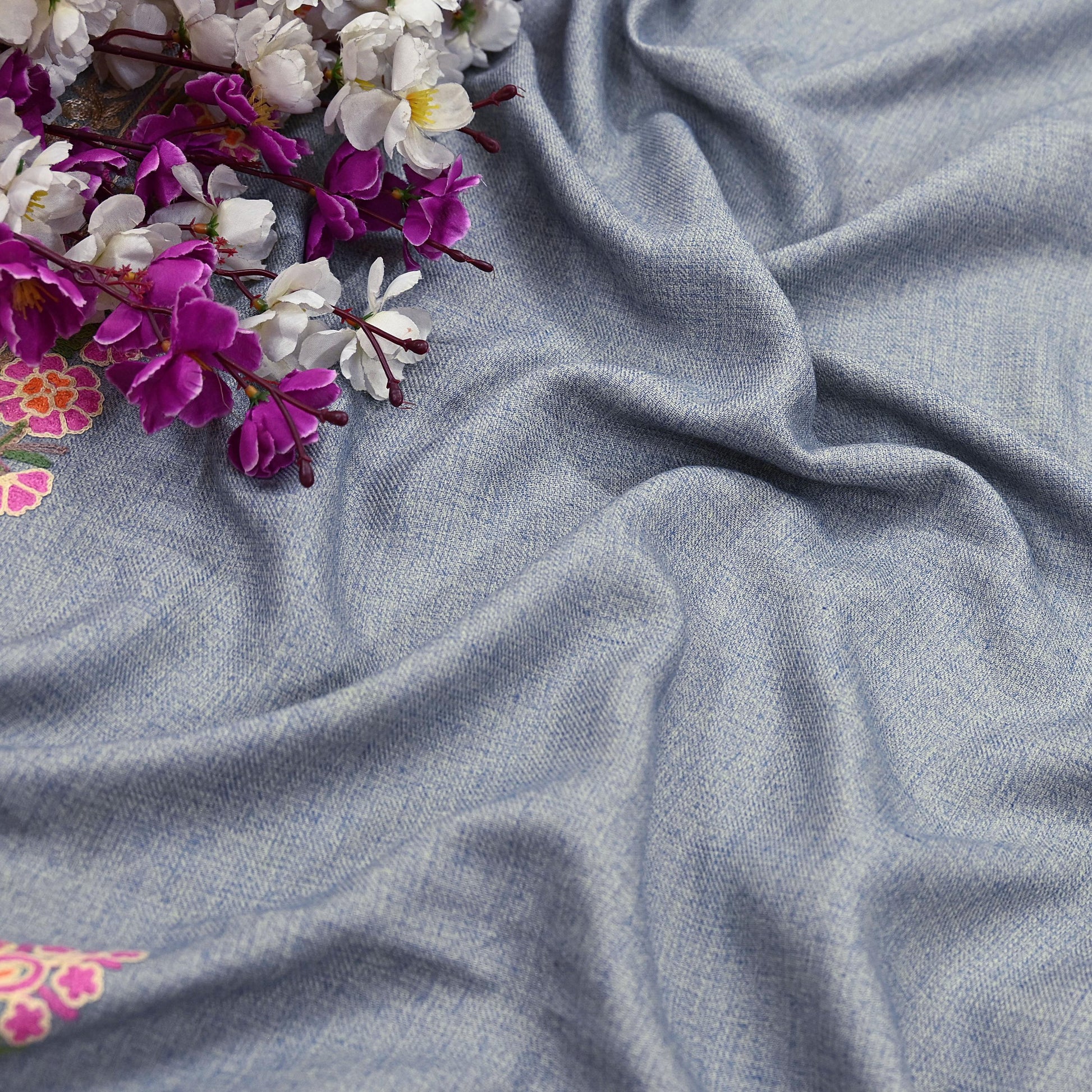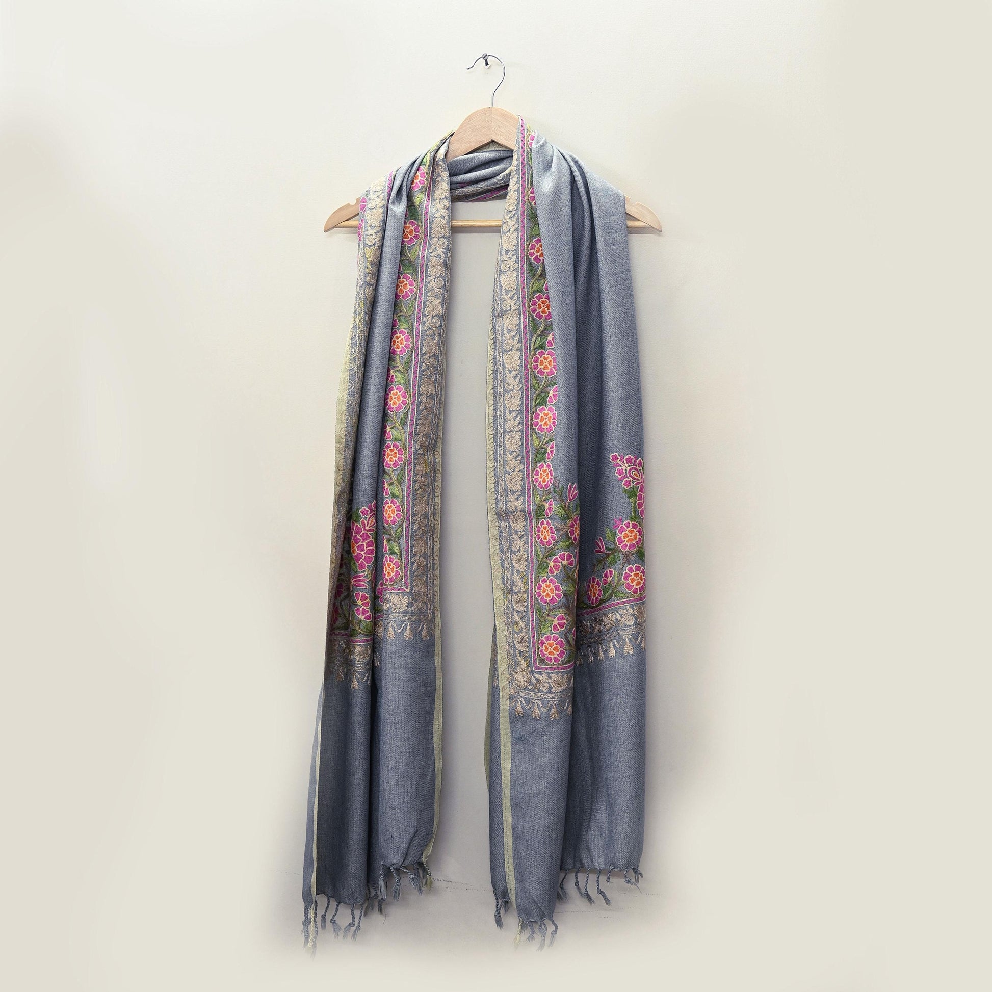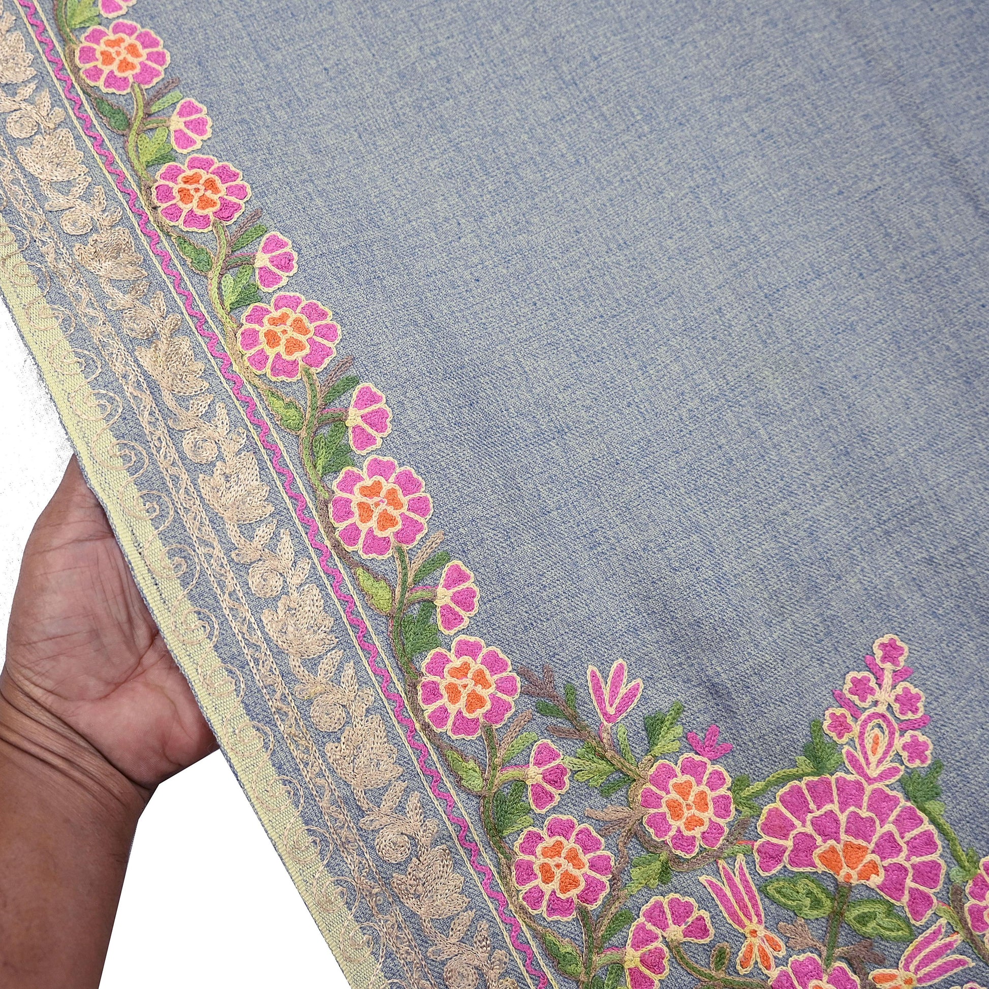 We Are Offering You A Vintage Gray Color Viscose Stole/Shawl Which Adorns Ari Work. stole has handmade Traditional Multi colored thread ari work design with floral & Stripes design. stole has matching fringes on both ends of borders. This cozy, warm and fuzzy stool is soft against skin due to the mellow woolen fabric. A truly gorgeous piece which will also make an admirable gift.