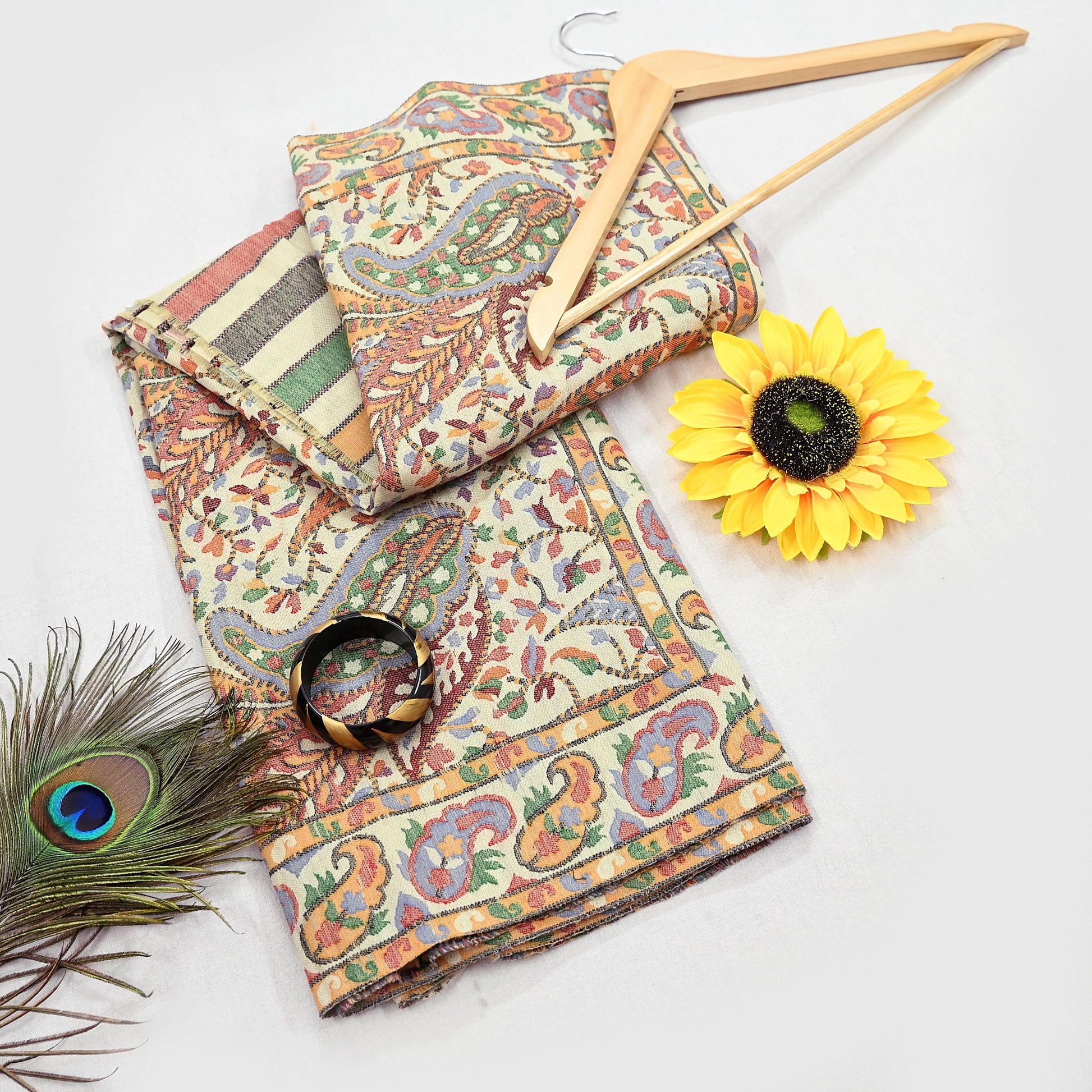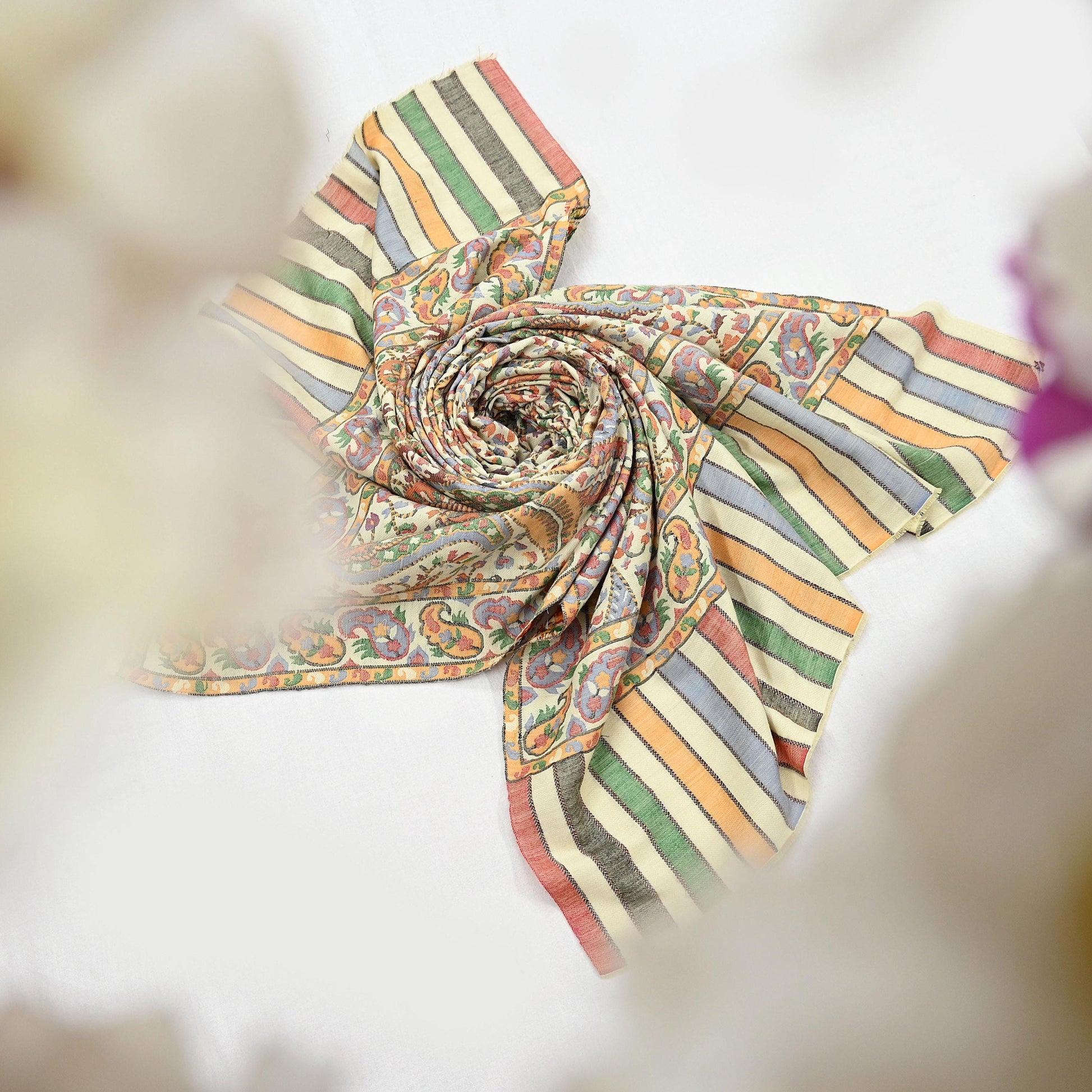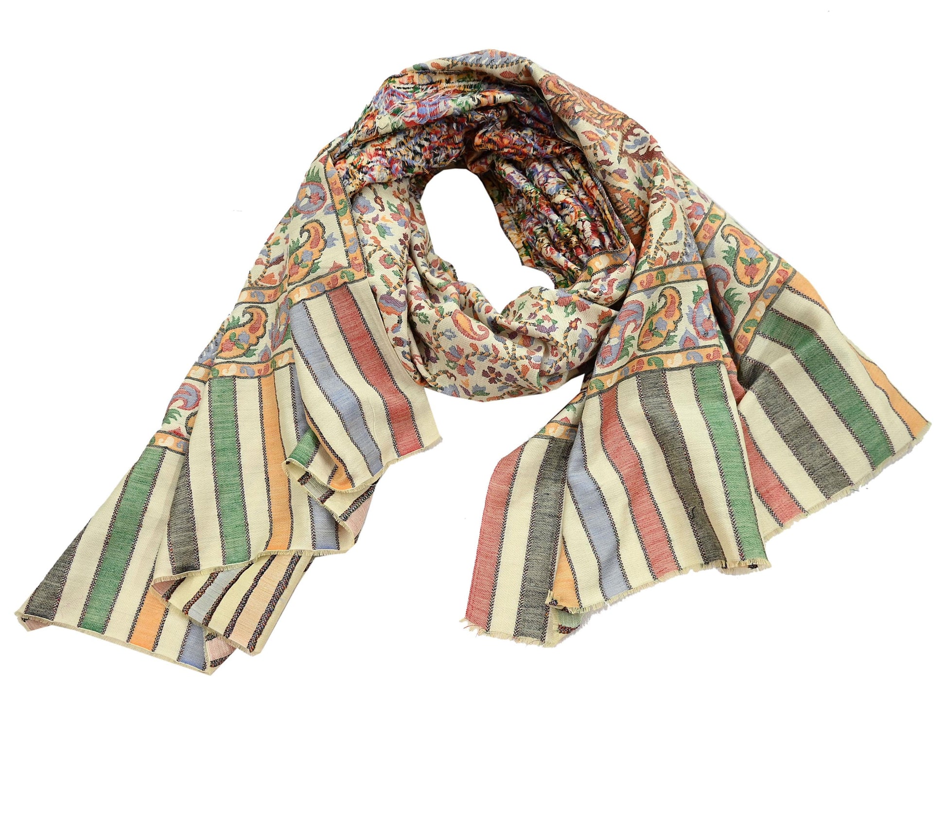 We Are Offering You A Vintage Ivory Color woolen Stole/Shawl Which Adorns Jamawar Work. stole has handmade Jamawar Traditional Multi colored thread Jamawar work Stripes design with floral & Paisley design. stole has matching fringes on both ends of borders. This cozy, warm and fuzzy stool is soft against skin due to the mellow woolen fabric. A truly gorgeous piece which will also make an admirable gift.