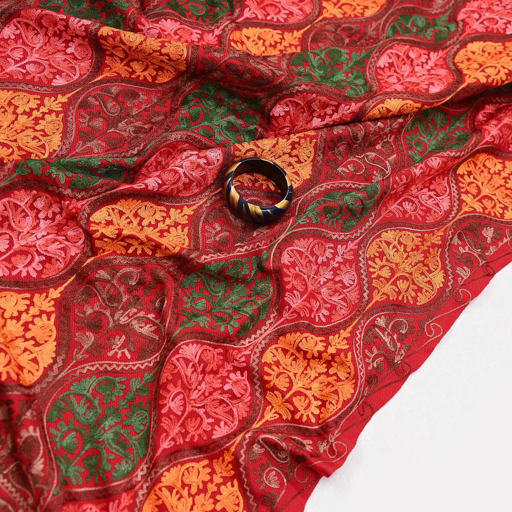 Vintage Stole Red Viscose Handmade Ari work Long Throw Warm Stole Floral Design Fringes