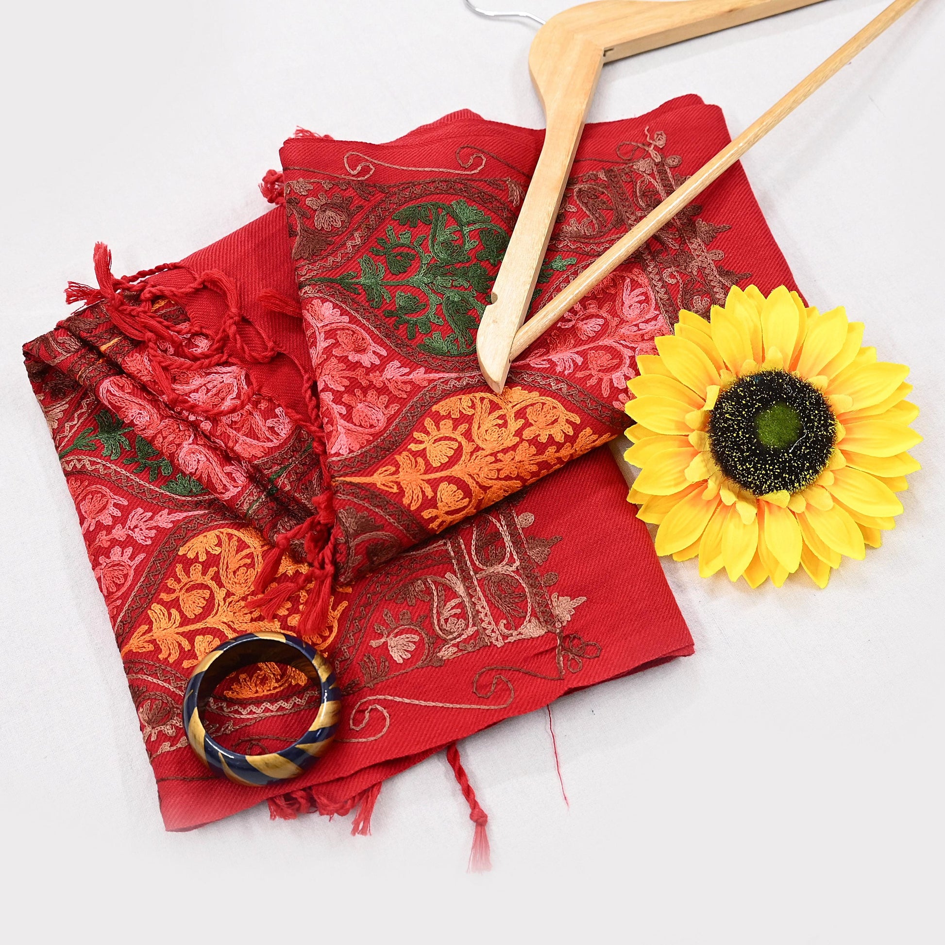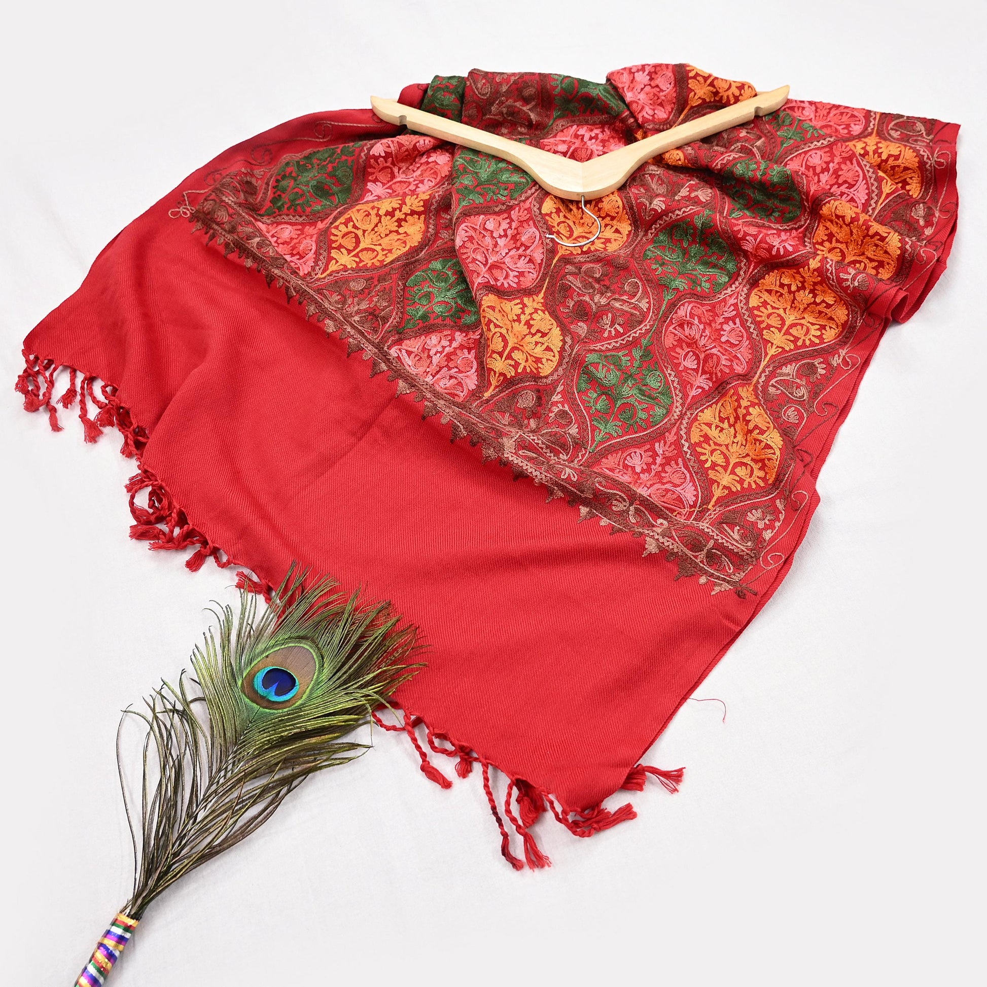 We Are Offering You A Vintage Red Color Viscose Stole/Shawl Which Adorns Ari Work. stole has handmade Traditional Multi colored thread ari work design with floral & Stripes design. stole has matching fringes on both ends of borders. This cozy, warm and fuzzy stool is soft against skin due to the mellow woolen fabric. A truly gorgeous piece which will also make an admirable gift.