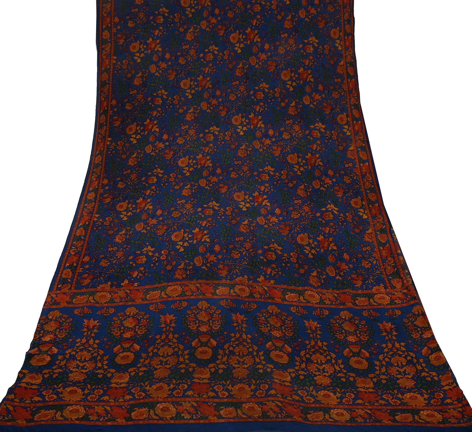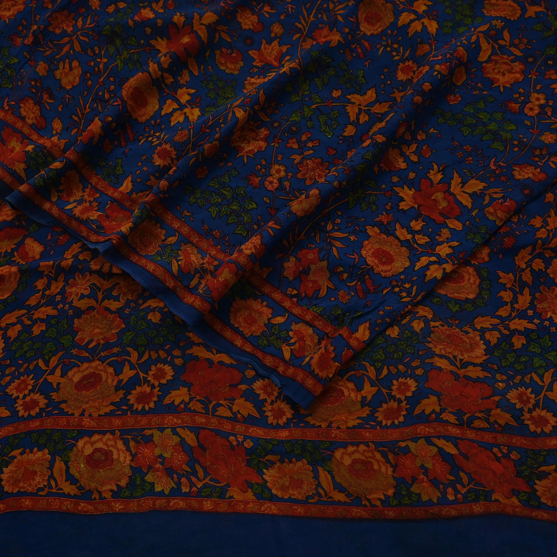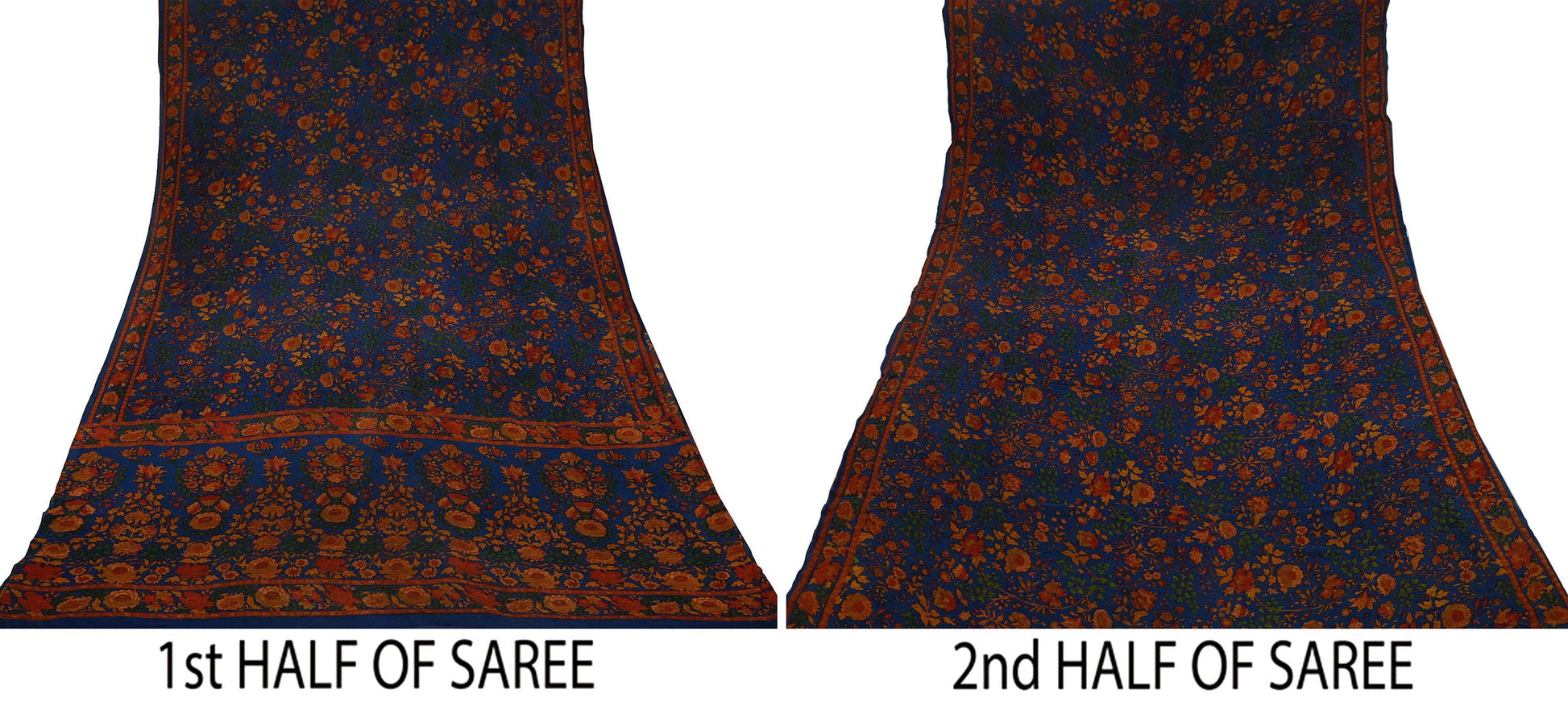 Women Indian Vintage Sari Blue Pure Georgette Silk Printed Sarees Craft Fabric Sewing 5Yd Soft Dress Making Quilting Crafting