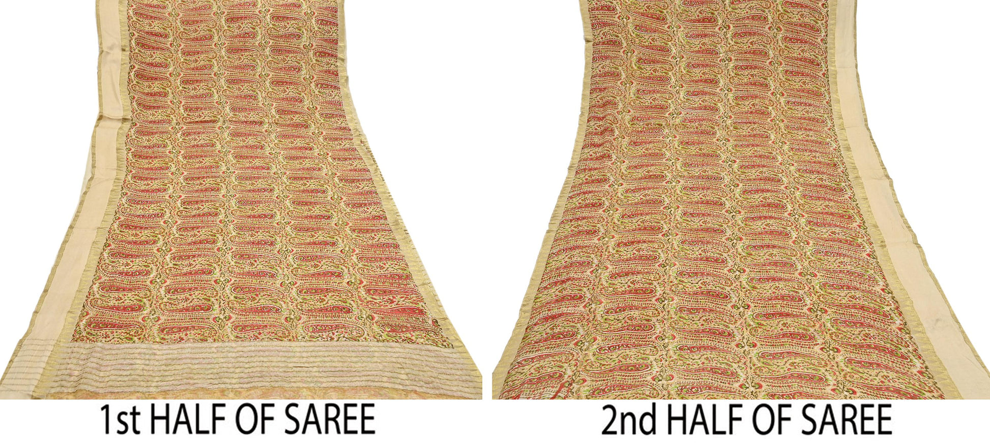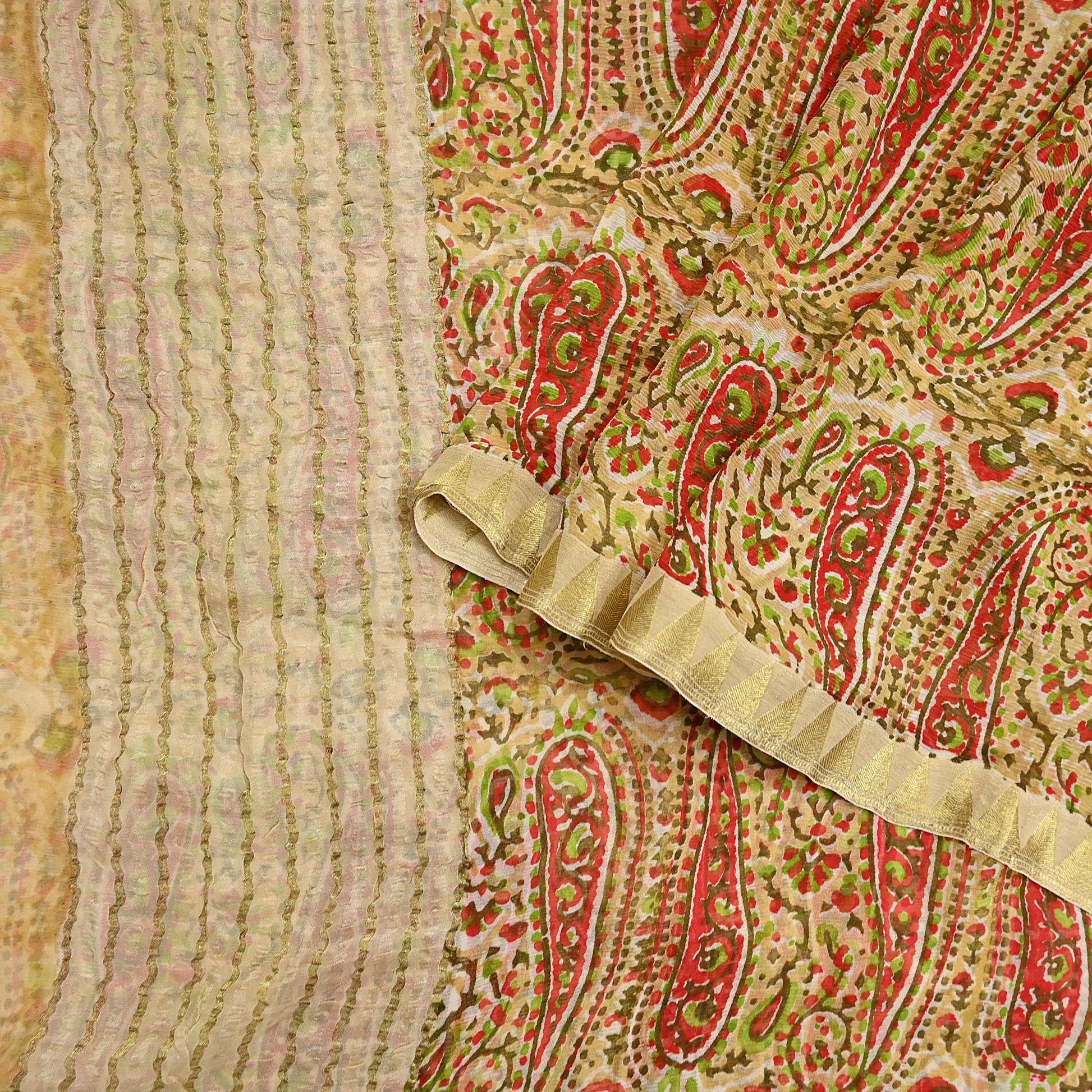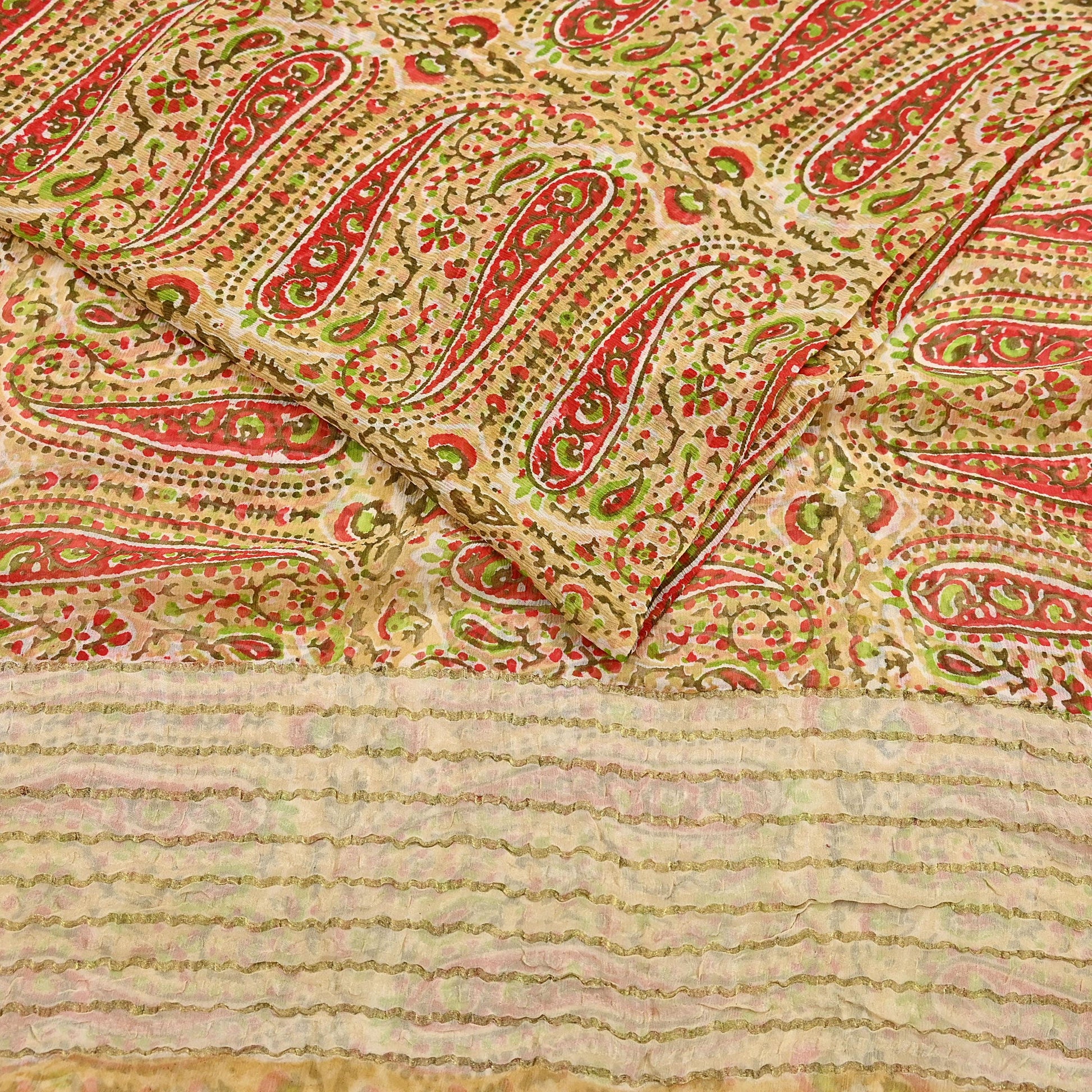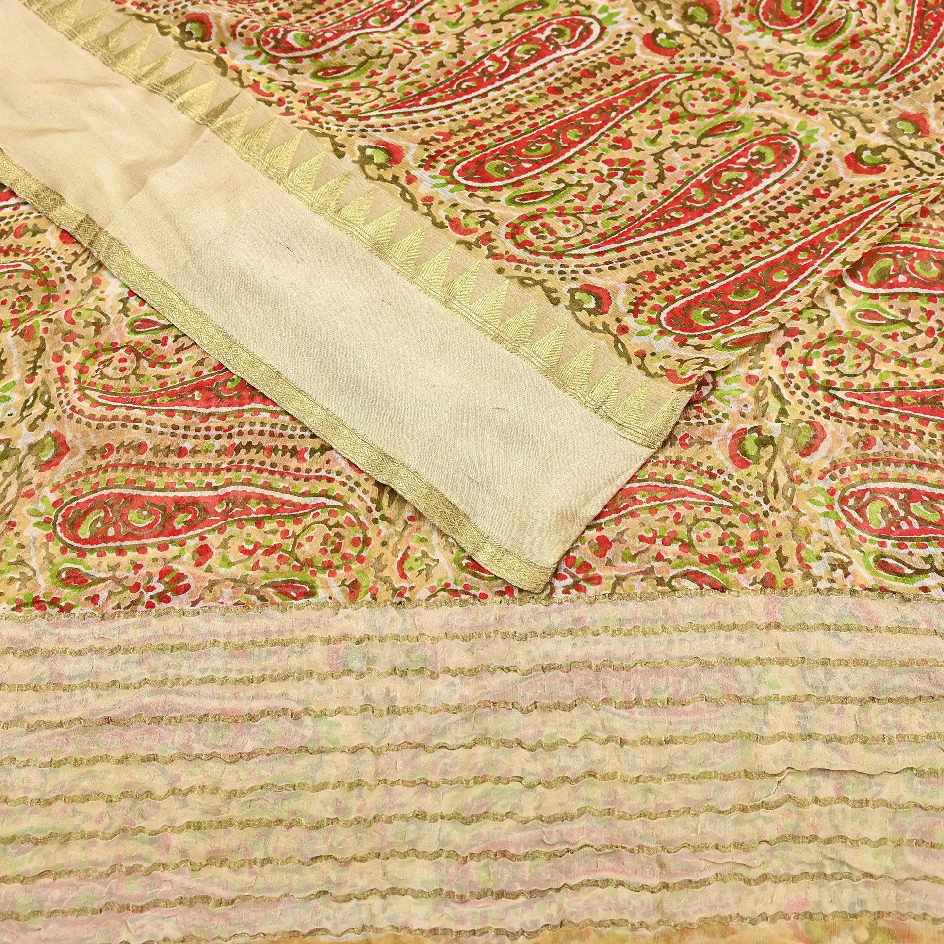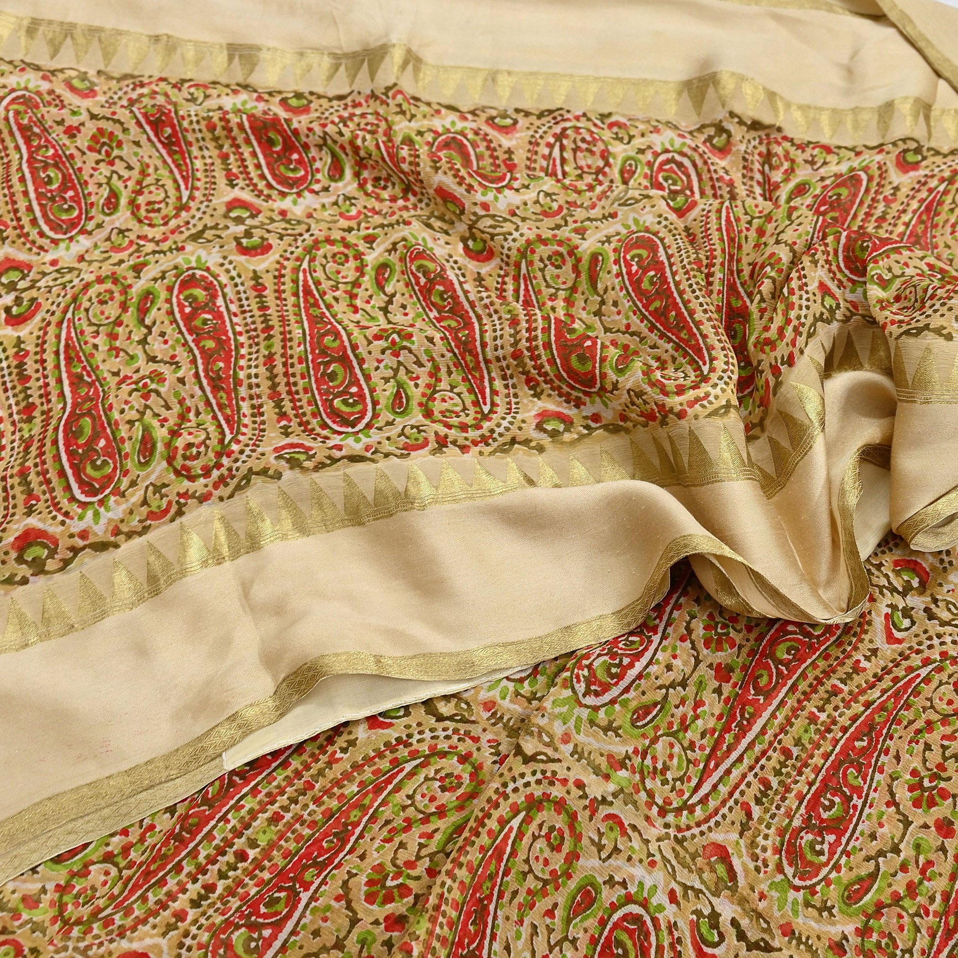 Women Vintage Sari Beige Pure Chiffon Silk Printed Saree Craft Fabric Sewing 5Yard Soft Light Dress Making Floral Zari