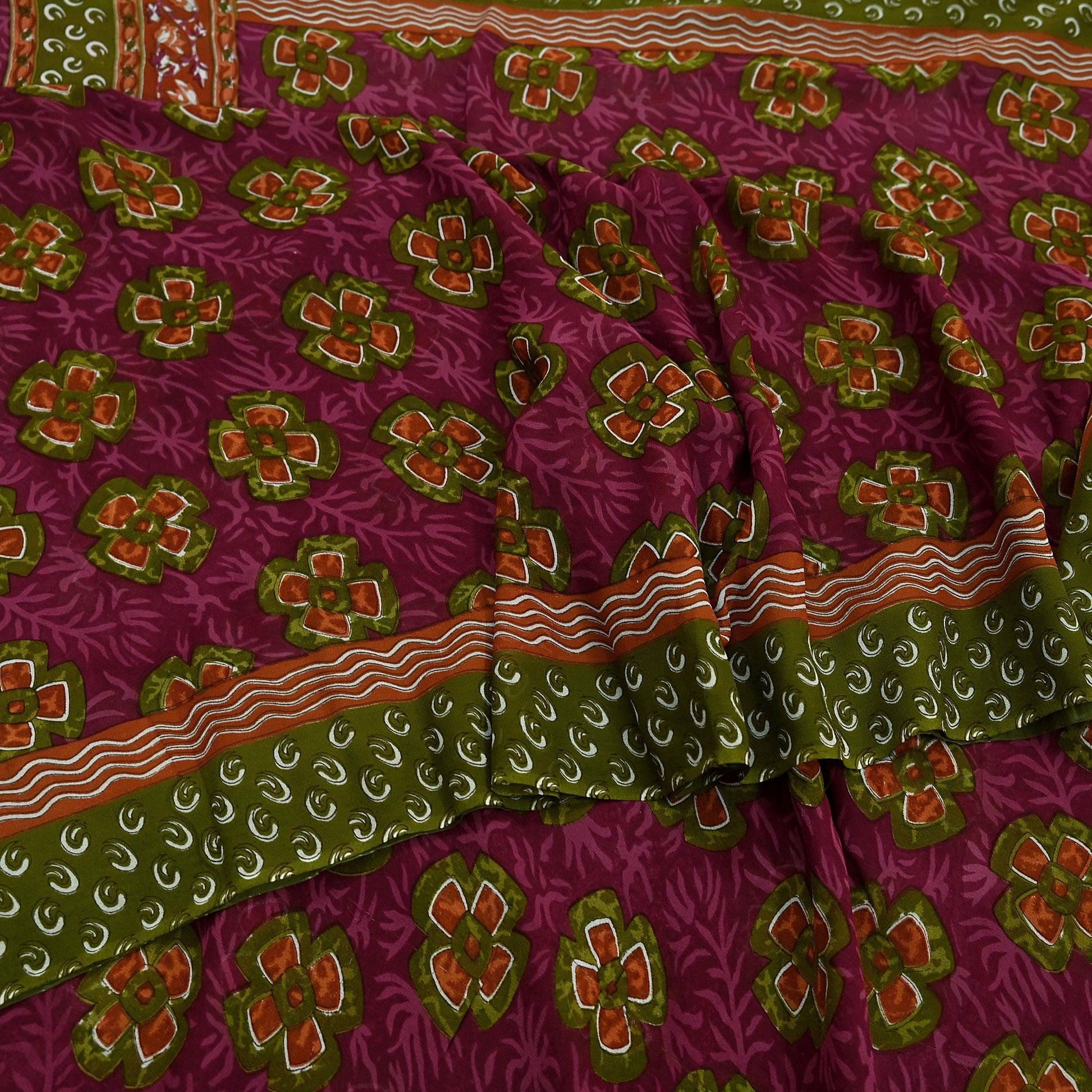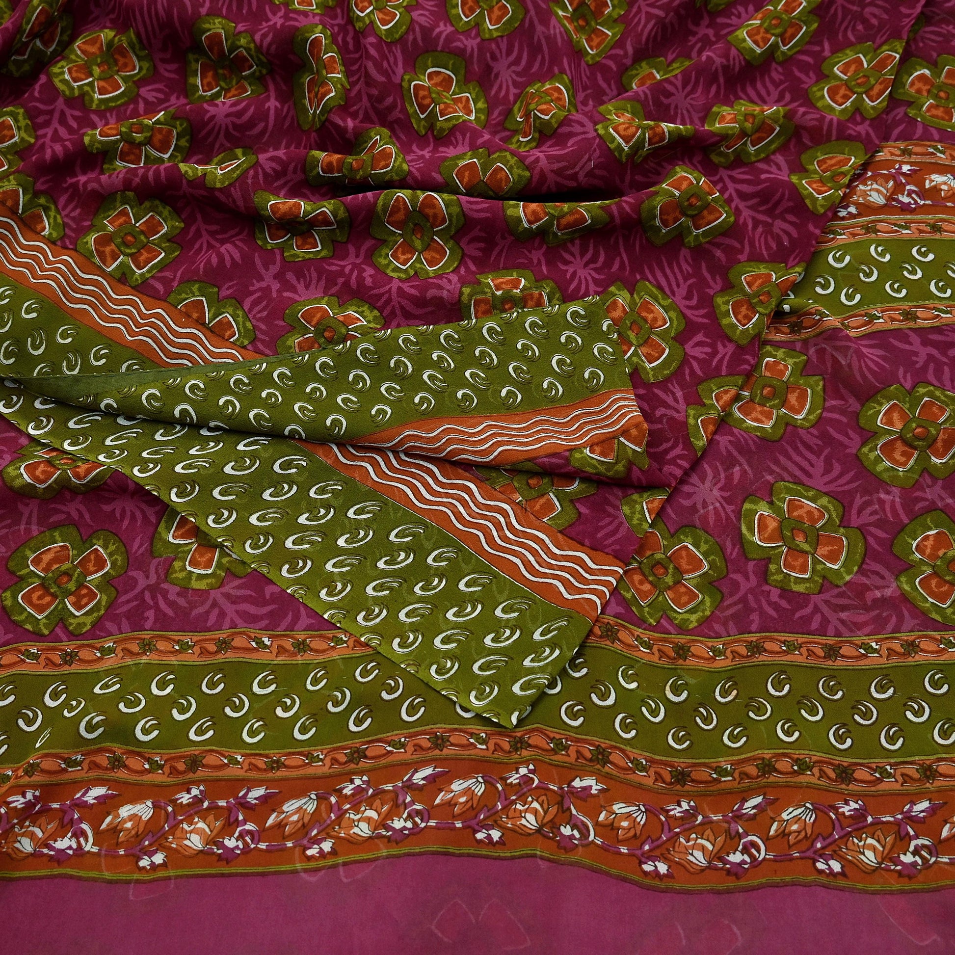 Women Vintage Sari Green & Pink Pure Georgette Silk Printed Saree Craft Fabric Sewing 5Yd Soft Light Dress Making Floral Quilting Upcycle