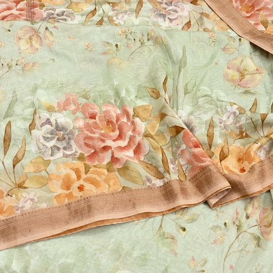 Indian Vintage Green Pure Chanderi Silk Saree Digital Printed Floral Zari Border 5 Yards Fabric for Sewing Christmas Crafts