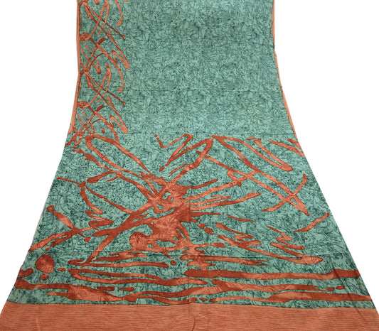 Indian Vintage Green & Orange Pure Crepe Silk Saree Floral Print 5 Yards Soft Sewing Fabric for Dressmaking, Quilting, Crafting Upcycling