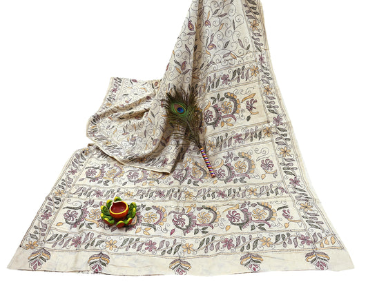 Indian Vintage Ivory Saree 100% Pure Silk Hand Embroidered Kantha Sari Fabric 5Yd Sewing Floral Sequin